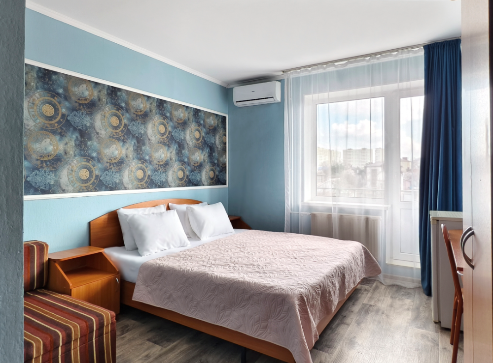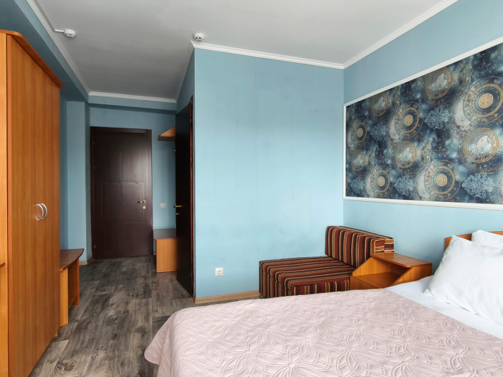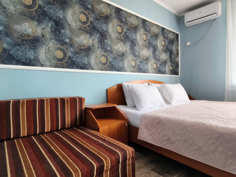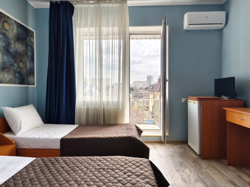 Вас ждут уютные и светлые номера, оснащенные всем необходимым для комфортного проживания: кондиционером, бесплатным Wi-Fi, телевизором, мини-холодильником, шкафом и собственной ванной комнатой. Также каждый номер с выходом на балкон.