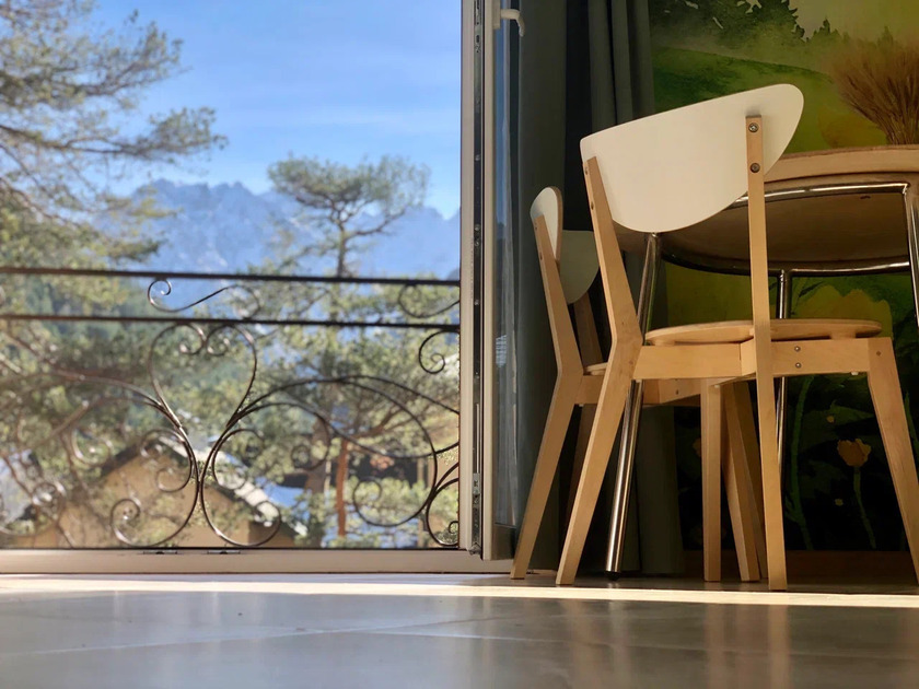 Балкон с головокружительным видом на заснеженные вершины гор.