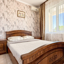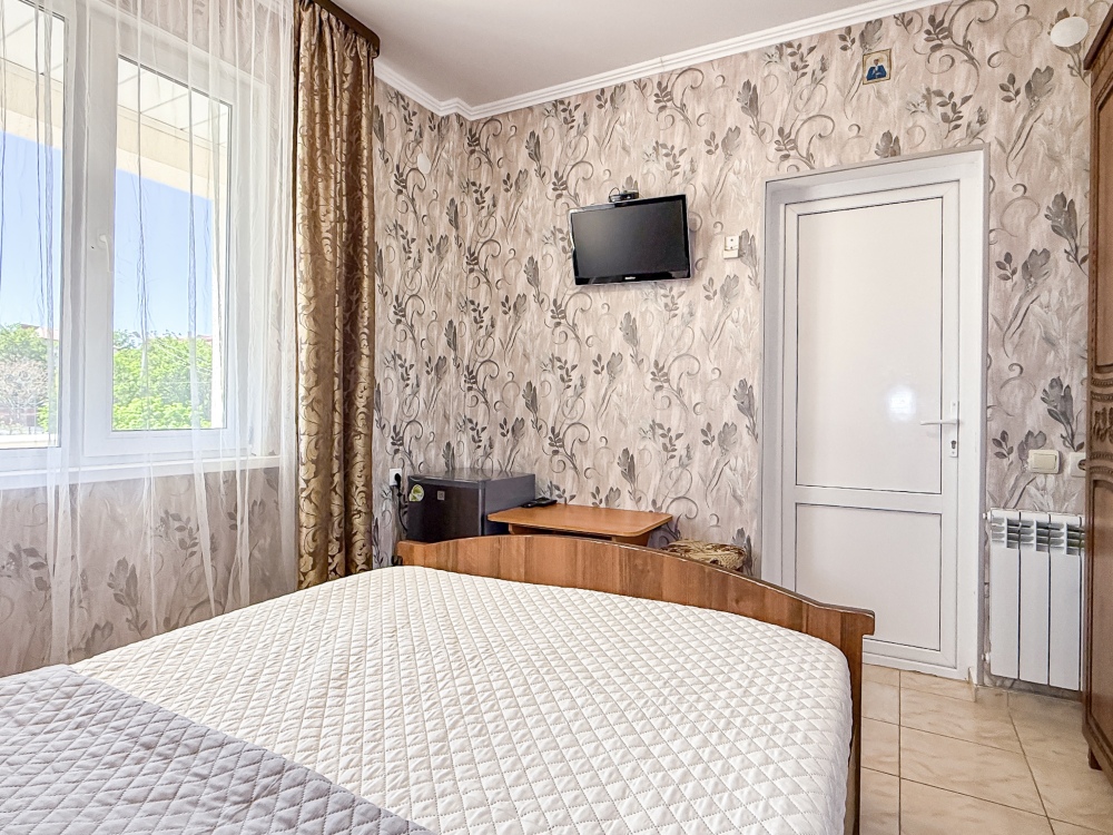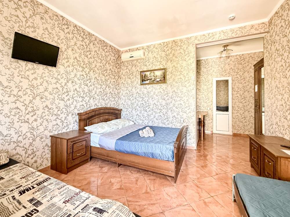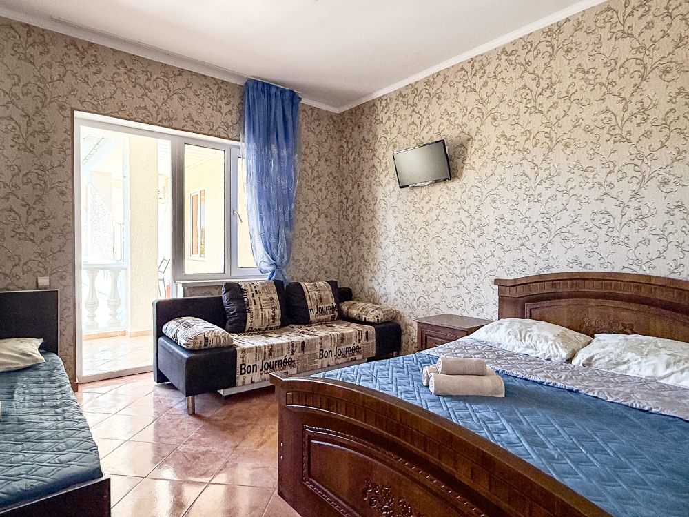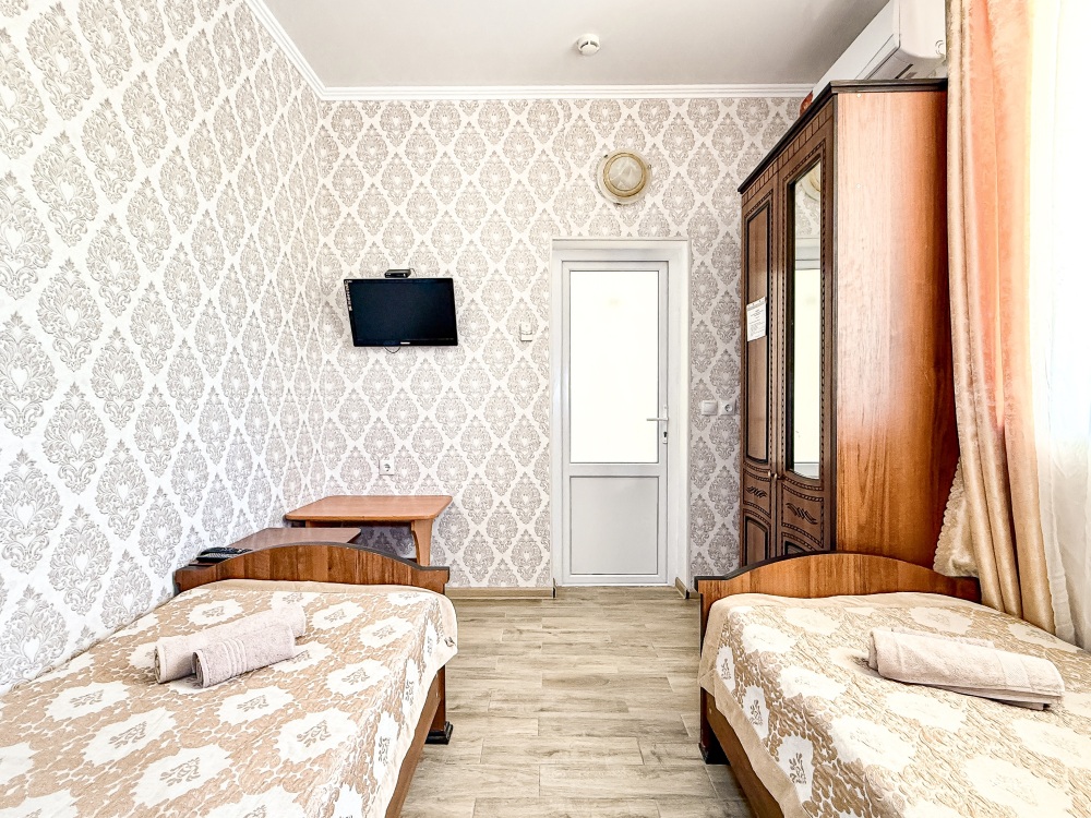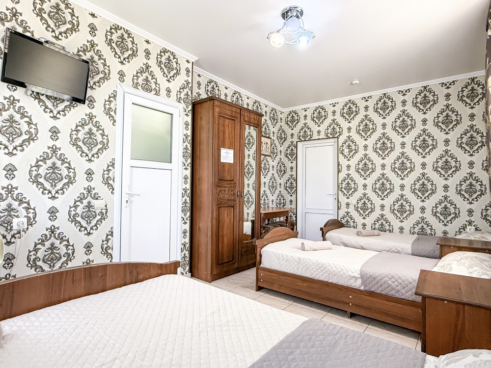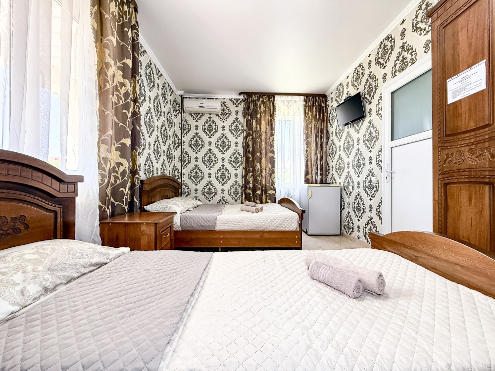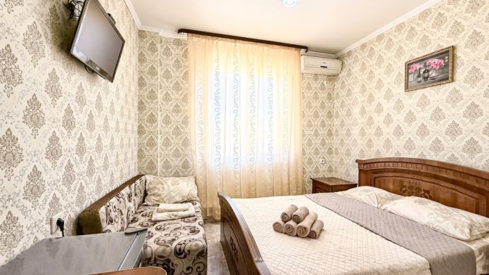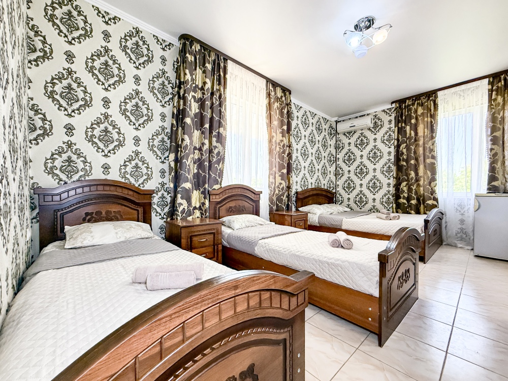 Гостевой дом занимает 3-этажное здание, где к услугам гостей 28 комфортабельных номеров, оснащенных всем необходимым для уютного проживания. В каждом номере есть кондиционер, жк телевизор, холодильник, стол со стульями и удобные кровати. А также собственная ванная комната с гигиеническими принадлежностями. С общей террасы 3 этажа открывается вид на море. Гладильная доска, утюг и сушилка для белья на этаже.