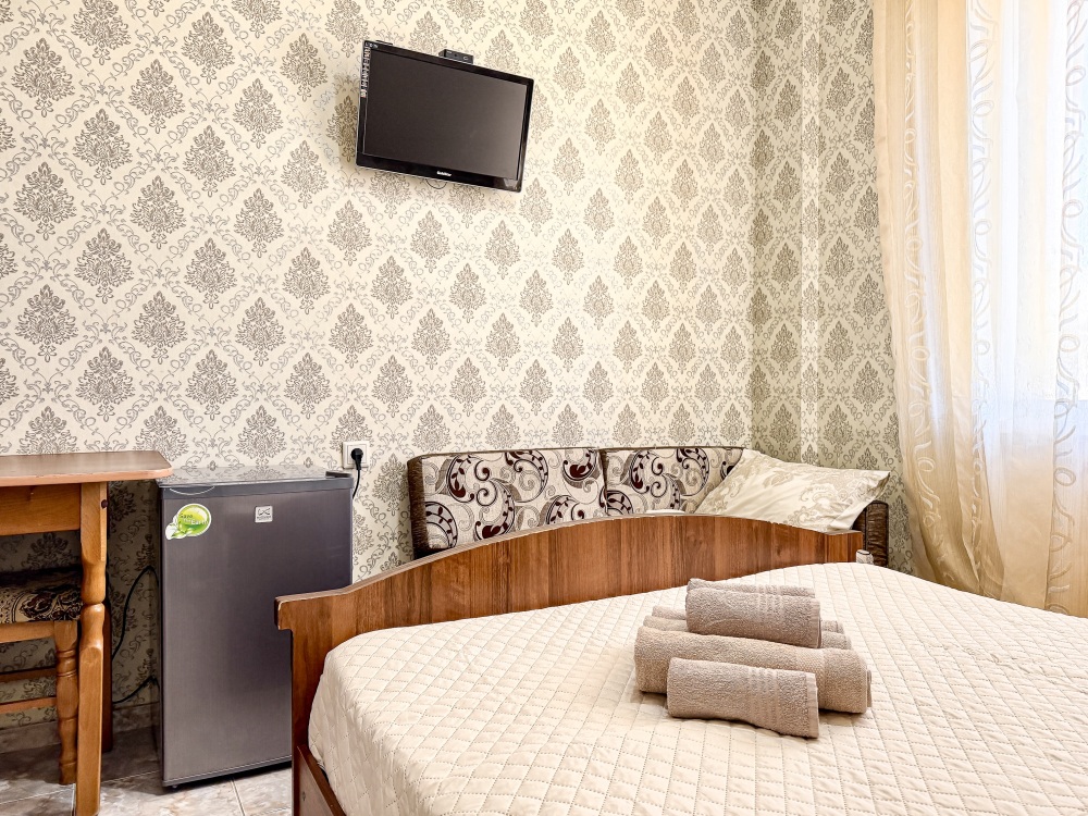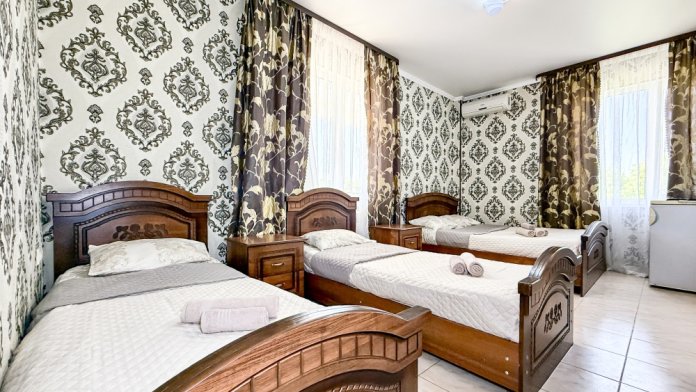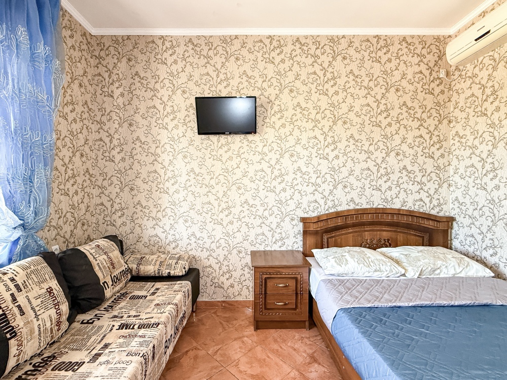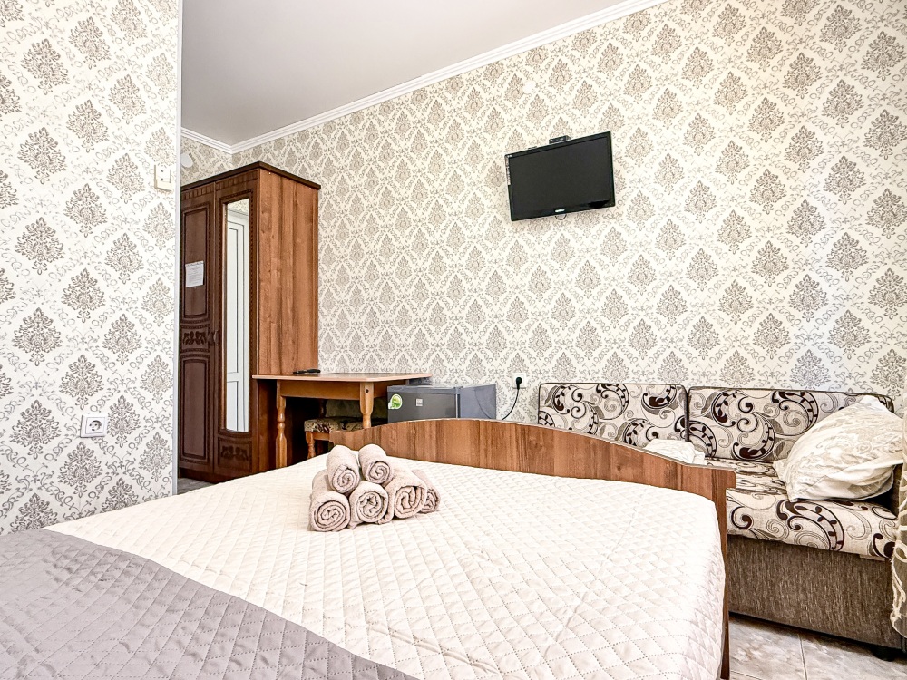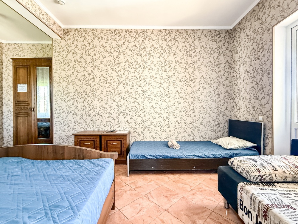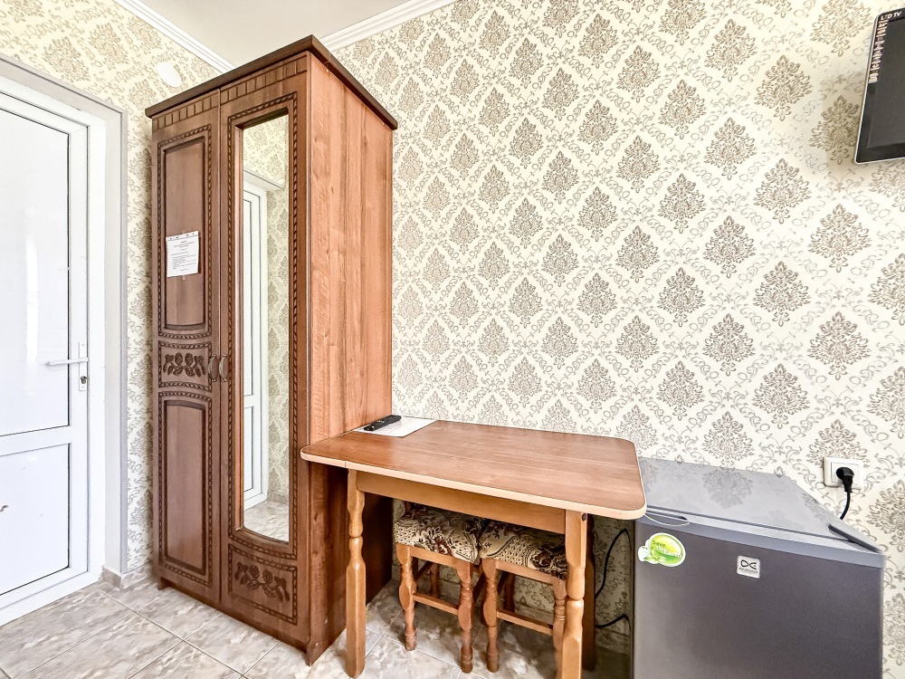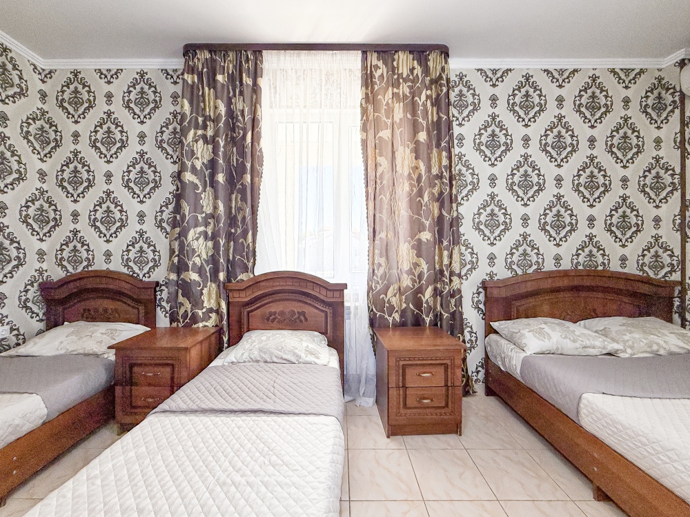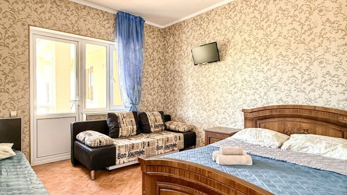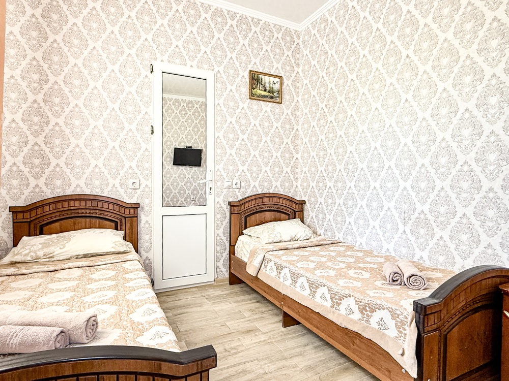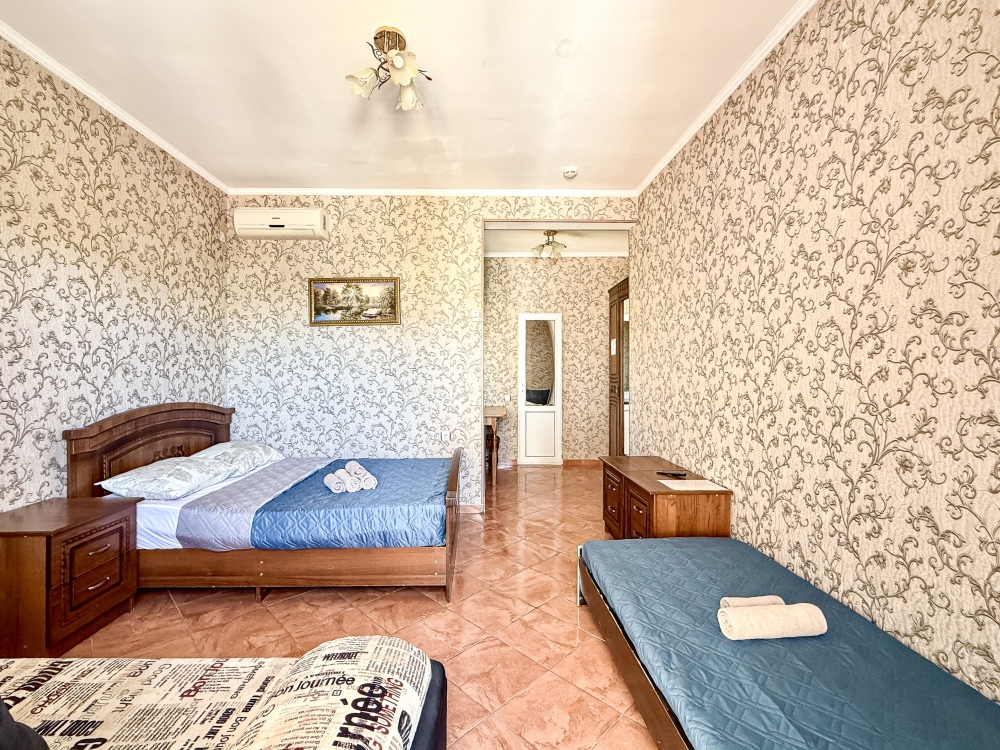 Гостевой дом занимает 3-этажное здание, где к услугам гостей 28 комфортабельных номеров, оснащенных всем необходимым для уютного проживания. В каждом номере есть кондиционер, жк телевизор, холодильник, стол со стульями и удобные кровати. А также собственная ванная комната с гигиеническими принадлежностями. С общей террасы 3 этажа открывается вид на море. Гладильная доска, утюг и сушилка для белья на этаже.