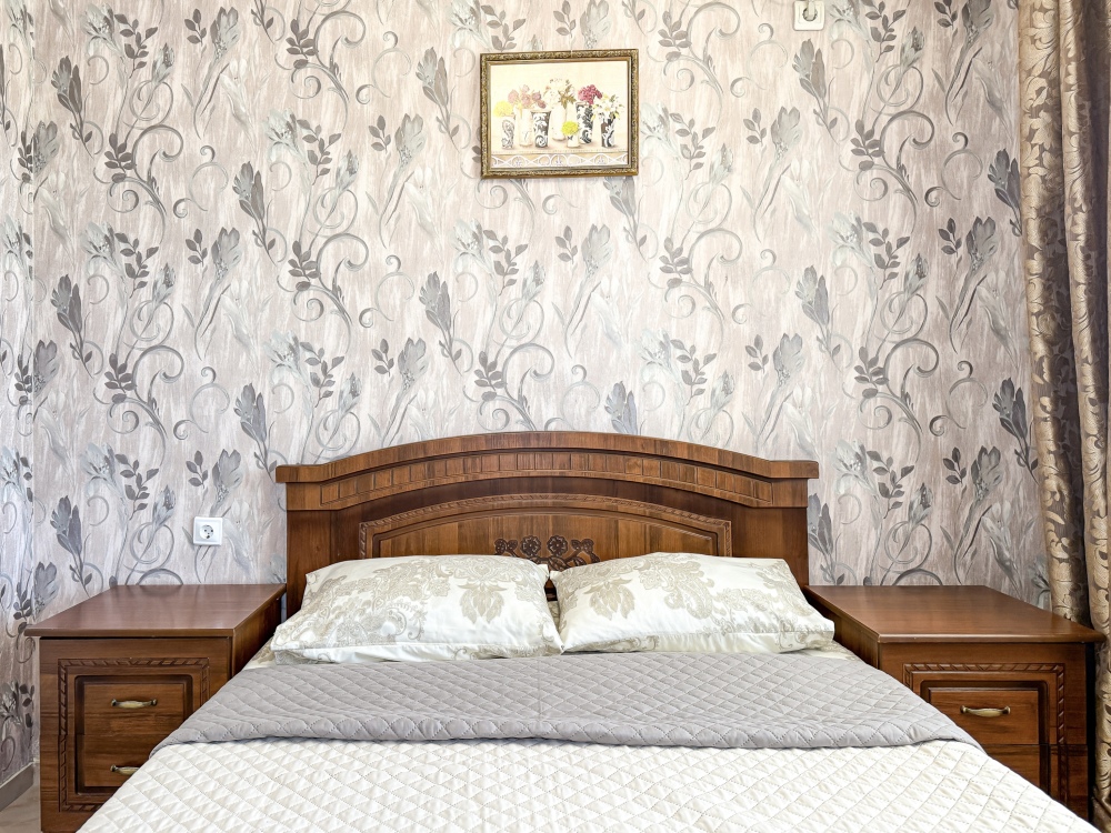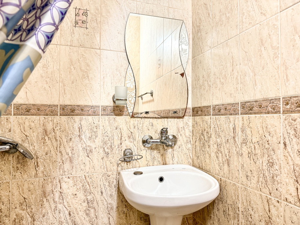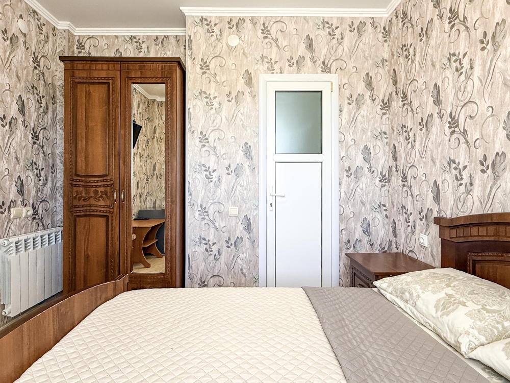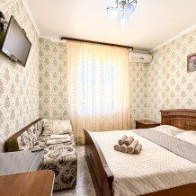 В номере: двуспальная кровать, односпальная кровать, диван-кровать, холодильник, телевизор, шкаф, стол, стулья, санузел с душевой и зеркалом.
