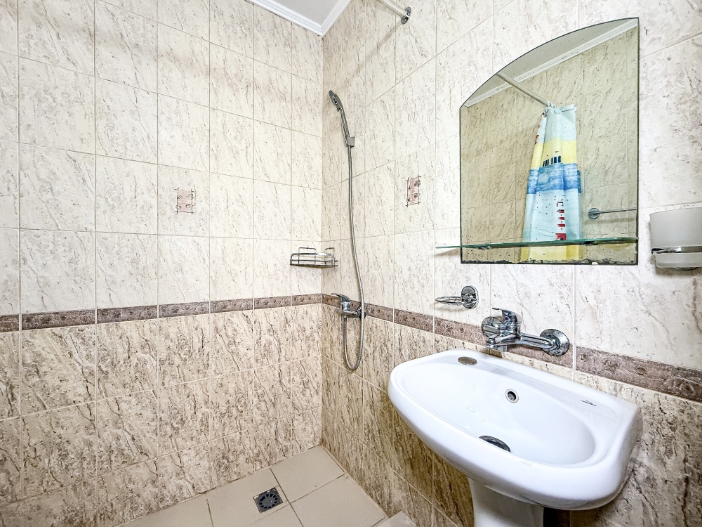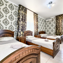 В номере: двуспальная кровать, 2 односпальные кровати, холодильник, телевизор, шкаф, стол, стулья, санузел с душевой и зеркалом.