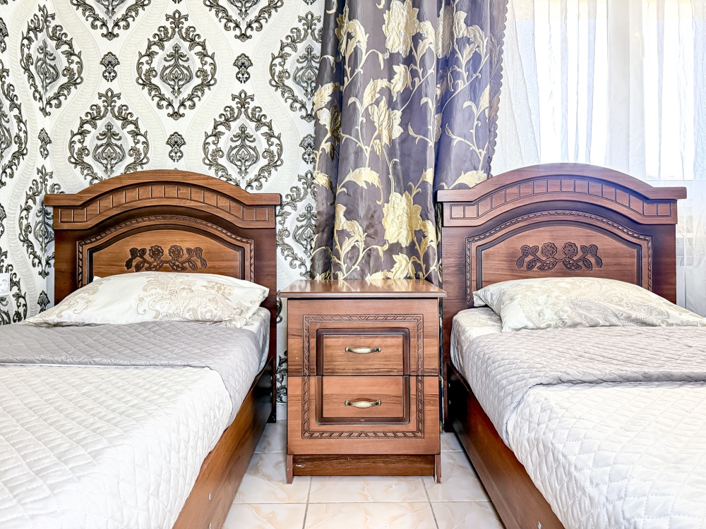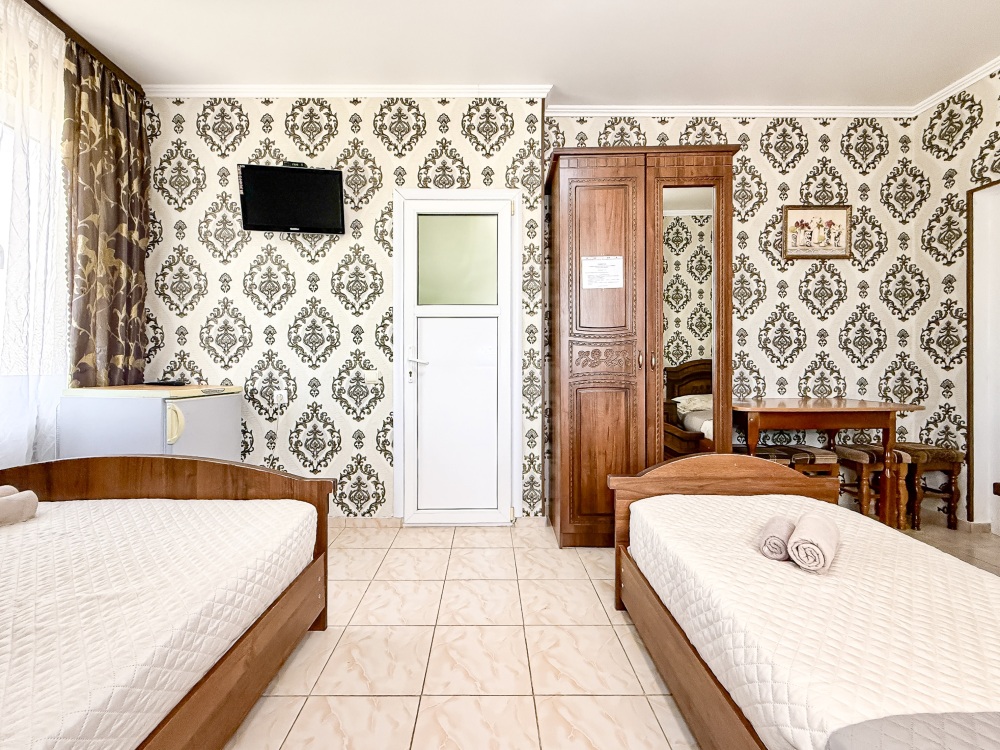 В номере: двуспальная и односпальная кровати, холодильник, телевизор, шкаф, стол, стулья, санузел с душевой и зеркалом.