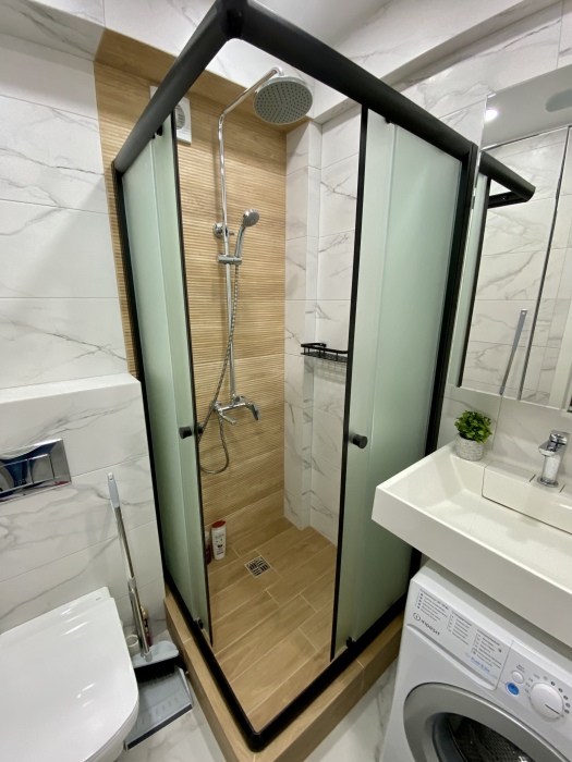 В ванной комнате унитаз, душевая кабина, раковина.