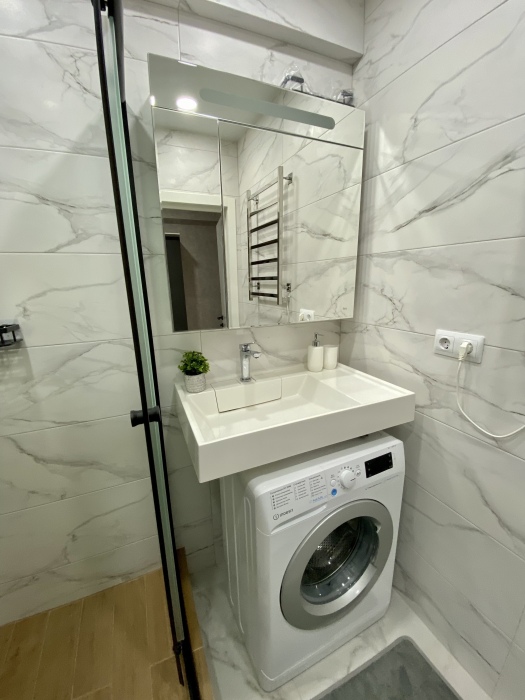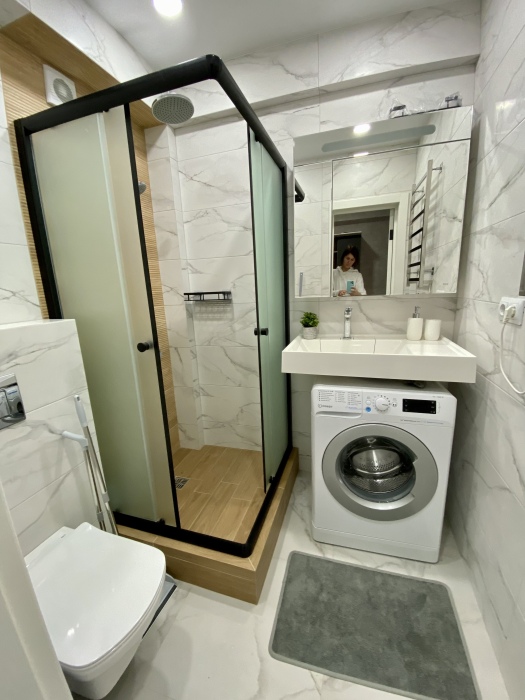 Из техники: кондиционер, стиральная машина, холодильник, микроволновая печь, электрочайник, смарт телевизор, фен , утюг, гладильная доска, сушилка для белья.