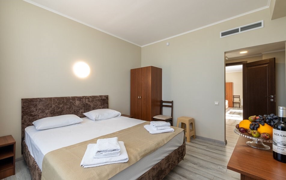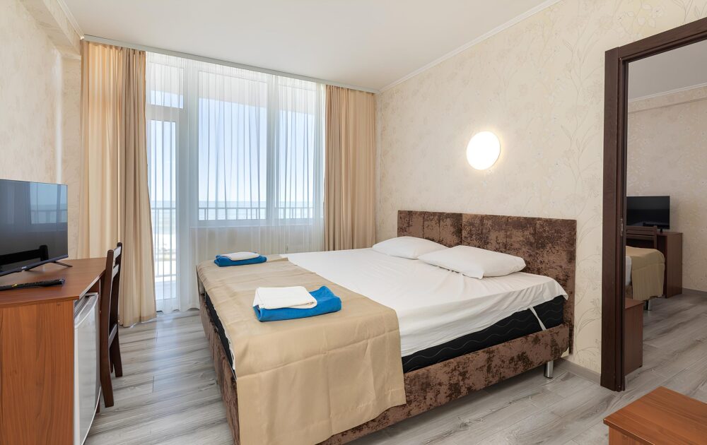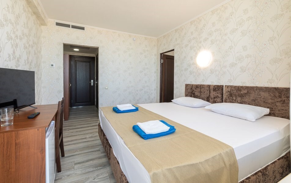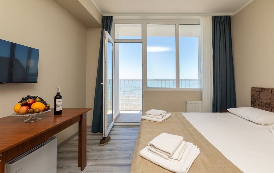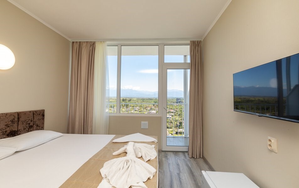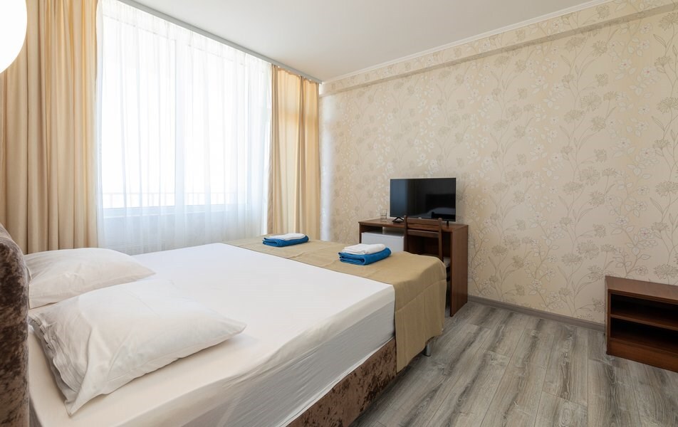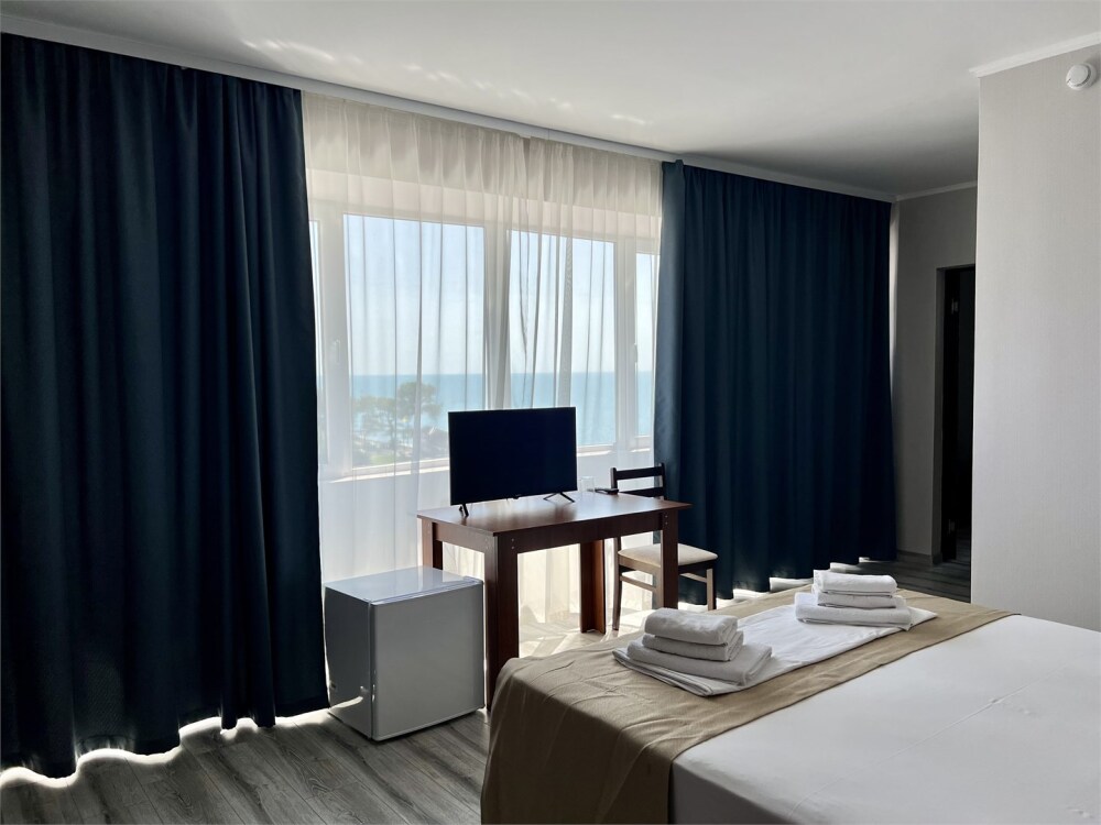 Номер: оборудован двуспальной кроватью, прикроватными тумбочками, чемоданницей, столом, стулом, шкафом, телевизором, холодильником, санузлом с душем. Из номера открывается вид на горы и море благодаря панорамным окнам.