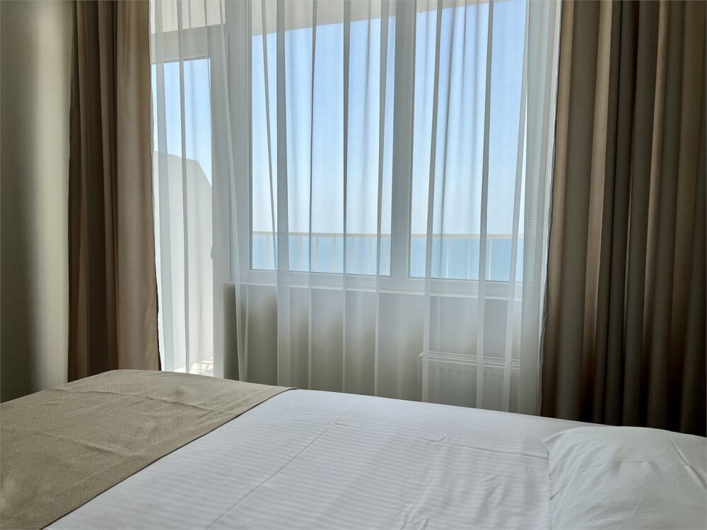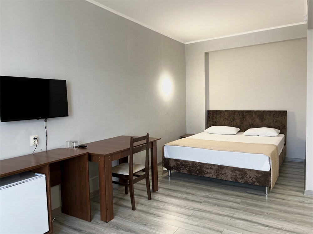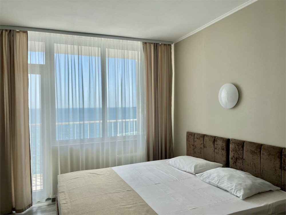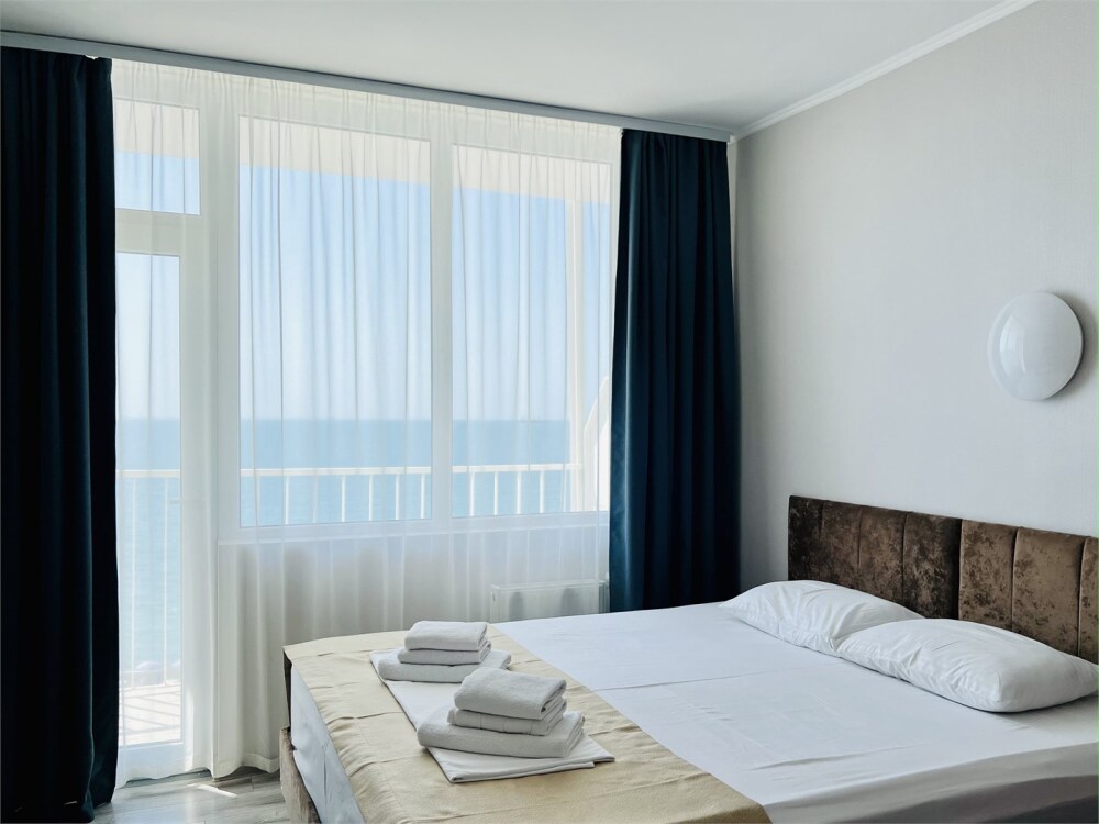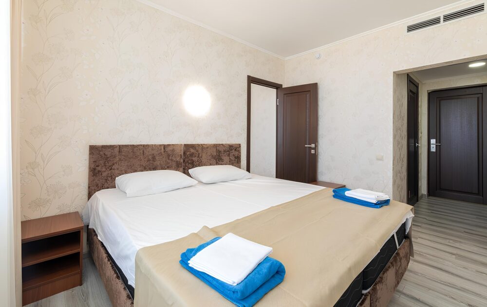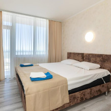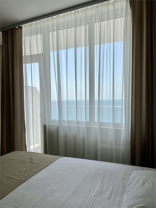 Номер: оборудован двуспальной кроватью, прикроватными тумбочками, чемоданницей, столом, стулом, шкафом, телевизором, холодильником, санузлом с душем. Из номера открывается вид на горы и море благодаря панорамным окнам.