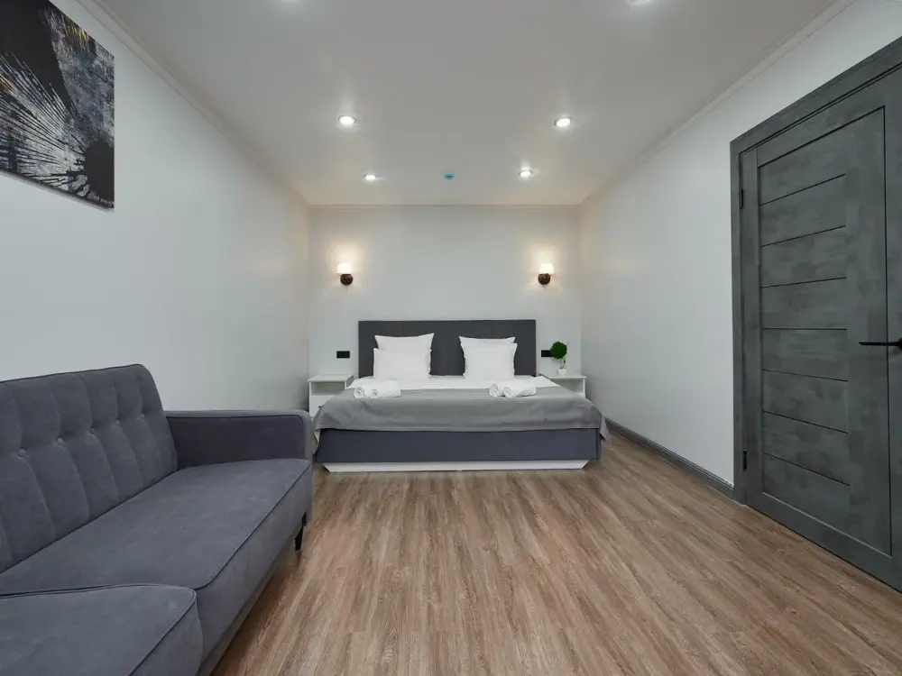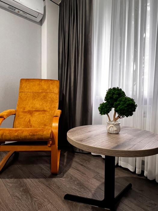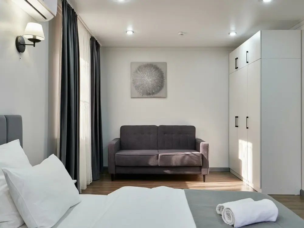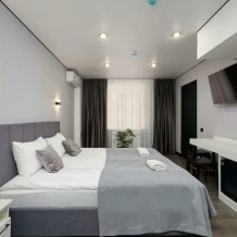 Номер подойдет для размещения 2-3 человек. Спальные места: двуспальная кровать, раскладной диван. Также в качестве дополнительного места может предоставляться кресло-кровать. Имеется все необходимое для комфортного проживания: WI-FI и TV, чайник, холодильник, санузел с душевой. По предварительному запросу бесплатно предоставляются детская кроватка до 3-х лет и стульчик для кормления. Постельное белье, полотенца и средства личной гигиены: шампунь, кондиционер, гель для душа предоставляются.