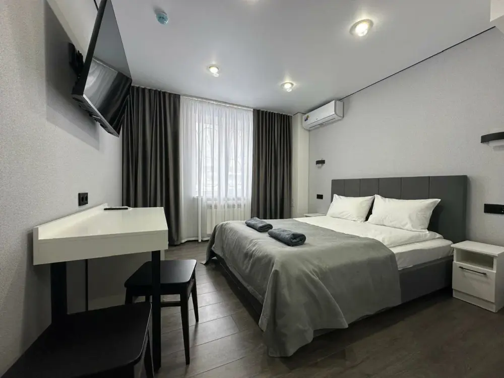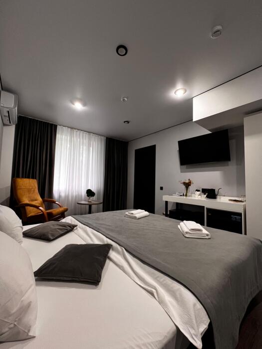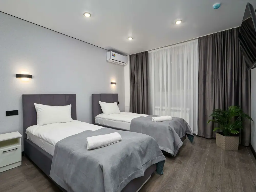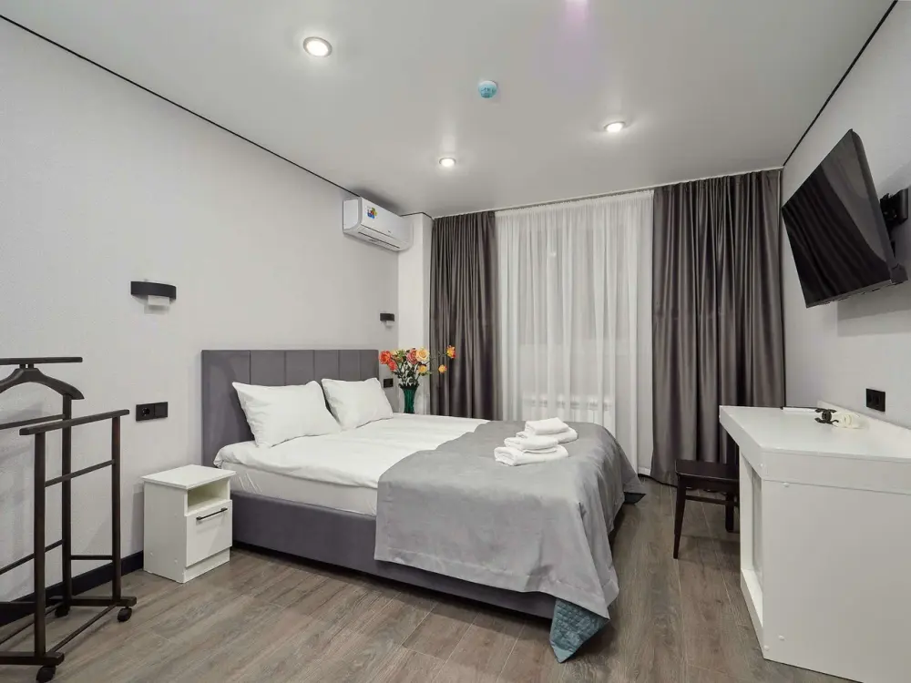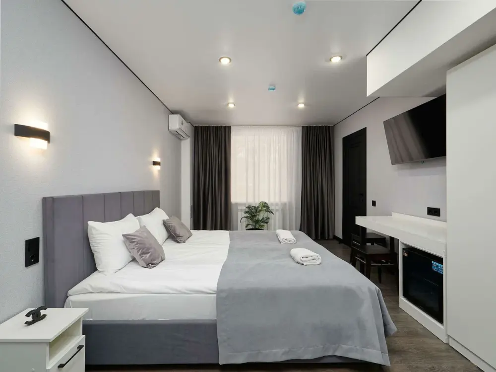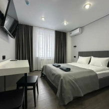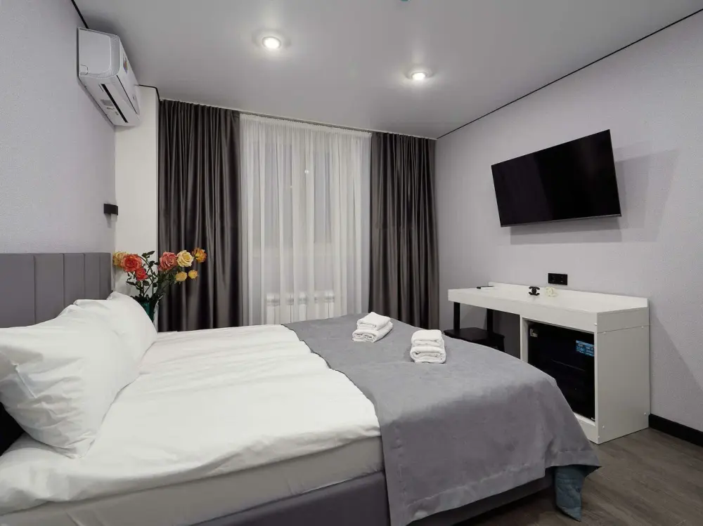 Каждый наш номер с хорошей звукоизоляцией располагает всеми удобствами для комфортного времяпрепровождения. В распоряжении гостей телевизор с плоским экраном, письменный стол, удобная кровать, шкаф для одежды, холодильник. Ванная комната оснащена всеми необходимым. Постельное белье, полотенца и средства личной гигиены: шампунь, кондиционер, гель для душа предоставляются. По предварительному запросу бесплатно предоставляются детская кроватка до 3-х лет и стульчик для кормления.