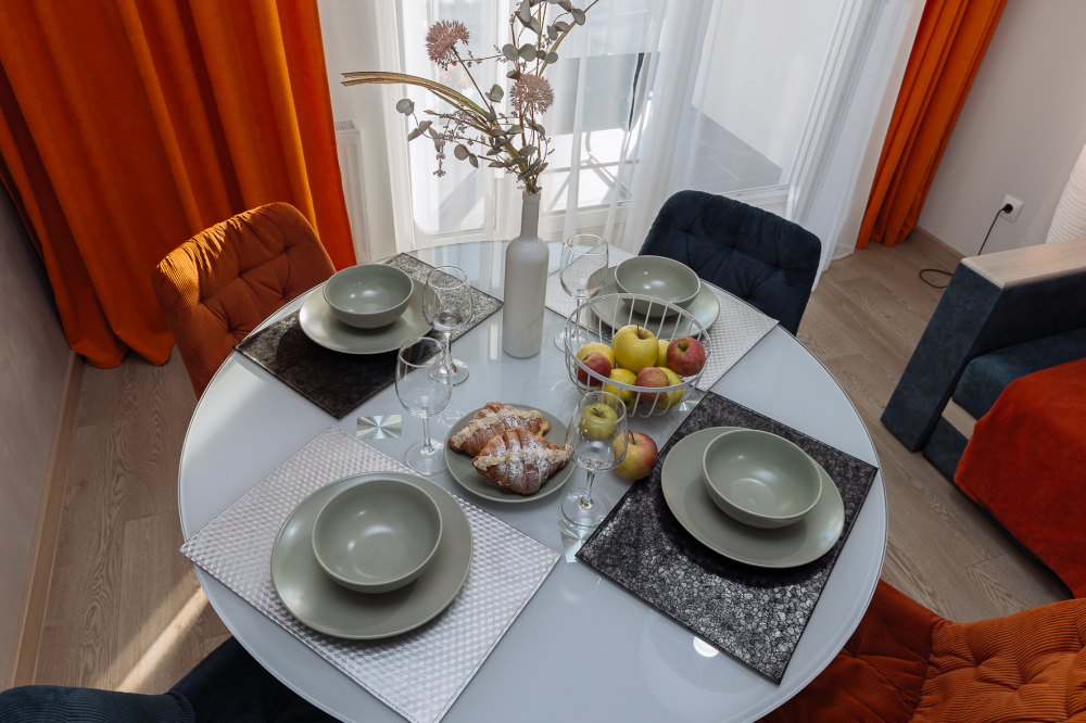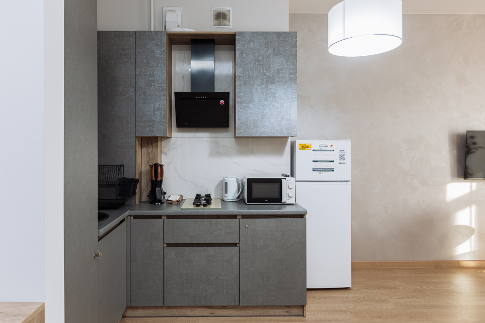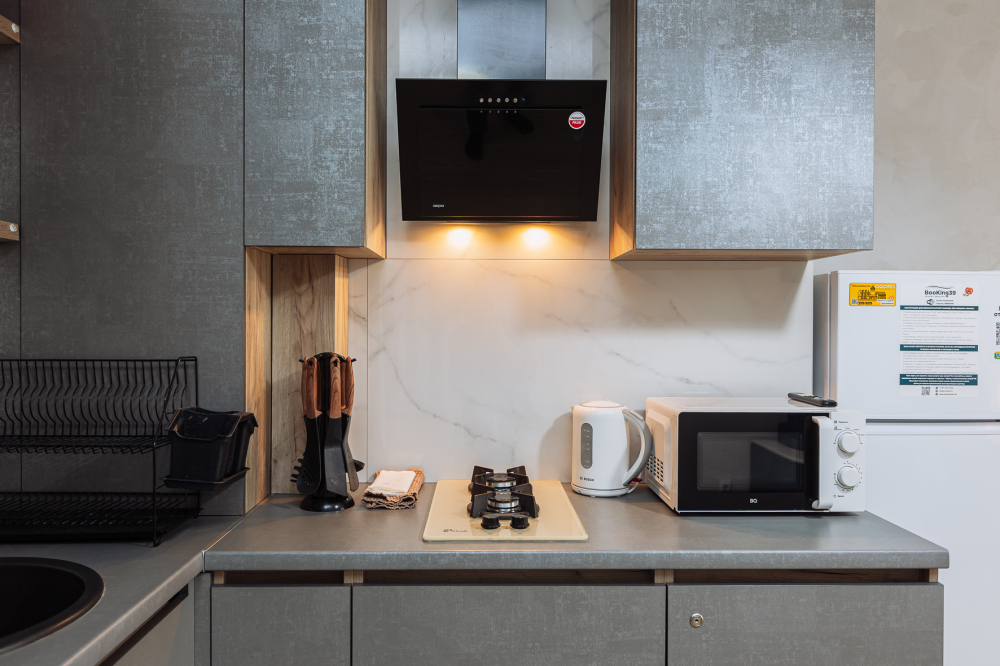 -️ На кухне Вы найдете все необходимое для приготовления еды: посуда, столовые приборы, кастрюли и сковородки, микроволновка, холодильник, чайник, духовка и индукционная плита.