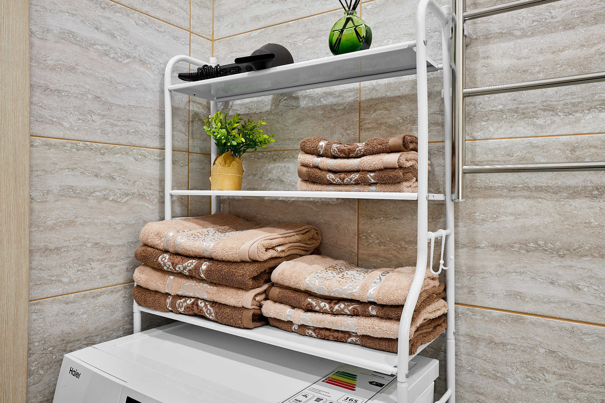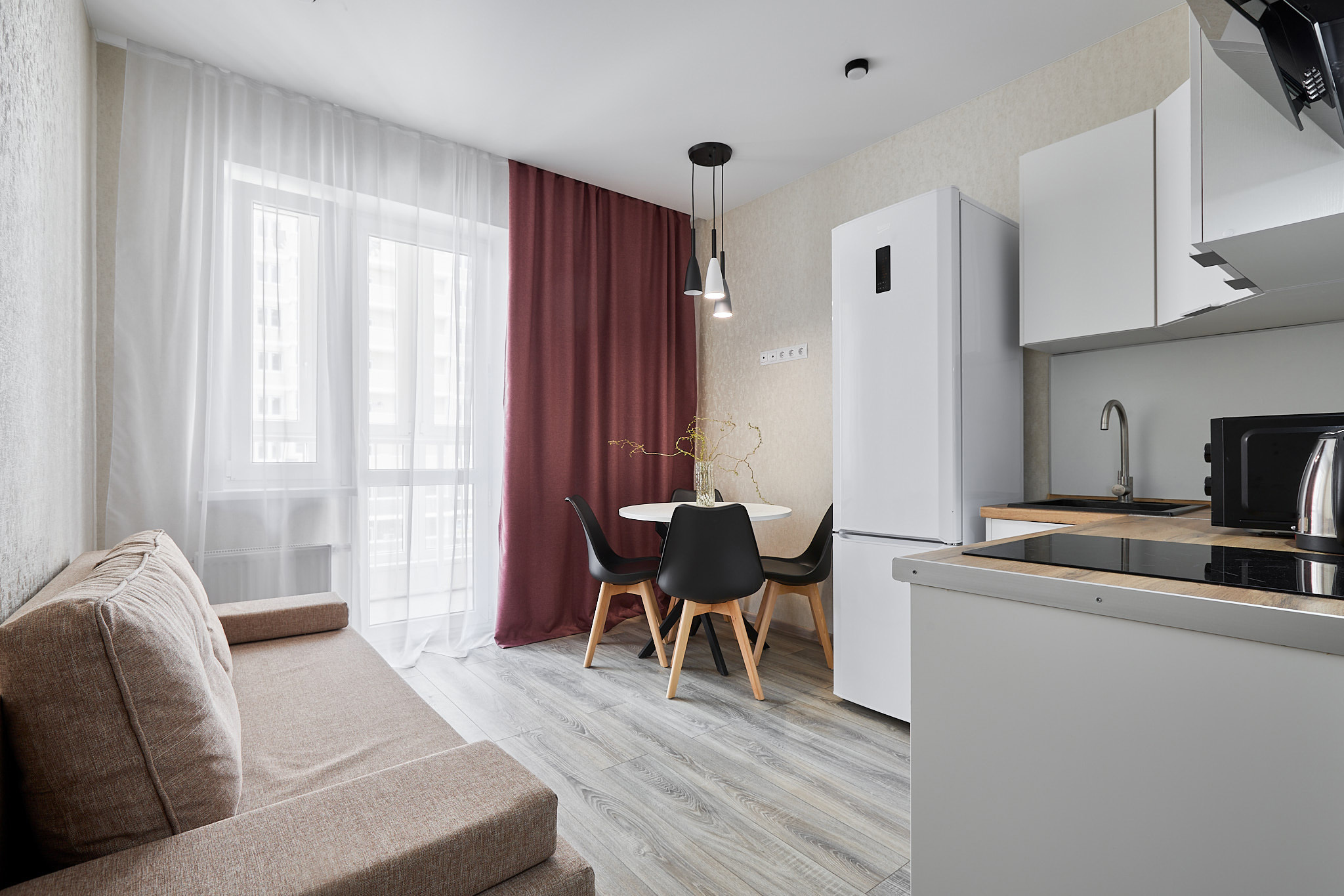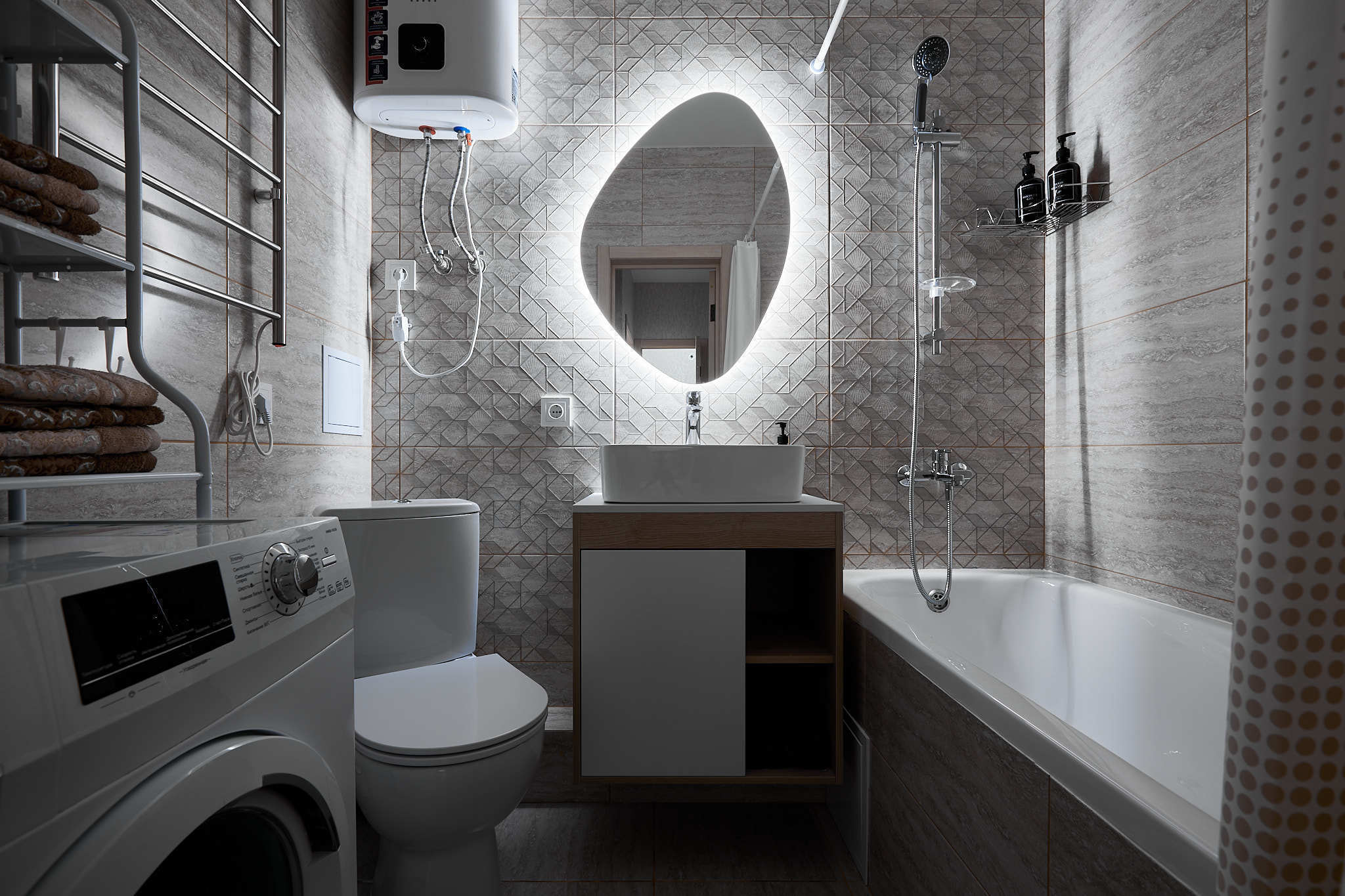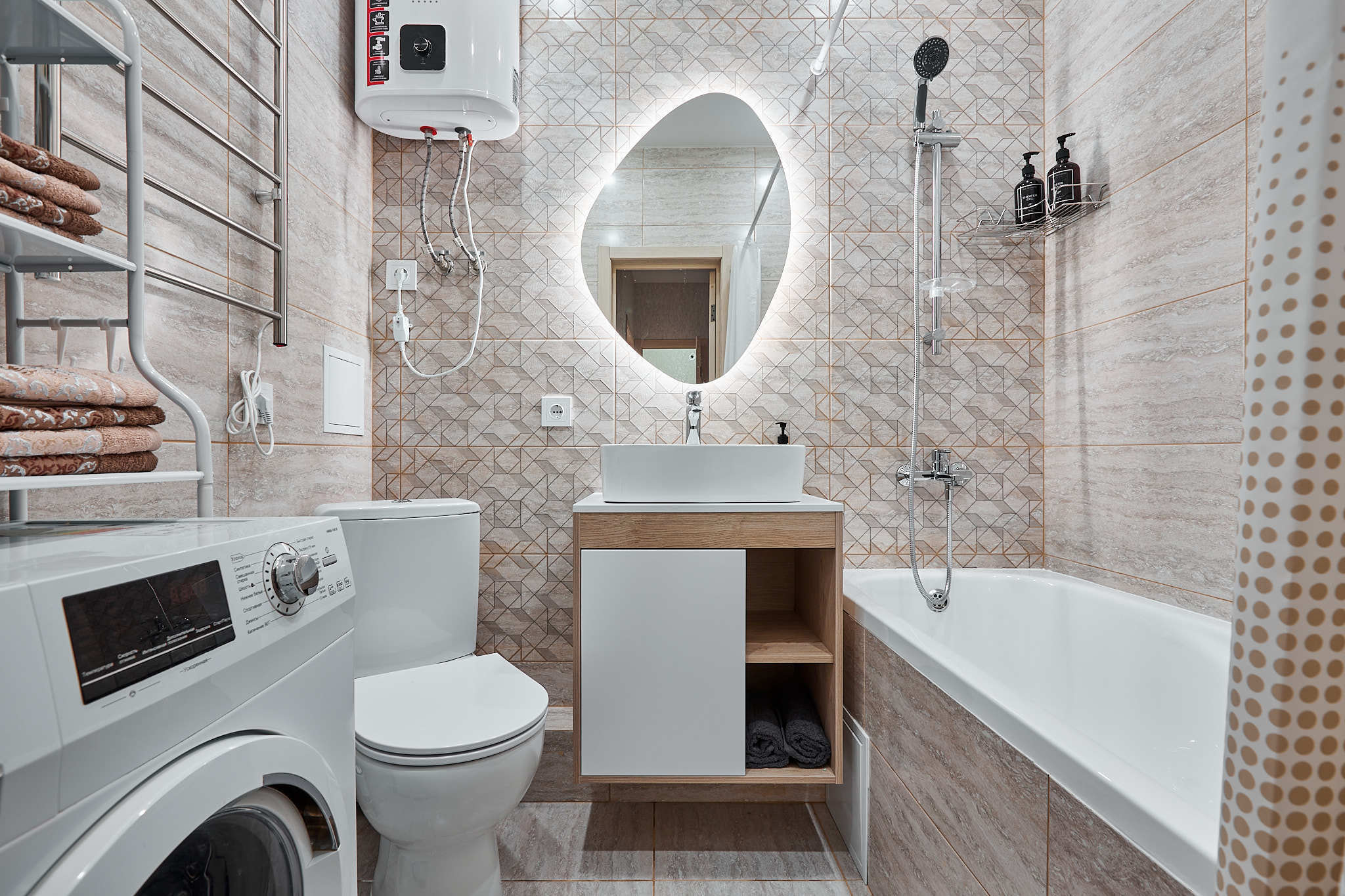 В квартире есть все необходимое для проживания: стиральная машина, сушилка для белья, гладильная доска, утюг, фен. Набор посуды, столовые приборы, сковорода, кастрюли, чайник, микроволновая печь.