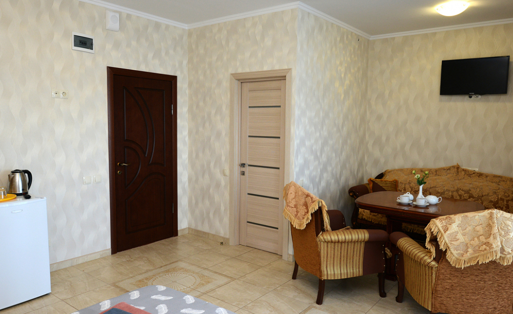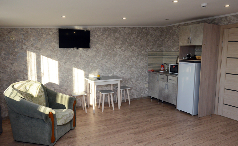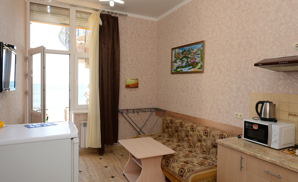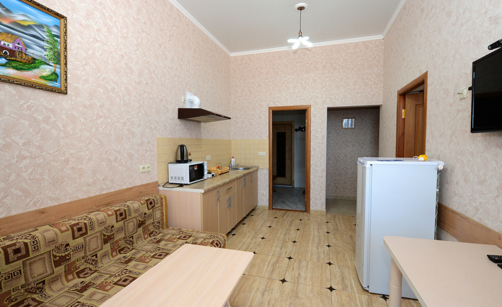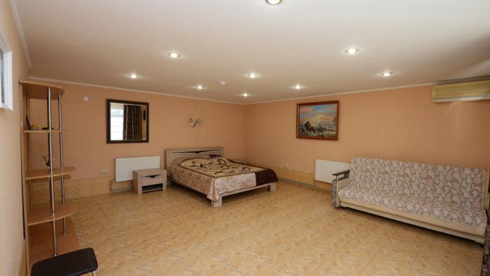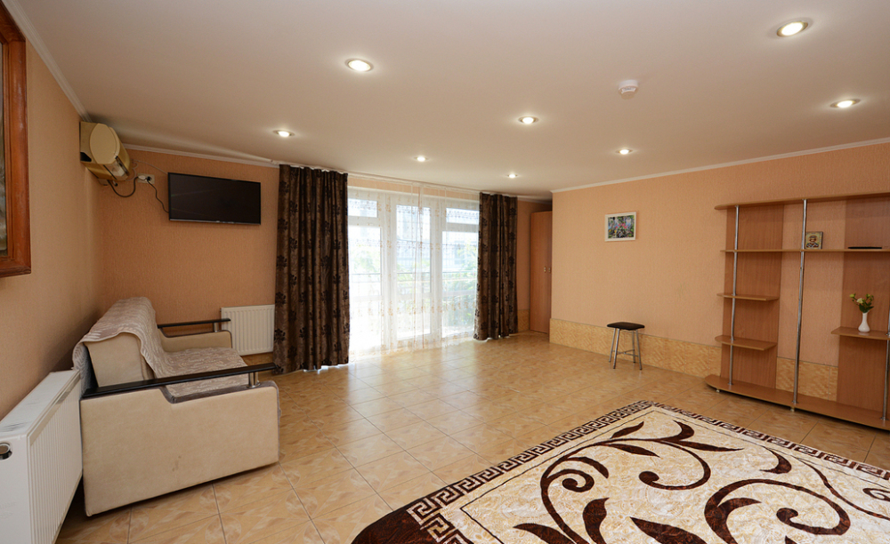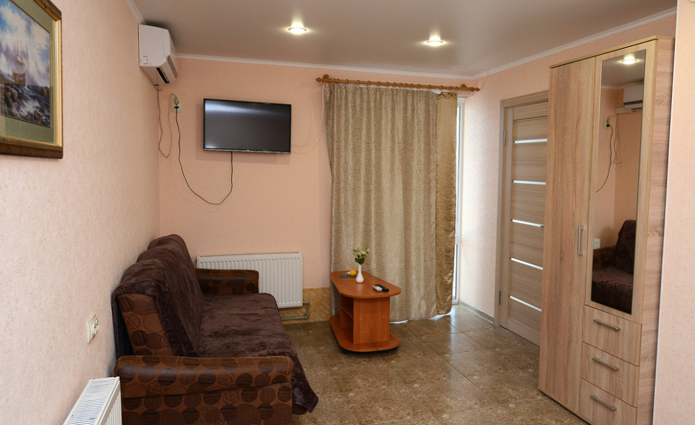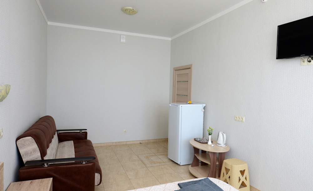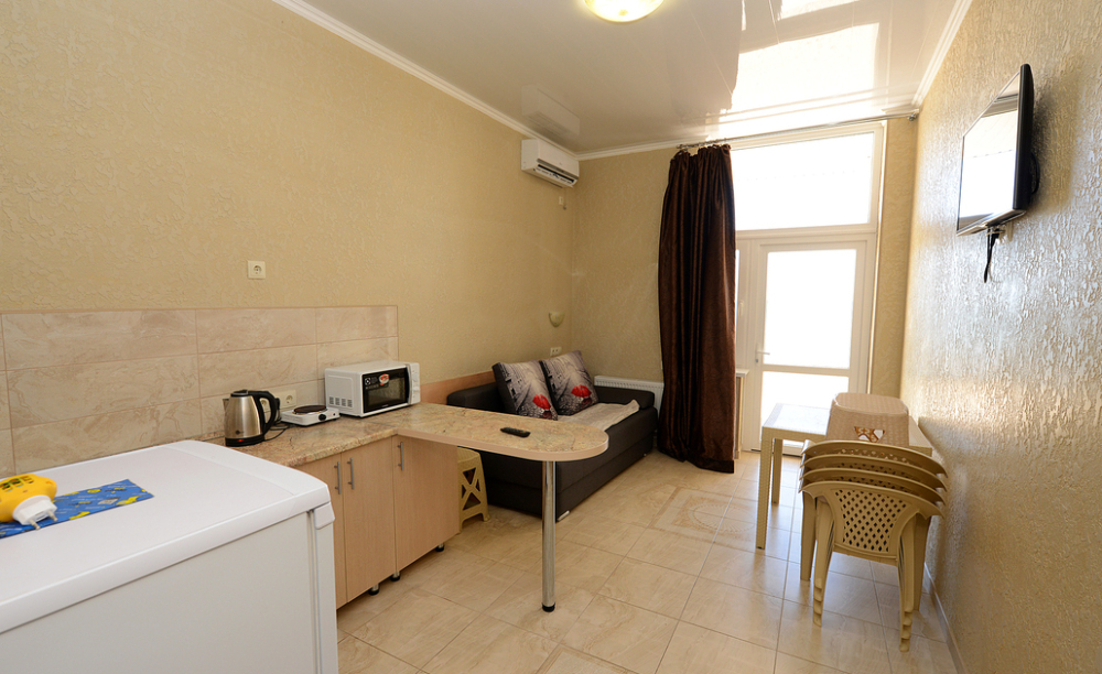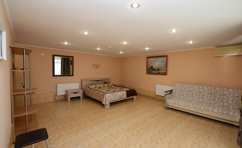 Спальные места: двуспальная кровать, двуспальный диван. В этой комнате есть все для удобного отдыха: своя кухня, посуда, микроволновая печь, индукционная плита на 2 конфорки, холодильник, электрочайник, кондиционер, плазменный телевизор, санузел с душем, фен, шкаф. Большая терраса добавляет дополнительный комфорт этой комнате. Комната этой категории находится на 1 этаже с выходом на море и на мансардном этаже.