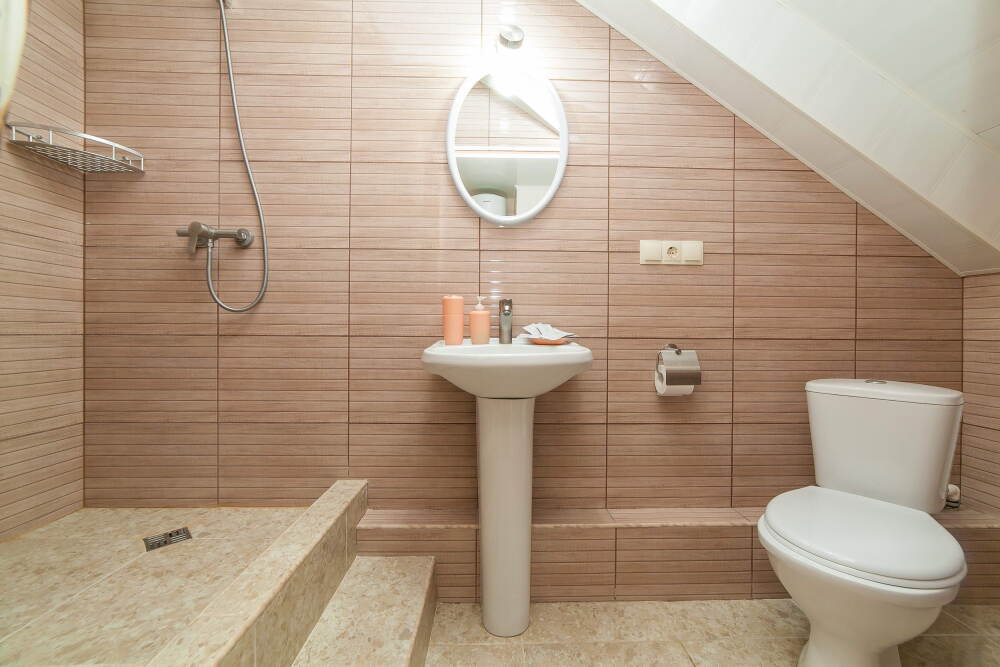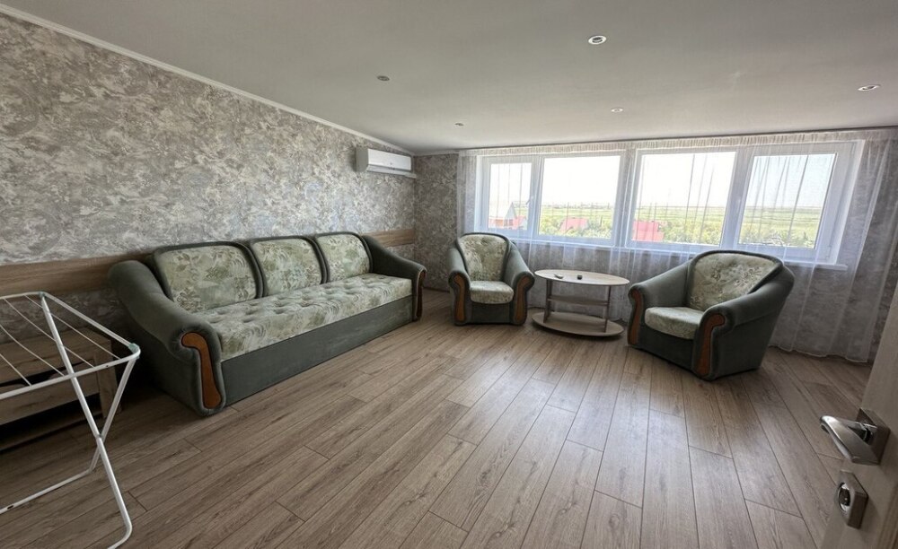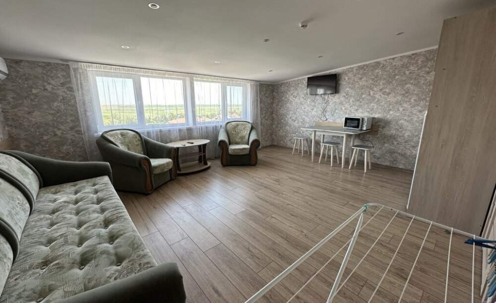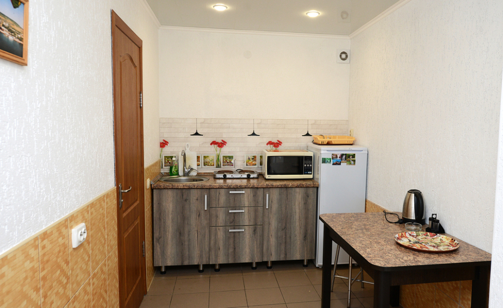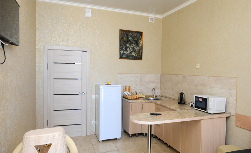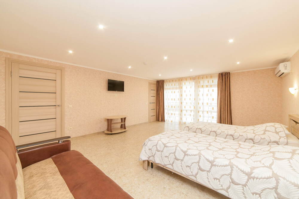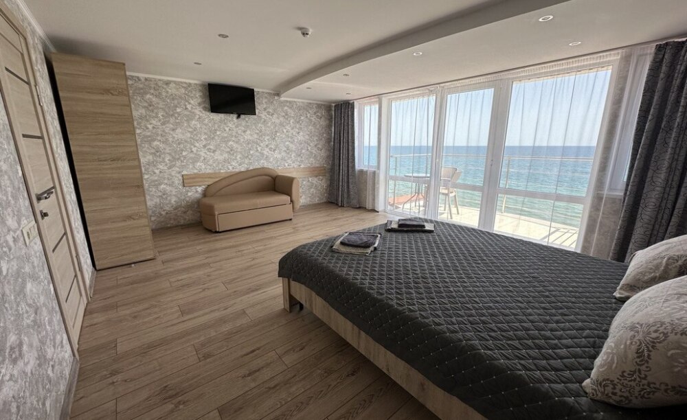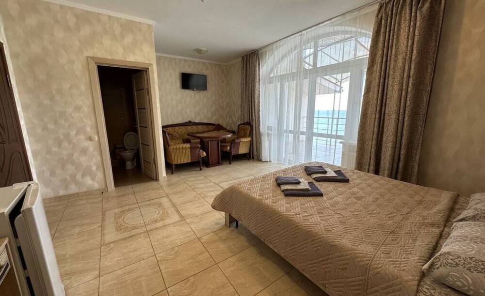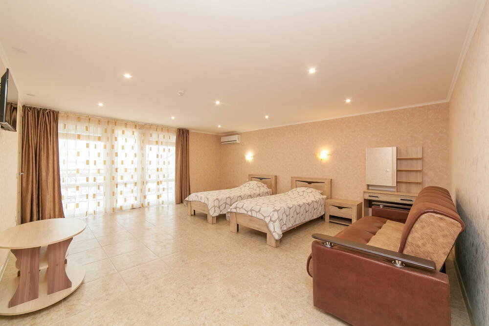 Спальные места: двуспальная кровать, двуспальный диван. В этой комнате есть все для удобного отдыха: своя кухня, посуда, микроволновая печь, индукционная плита на 2 конфорки, холодильник, электрочайник, кондиционер, плазменный телевизор, санузел с душем, фен, шкаф. Большая терраса добавляет дополнительный комфорт этой комнате. Комната этой категории находится на 1 этаже с выходом на море и на мансардном этаже.