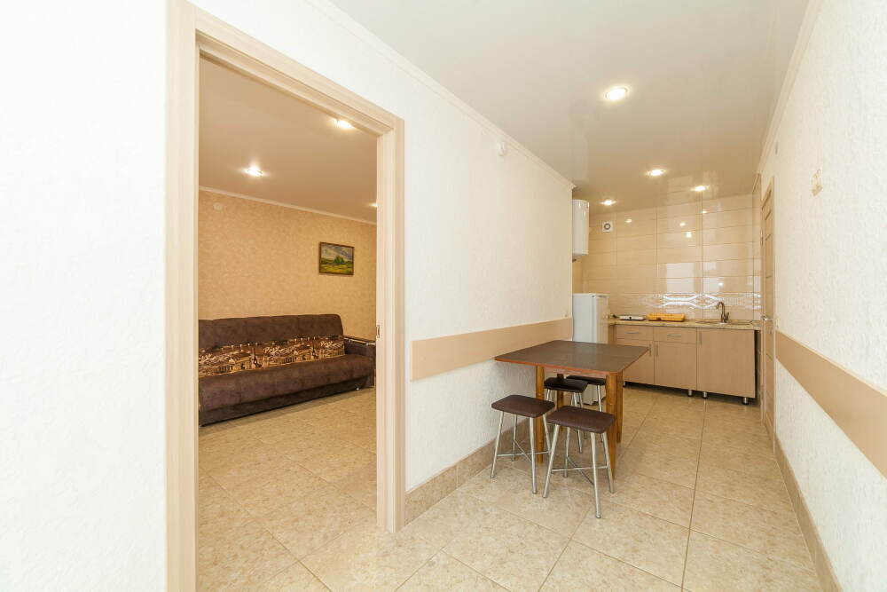 Двухкомнатные апартаменты вместимостью 6 человек. Спальные места: двуспальная кровать, 2 двуспальных дивана. Есть все для удобного отдыха: своя кухня, посуда, микроволновая печь, индукционная плита на 2 конфорки, холодильник, электрочайник, кондиционер, плазменный телевизор, санузел с душем, фен, шкаф. Возможно пользование сауной за дополнительную плату. Находится на 1 этаже с выходом на прекрасный песчаный пляж. Большая терраса добавляет дополнительный комфорт этой комнате.