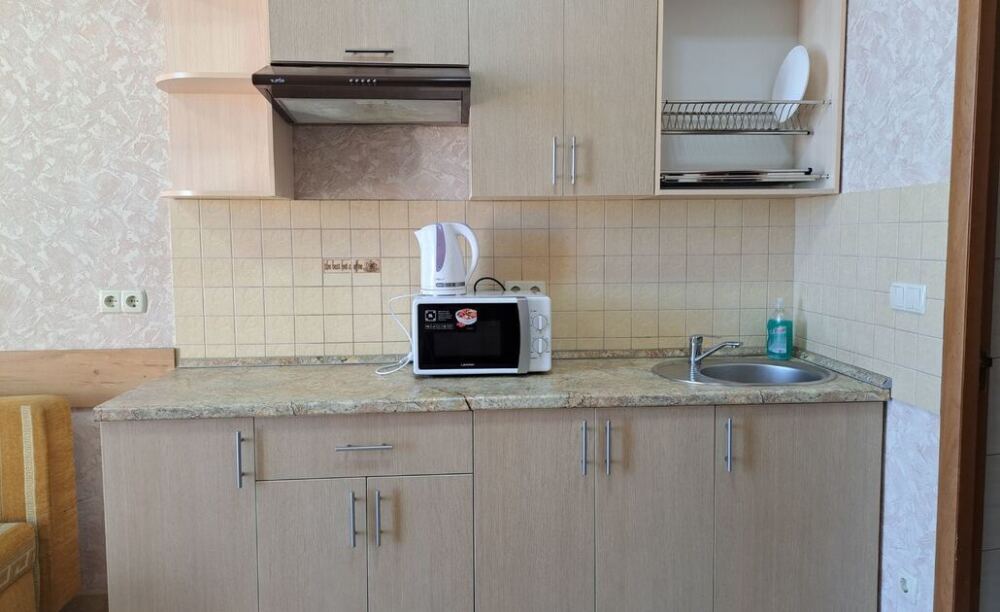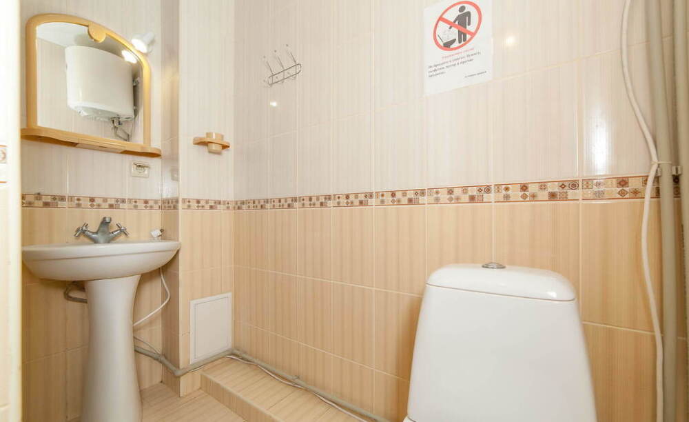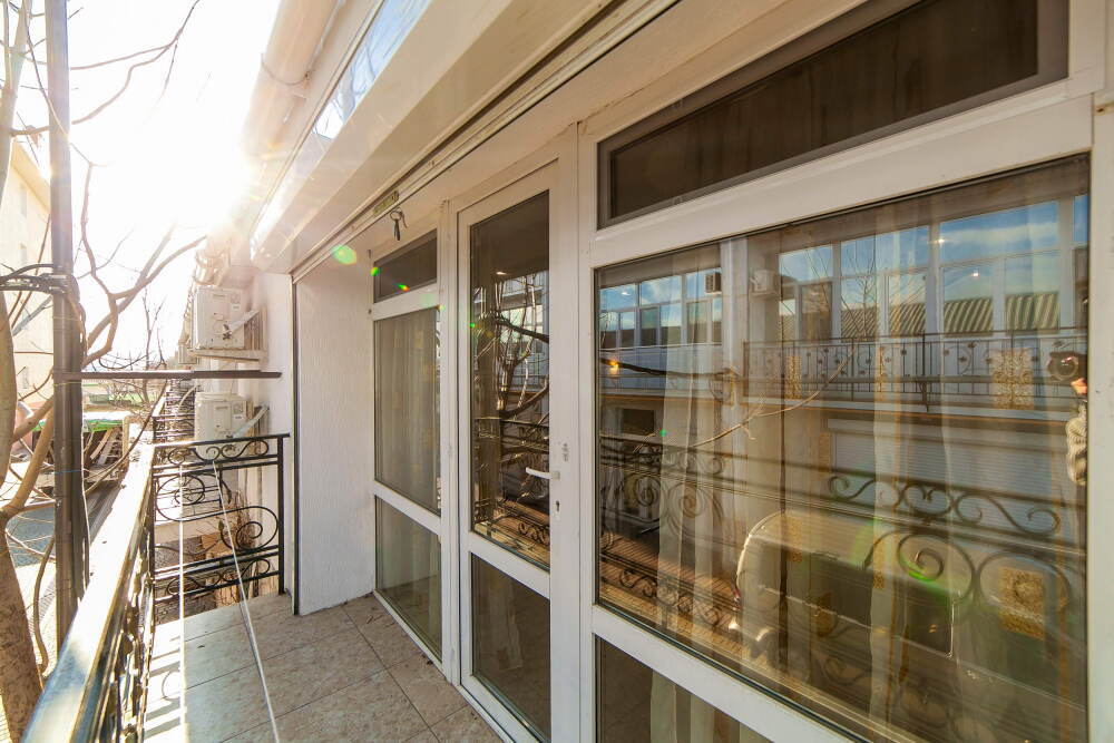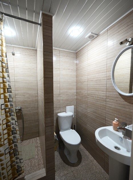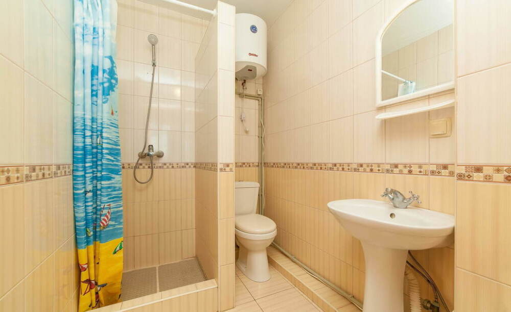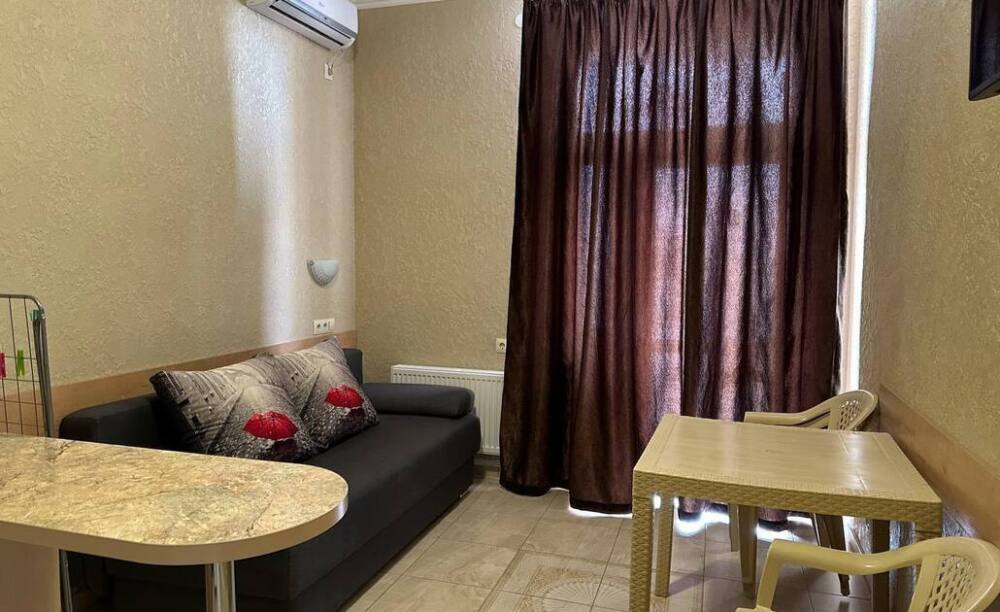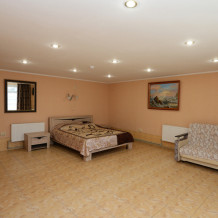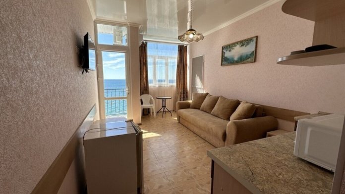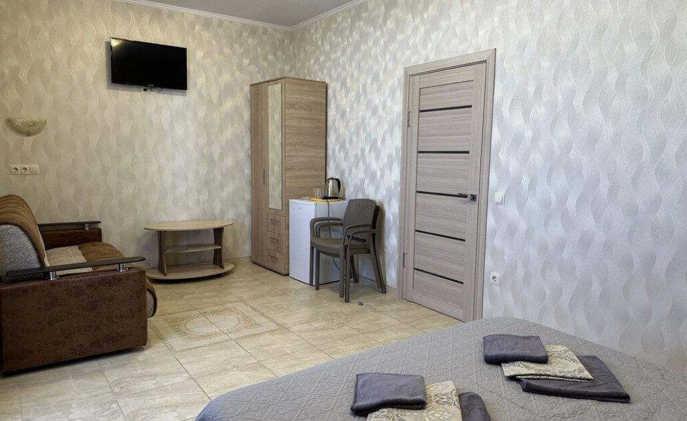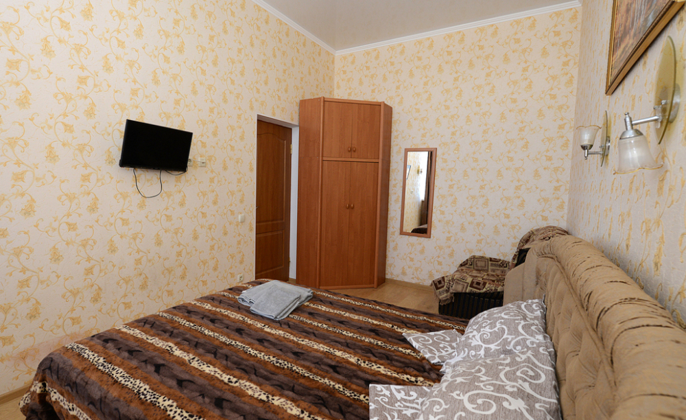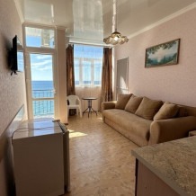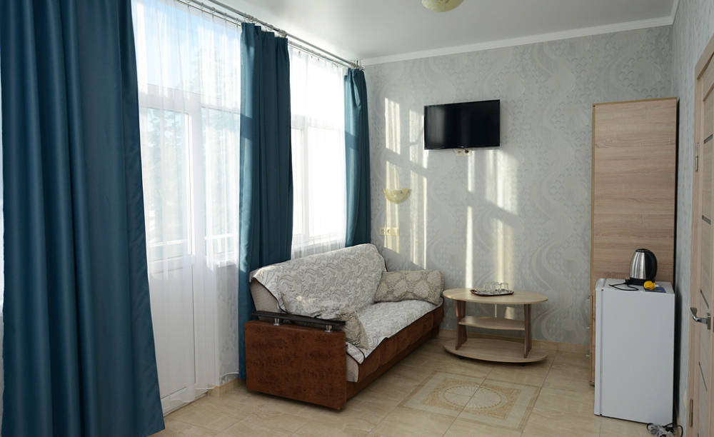 Спальные места в комнате: двуспальная кровать, двуспальный диван. В этой комнате есть все для удобного отдыха: своя кухня, посуда, микроволновая печь, индукционная плита на 2 конфорки, холодильник, электрочайник, кондиционер, плазменный телевизор, санузел с душем, фен, шкаф. Балкон с видом на море добавляет дополнительный комфорт этой комнате. Комната этой категории находится на мансардном этаже.