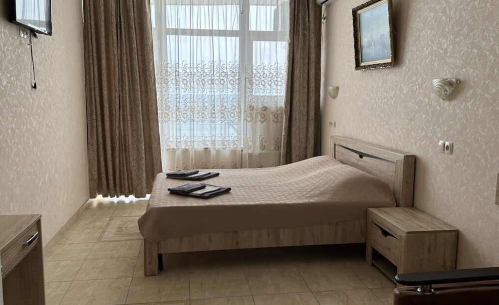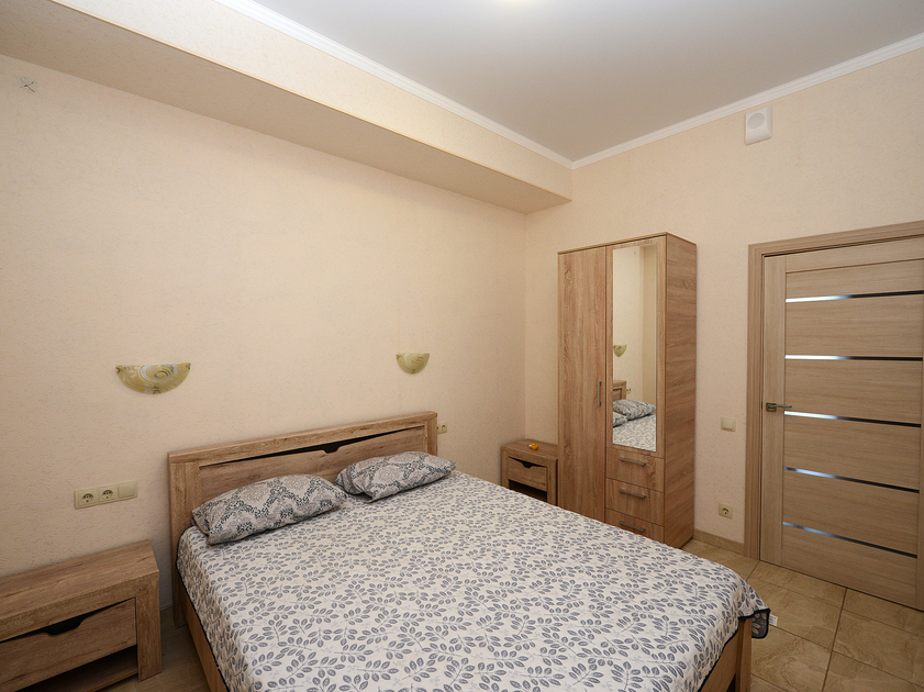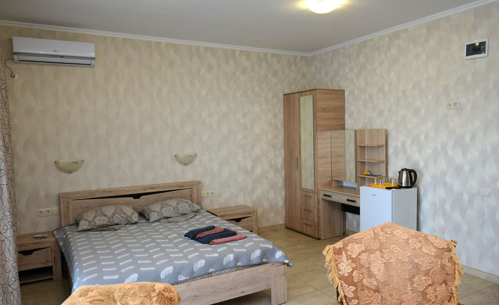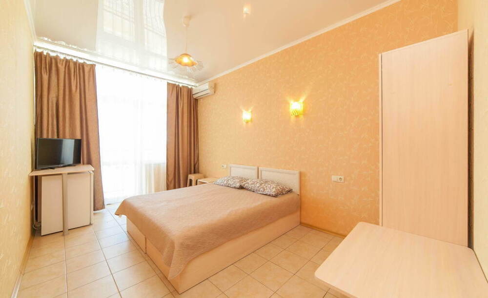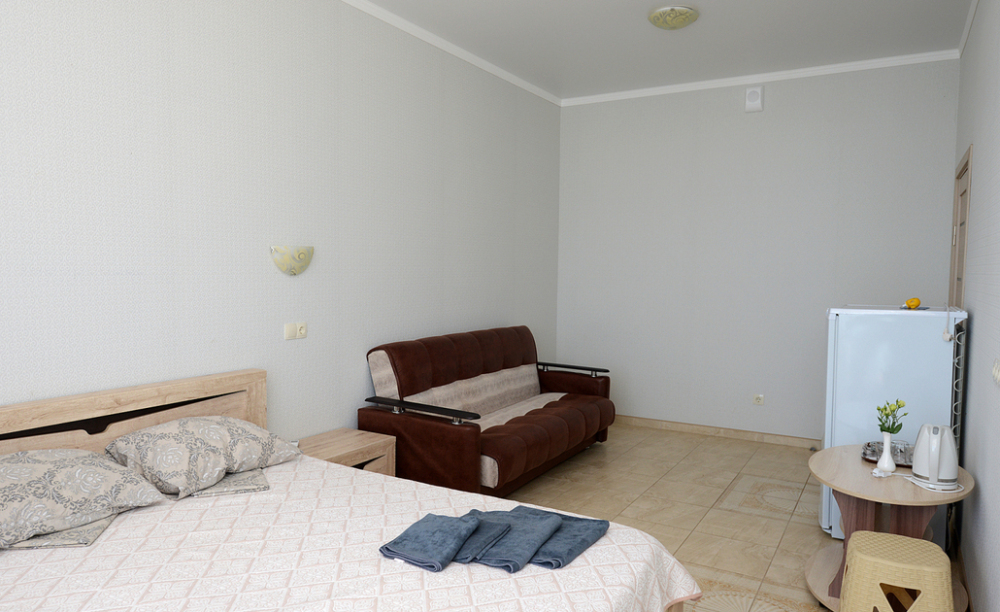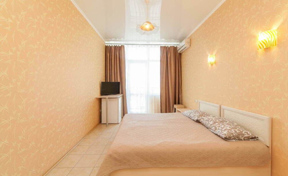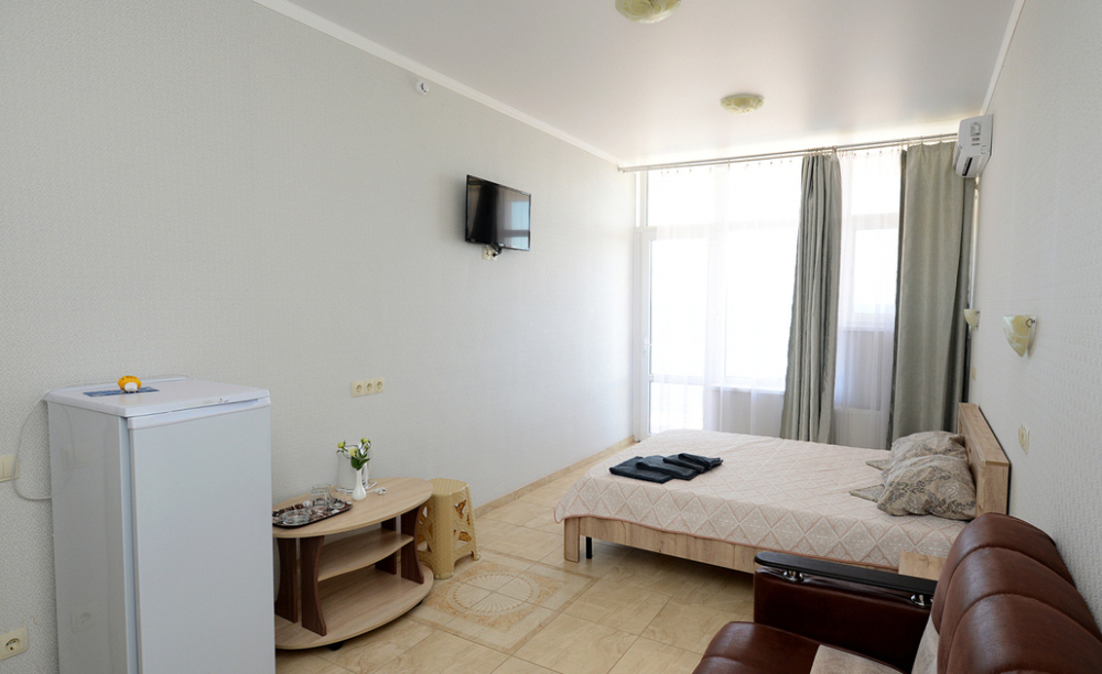 Спальное место в комнате: одна двуспальная кровать (ширина 170 см). В этой комнате есть все для удобного отдыха: кондиционер, плазменный телевизор, холодильник, санузел с душем, фен, шкаф. Прекрасный вид на море с балкона добавляет комфорт этой комнате. Комнаты находятся на 4-5 этажах.