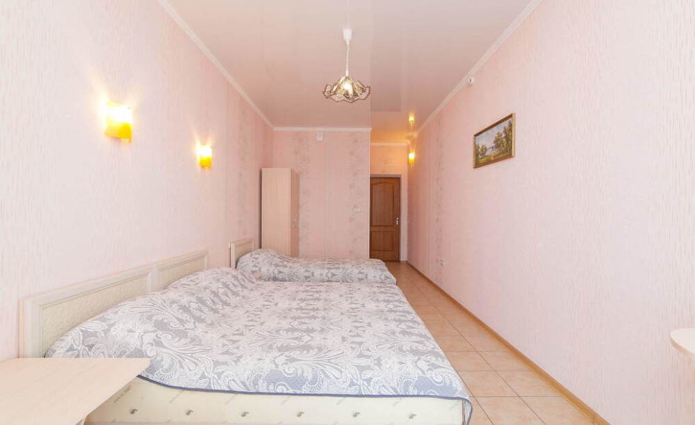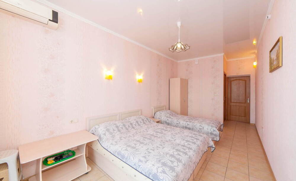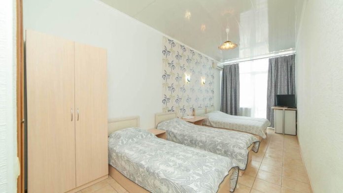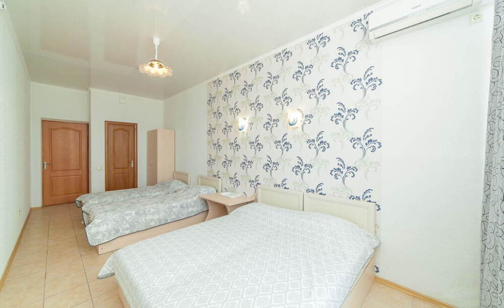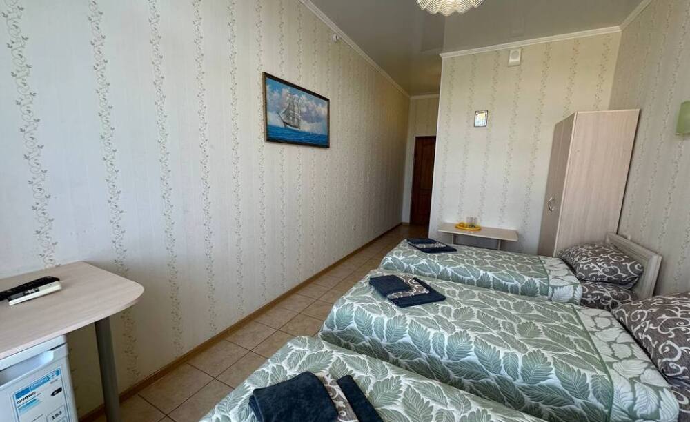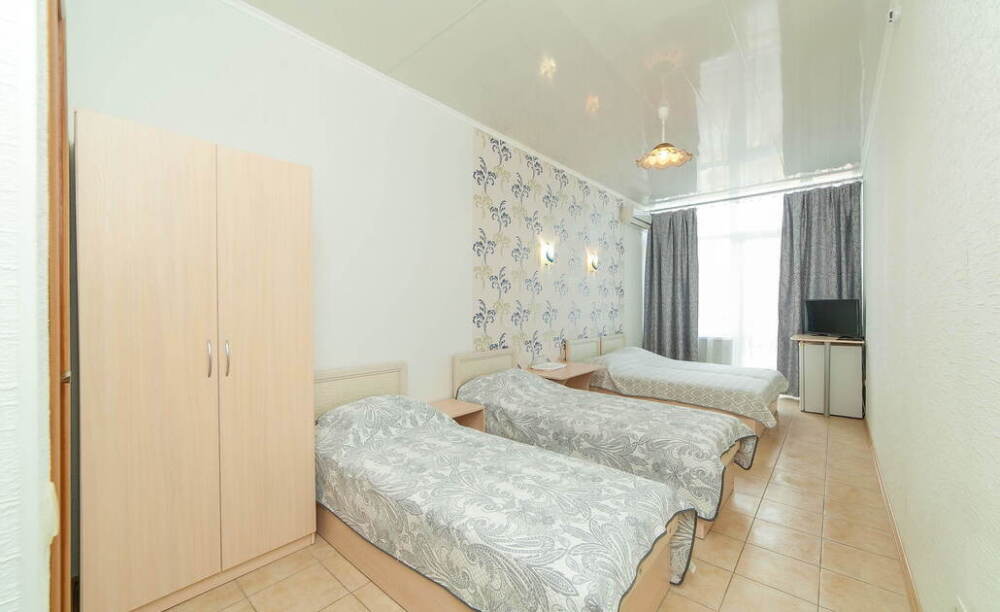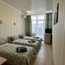 Спальные места в комнатах: на 3 этаже - 3 раздельные кровати (ширина 80 см). Кровати очень удобные, поэтому, при необходимости их можно сдвинуть. На 2 этаже - 2 раздельные кровати и односпальный диван. В этой комнате есть все для удобного отдыха: кондиционер, плазменный телевизор, холодильник, санузел с душем, фен, шкаф. Прекрасный вид на море с балкона добавляет комфорт этой комнате. Комнаты данной категории находятся на 2-5 этажах, по согласованию.