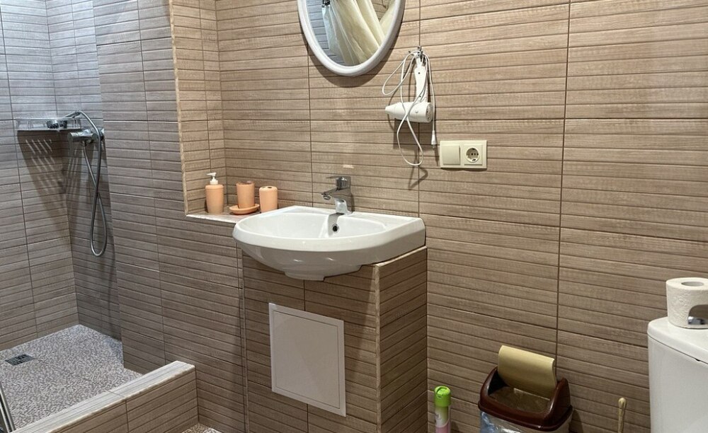 Спальные места в комнатах: на 5 этаже - 2 односпальные кровати; на мансардном этаже 1 двуспальная кровать (ширина 170 см). В этой комнате есть все для удобного отдыха: кондиционер, плазменный телевизор, холодильник, санузел с душем, фен, шкаф. Вид с балкона на внутренний дворик. Комнаты находятся на 5-х и мансардном этажах.