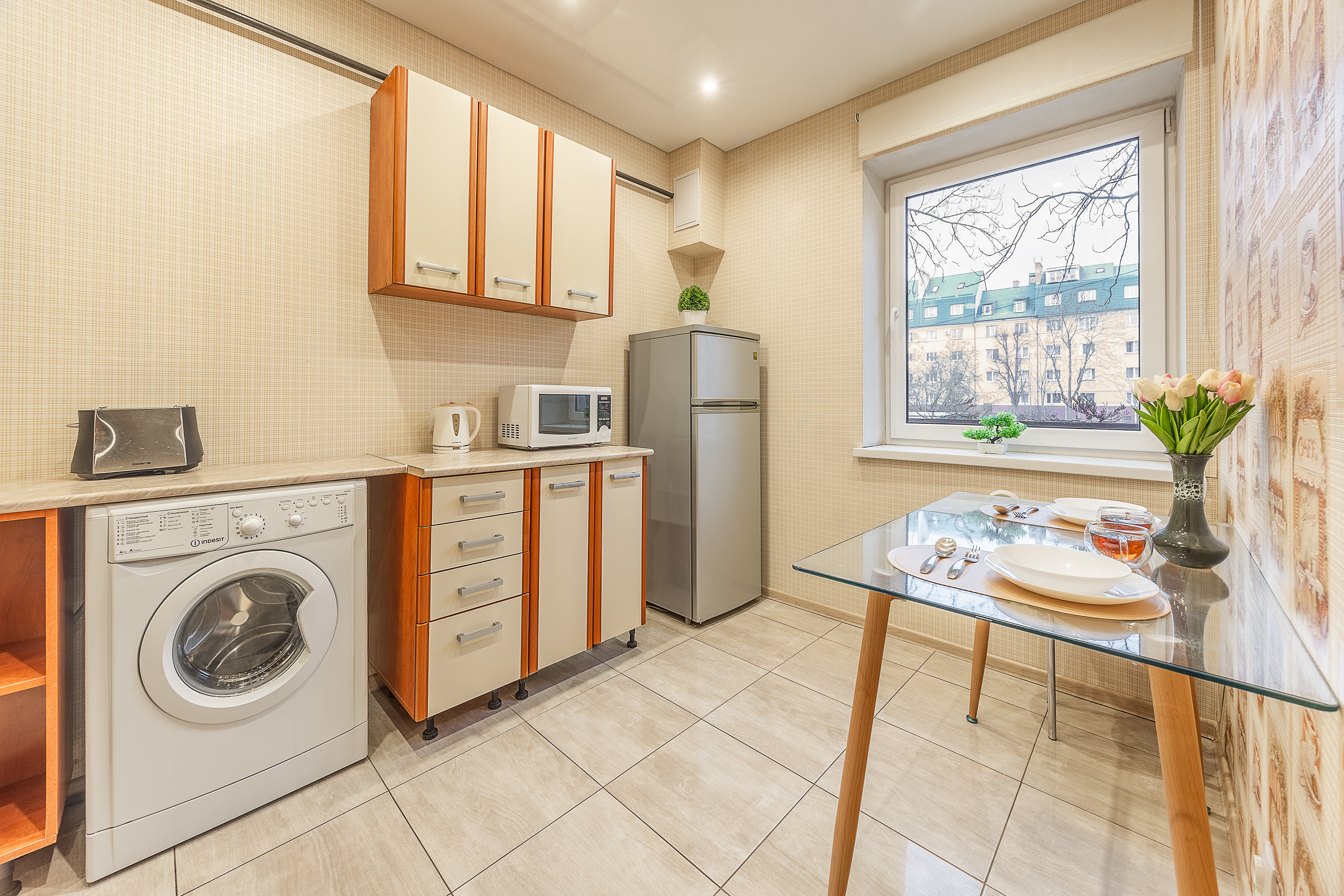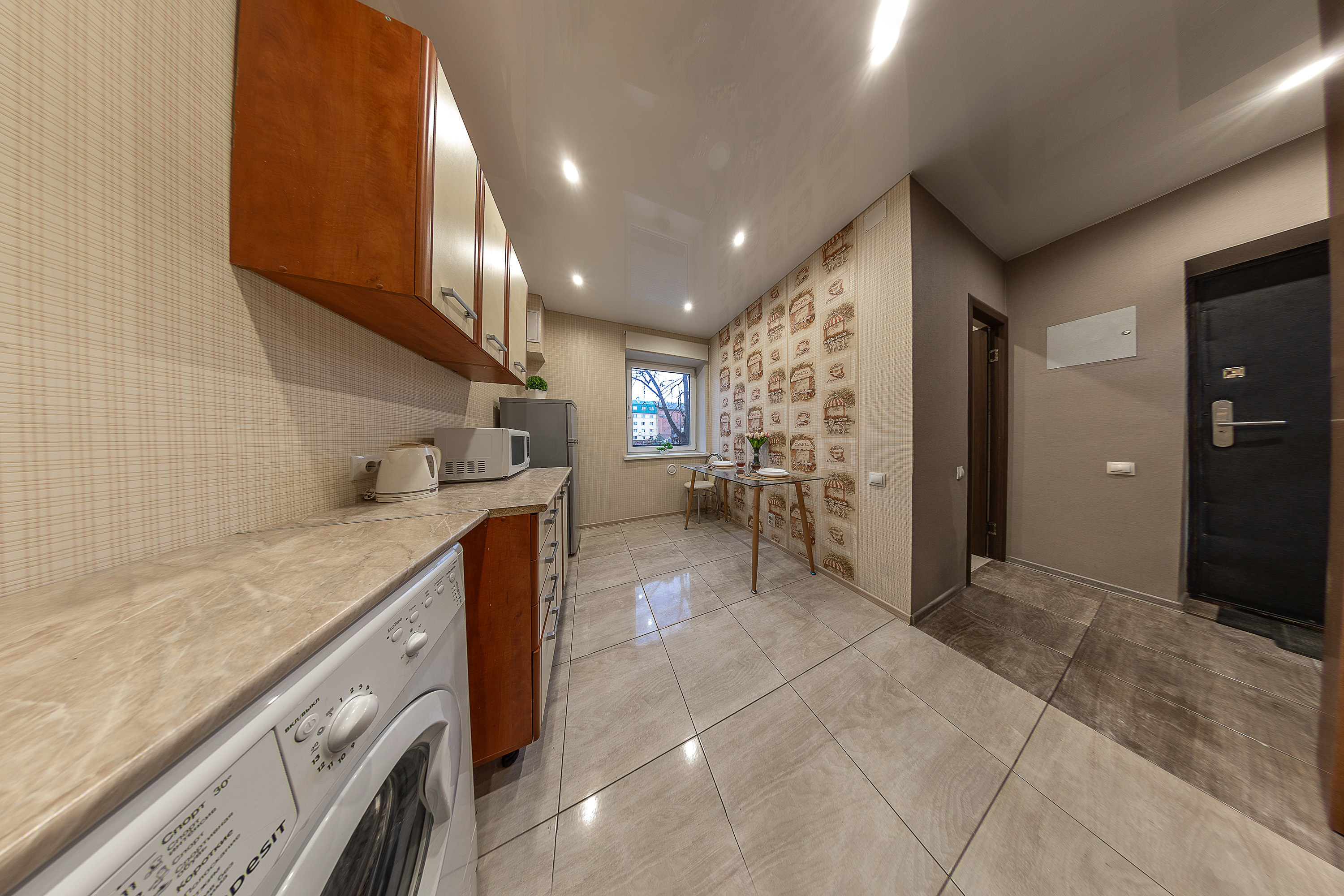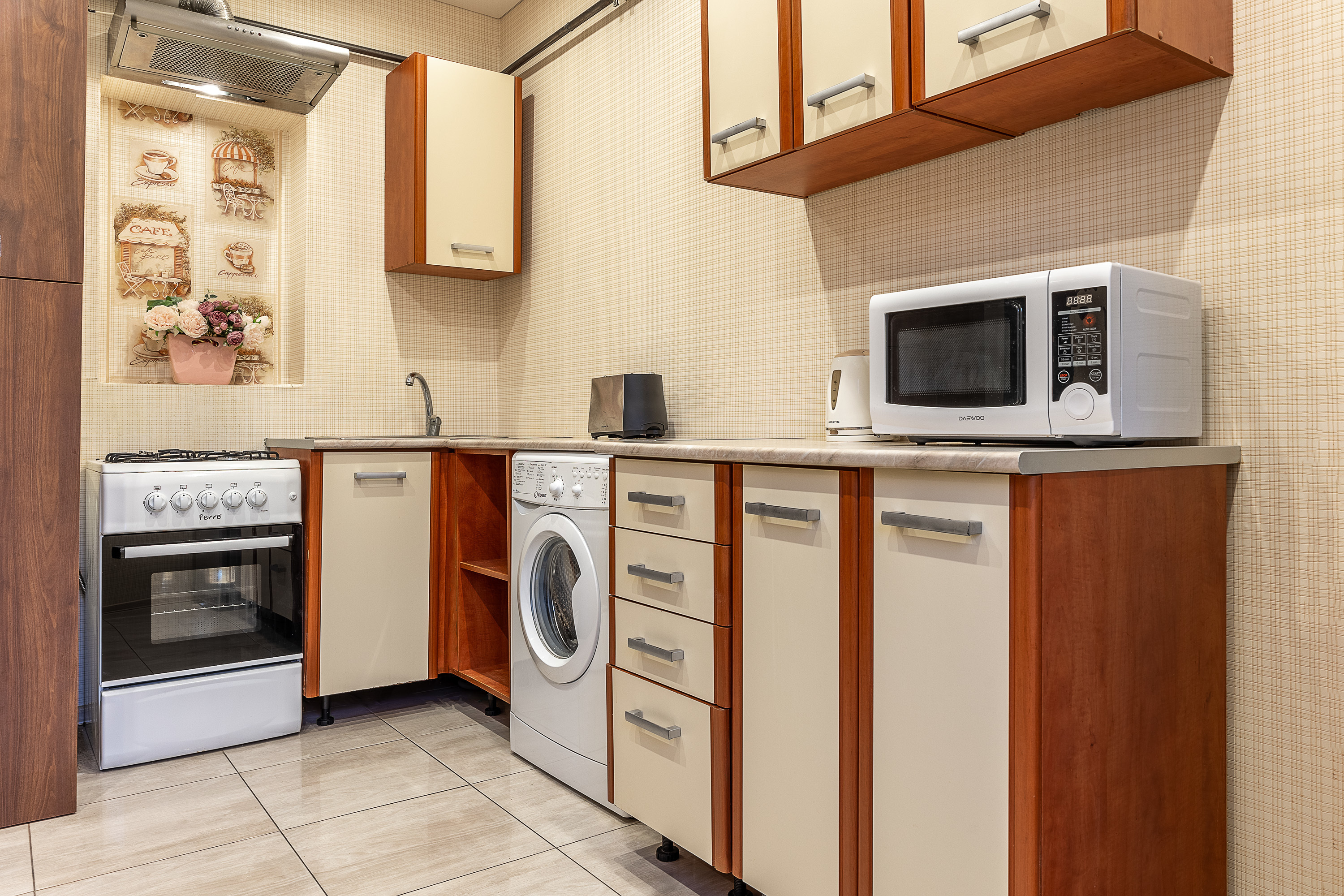 - бесплатный быстрый WI-Fi и техника: большой телевизор, стиральная машина, фен, утюг, плита, холодильник, микроволновая печь, тостер, духовка, электрочайник, кофеварка и бесплатный кофе к ней, чай, соль, сахар);