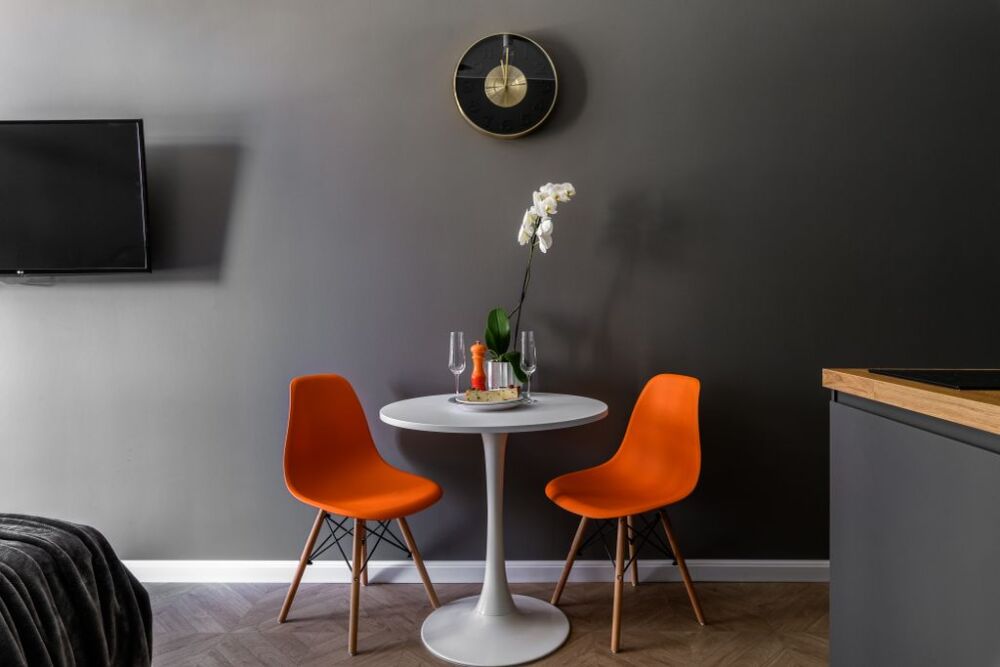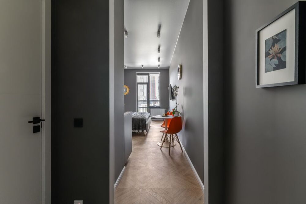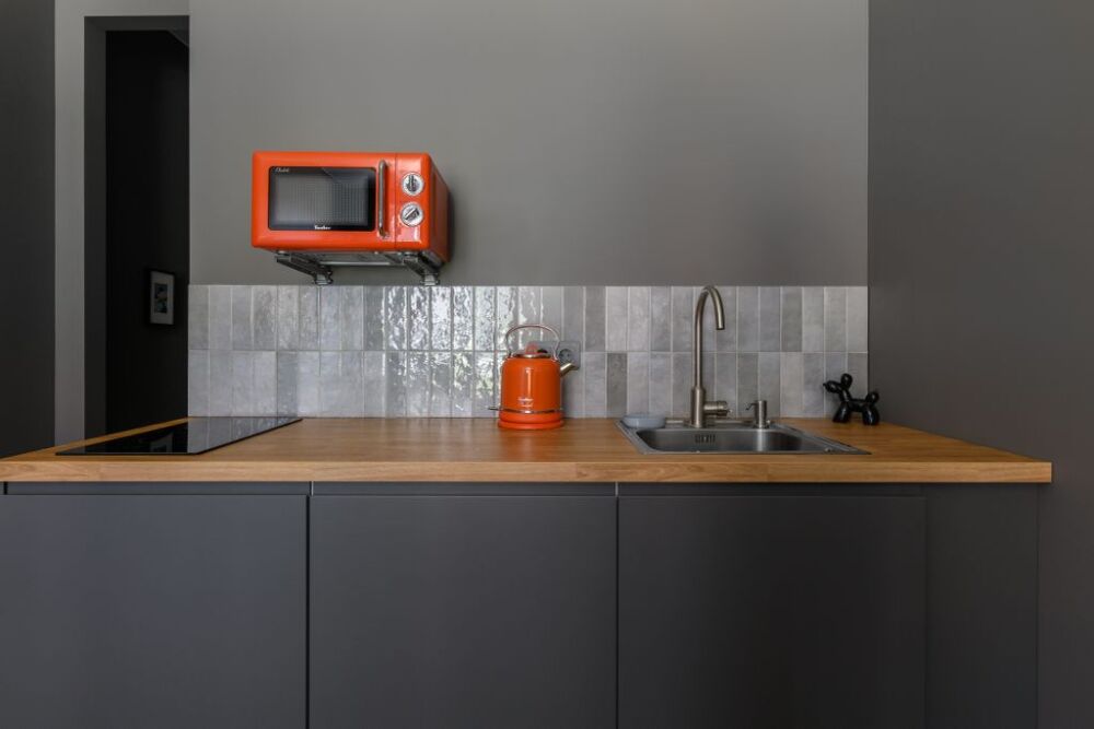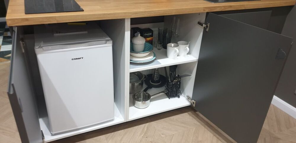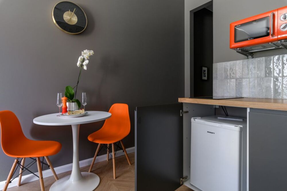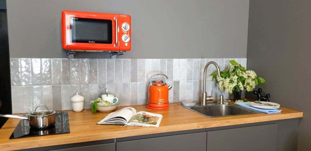В квартире стоит большая и удобная кровать (180 см). Оборудована небольшая кухня с плитой, холодильником, кухонными и столовыми принадлежностями, есть чайник и СВЧ, а также чай, кофе, перец, соль. Интернет и ТВ тоже в вашем распоряжении. В душевой установлены теплые полы для вашего комфорта. Комплект белых полотенец предоставляется гостям. Фен и стиральная машина также находится в санузле.