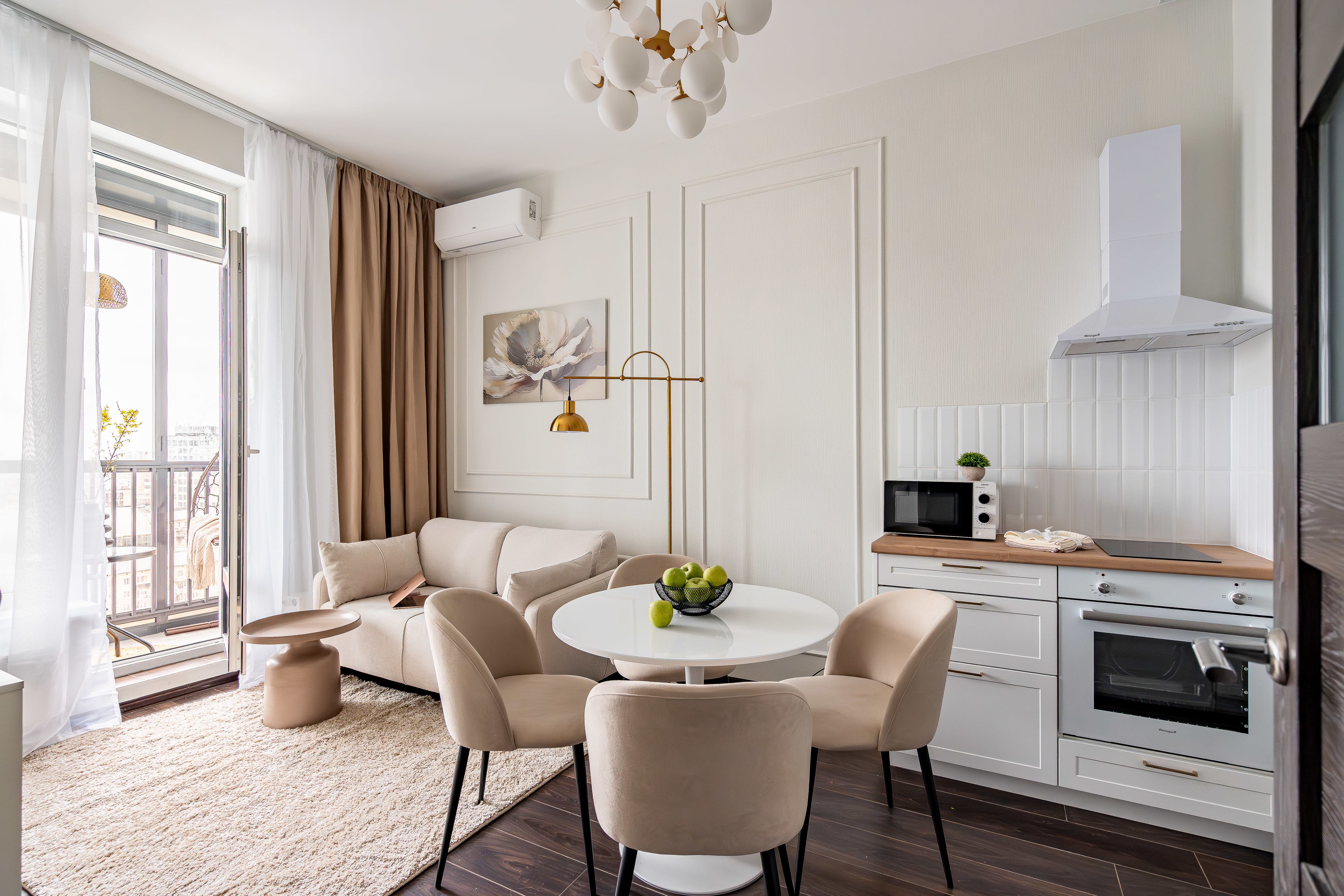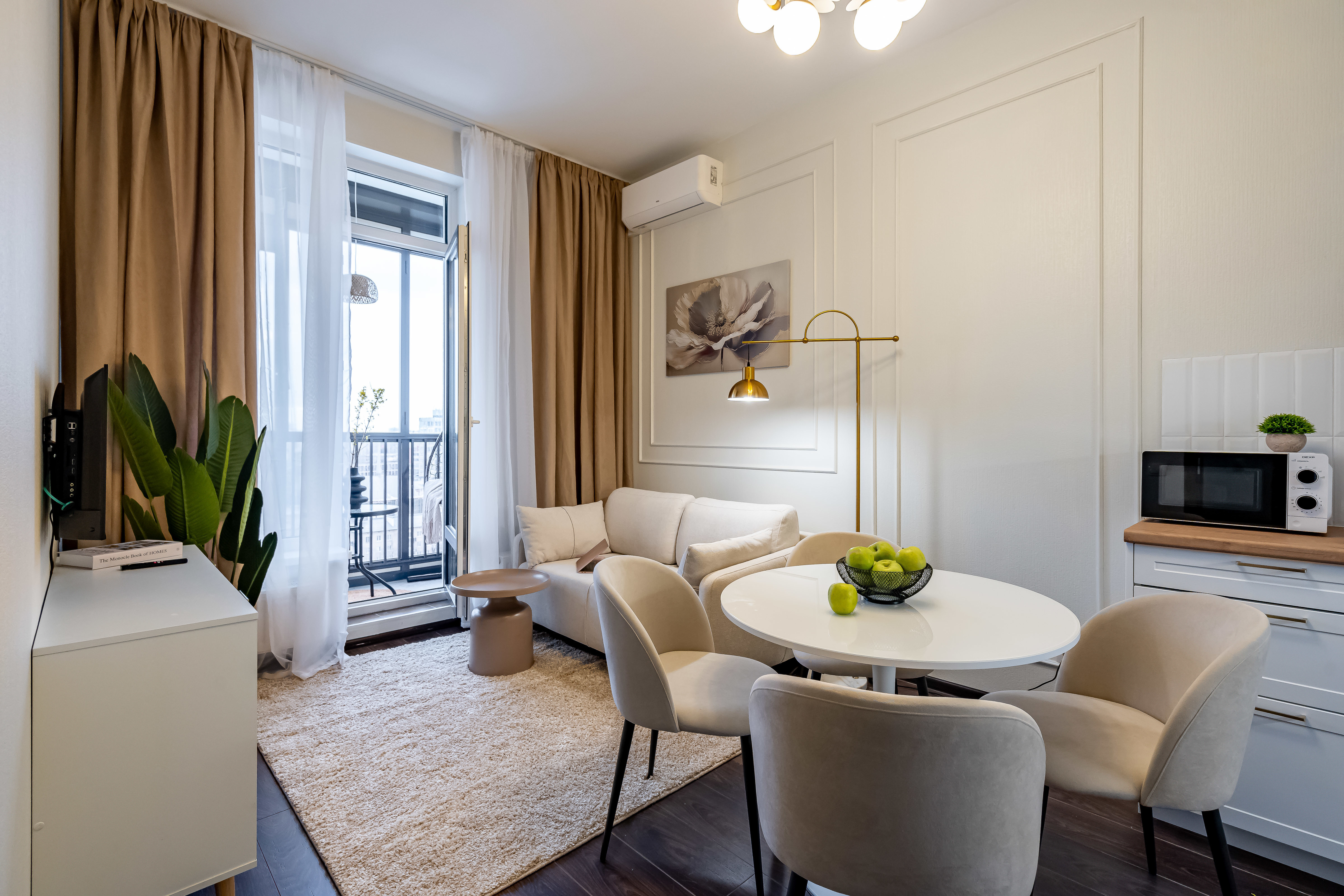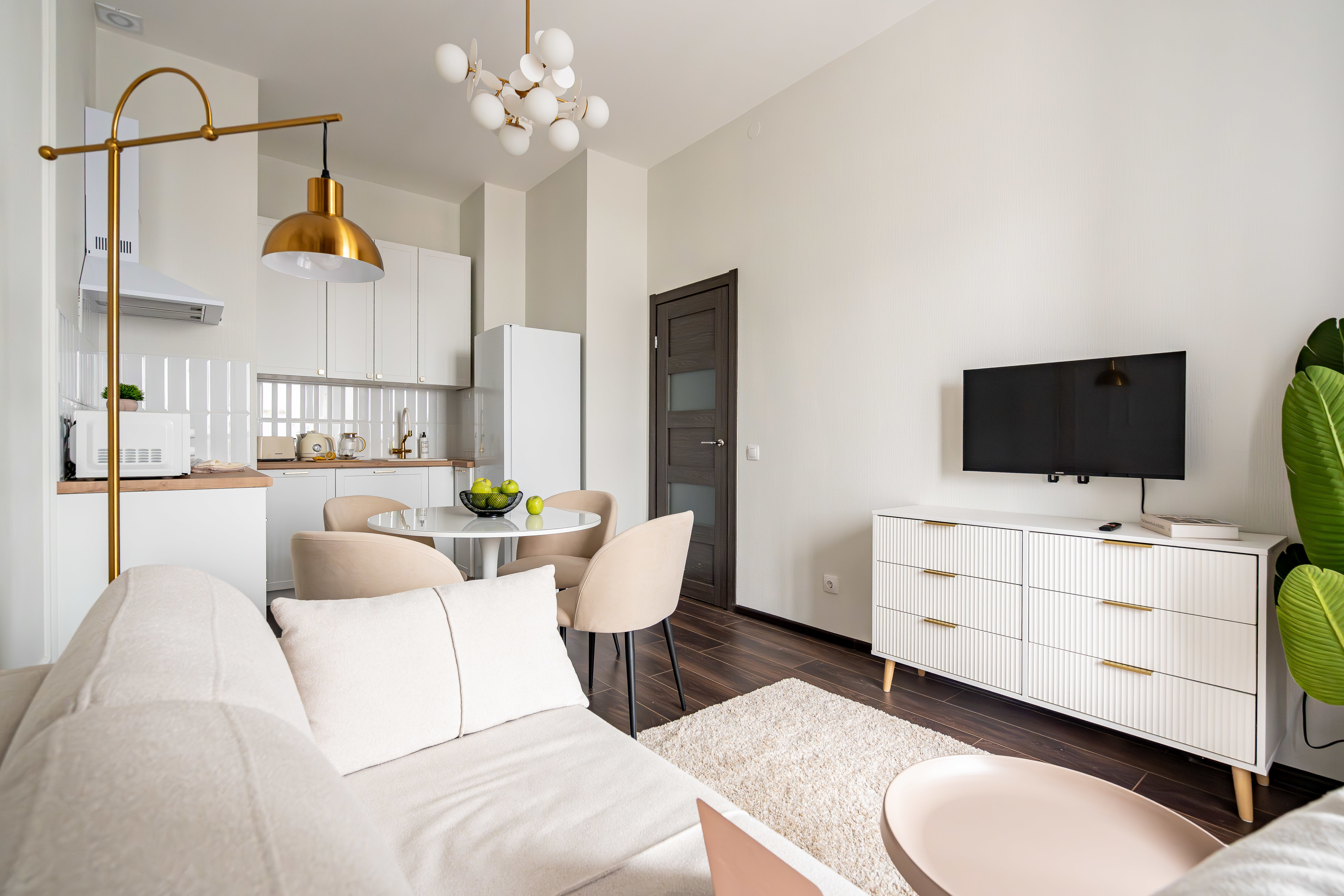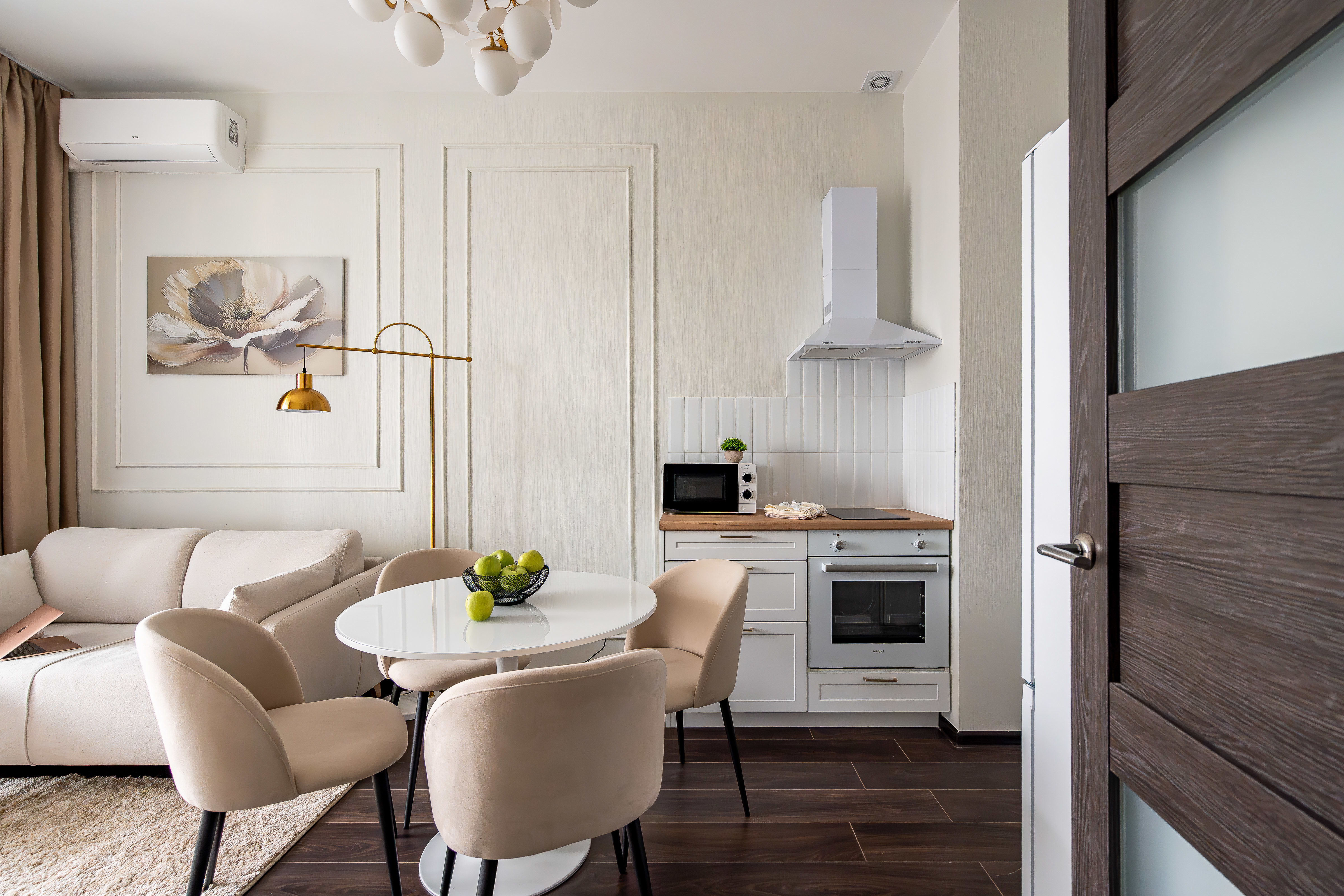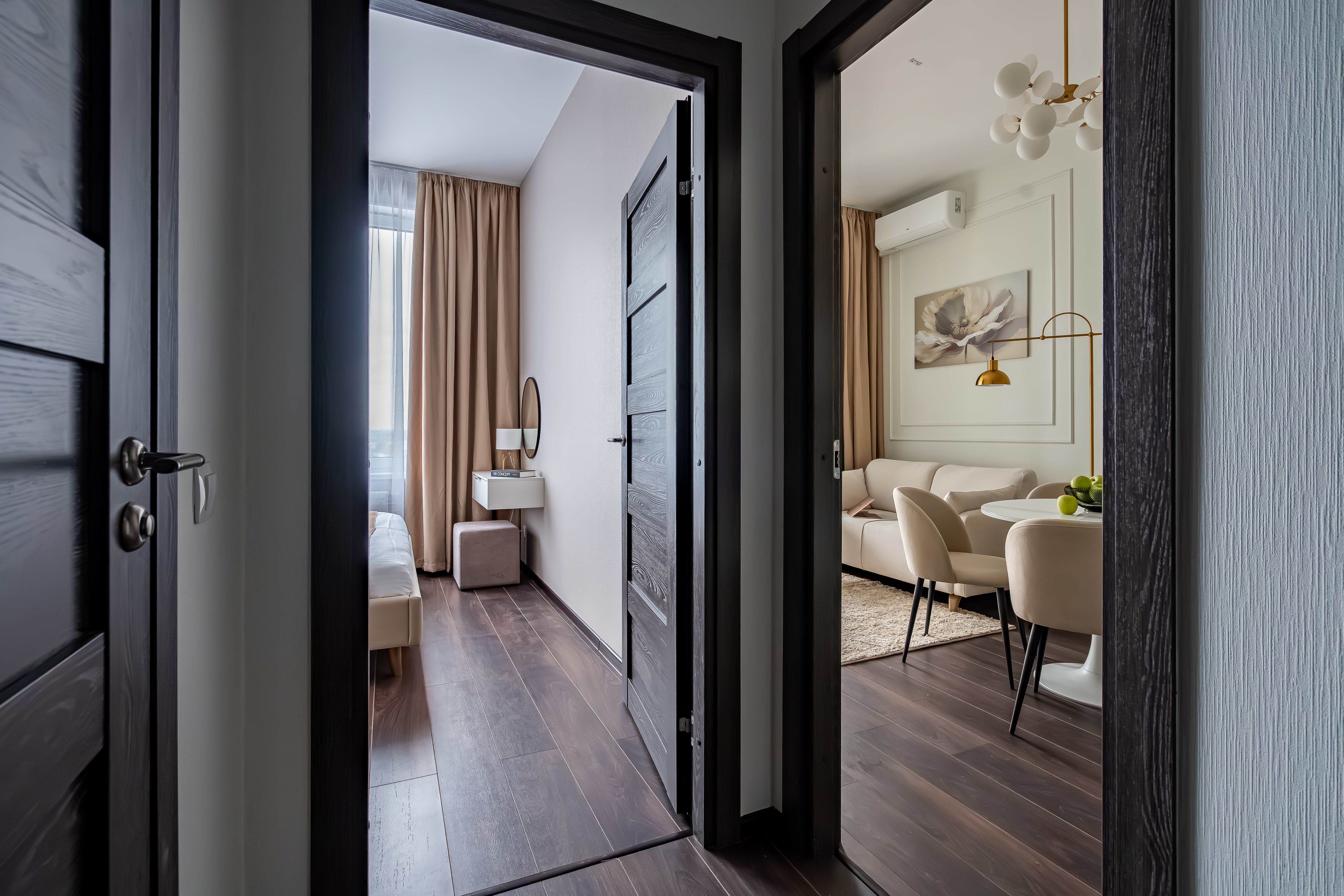 — Спальные места 2+2. Удобная кровать в спальне (160 см) и раскладной диван в гостиной (140 см).
