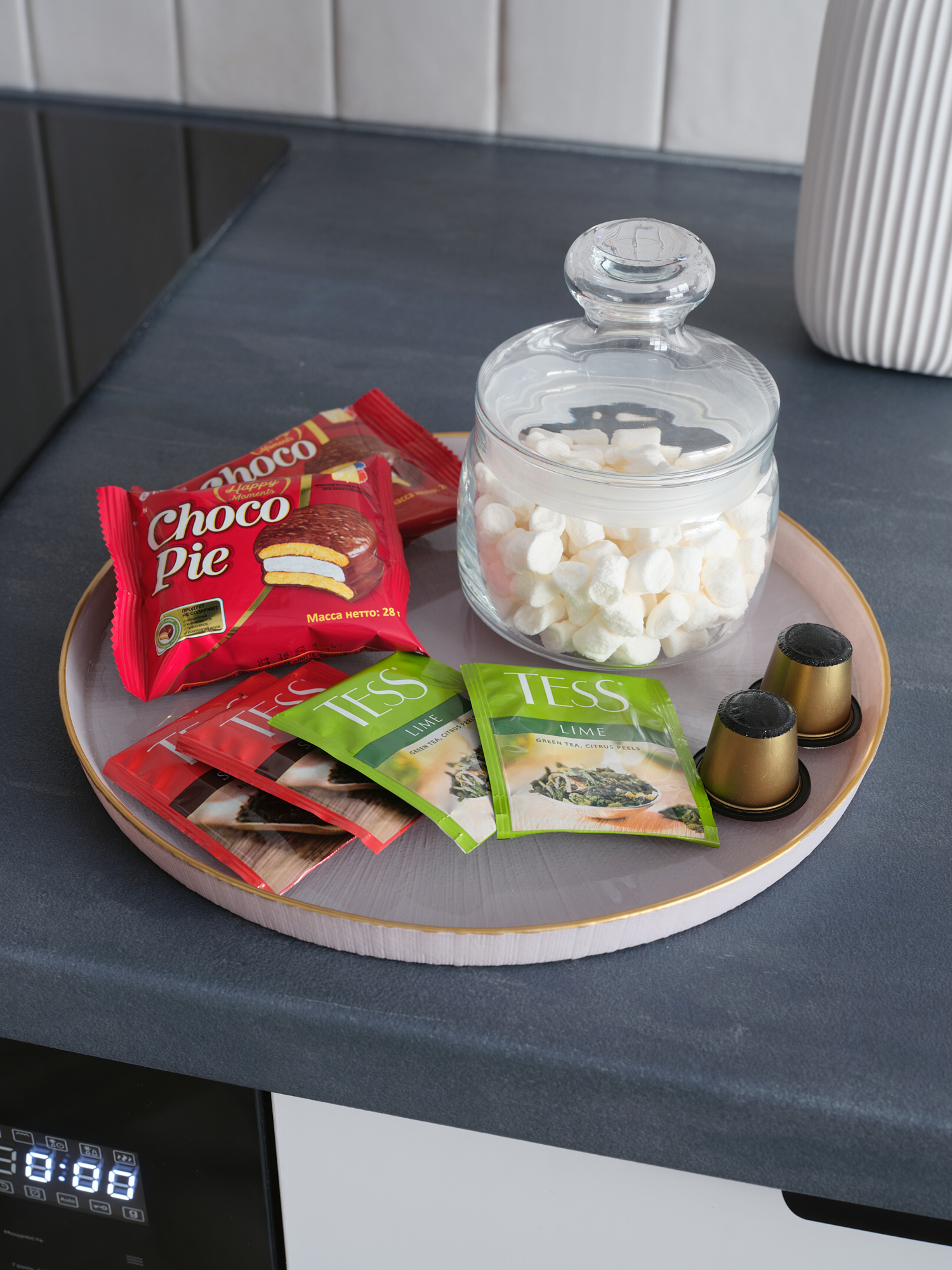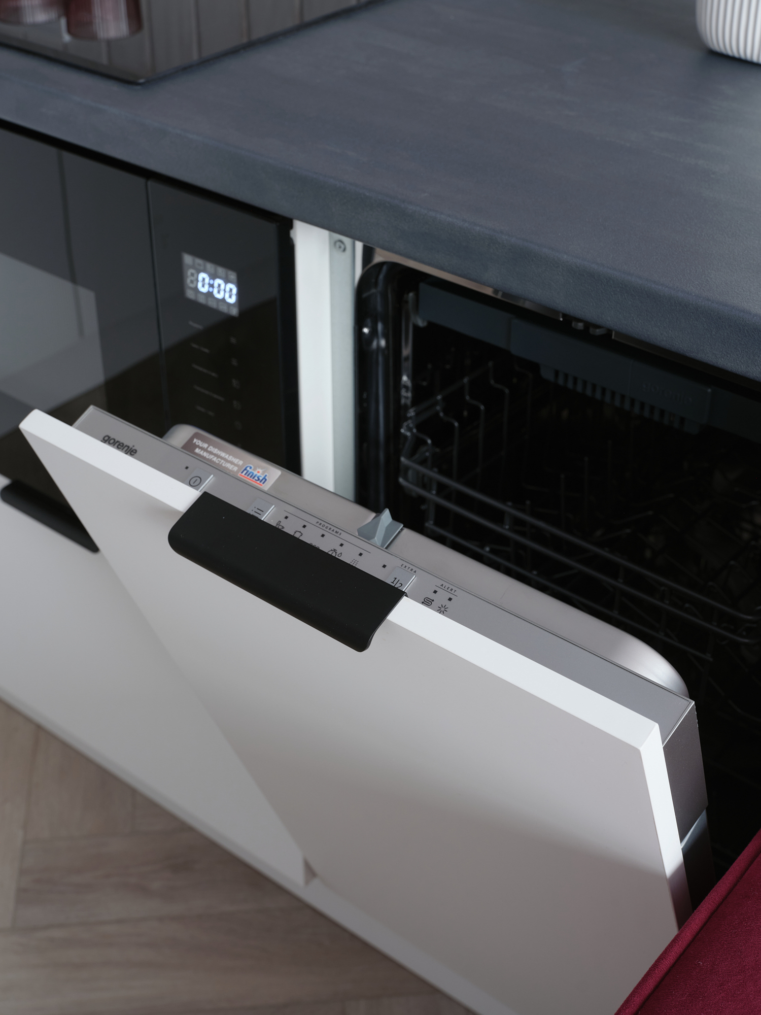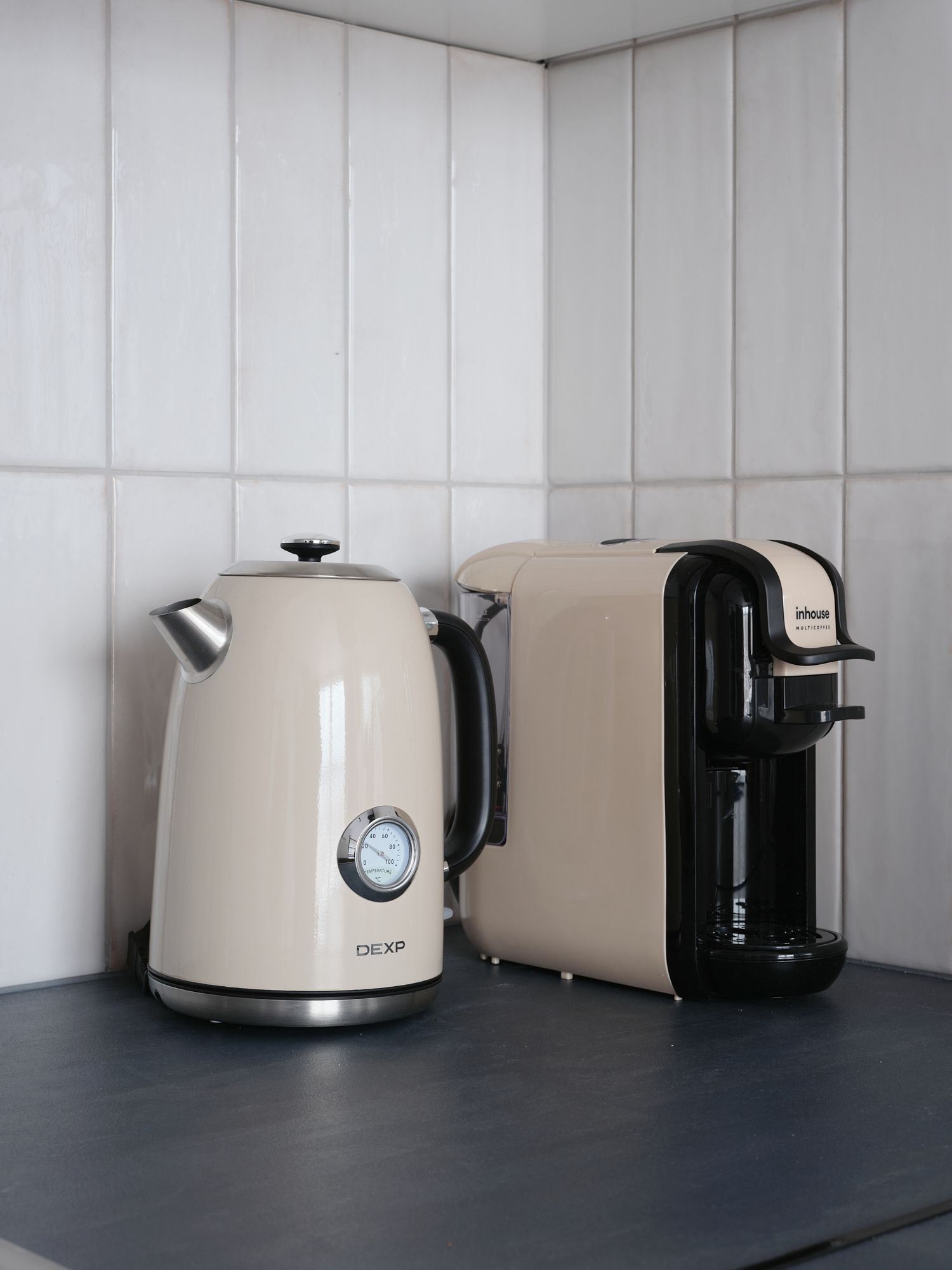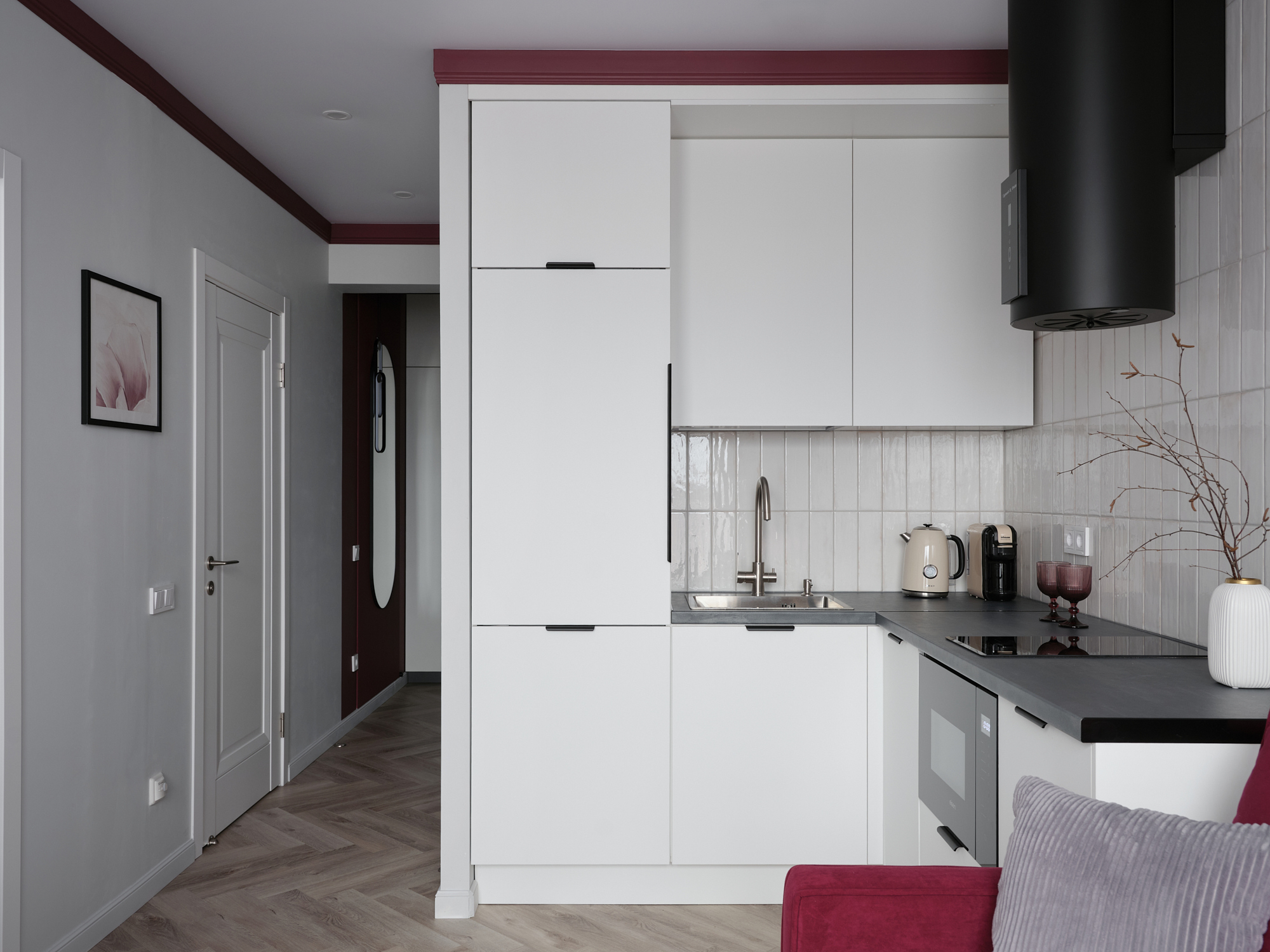 кухня с плитой, чайником, кофемашиной и микроволновкой, посудомоечной машиной;