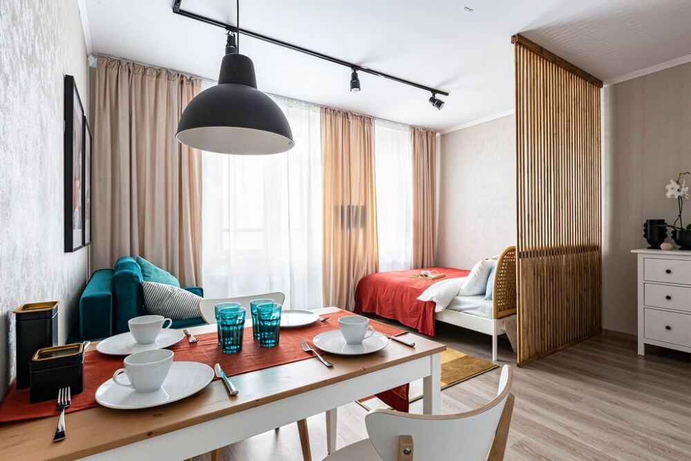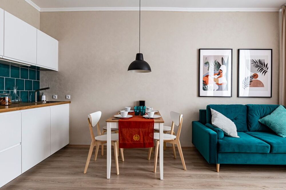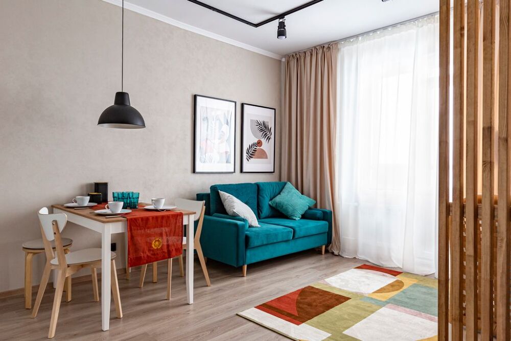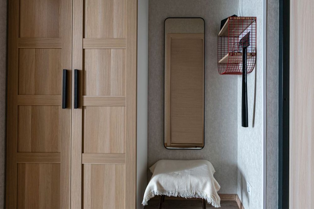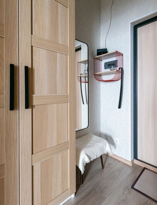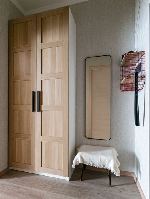 За столом могут удобно разместиться 4 человека, при этом за ним удобно как обедать, так и работать с ноутбуком. В комнате предусмотрен вместительный комод, в котором вы можете разложить все ваши вещи, а в шкафу в коридоре вы можете повесить (как верхнюю, так и повседневную) одежду на плечики. В шкафу также можно разместить обувь и сумки.
