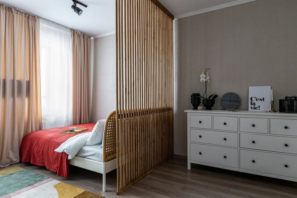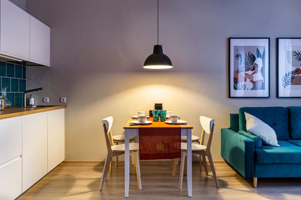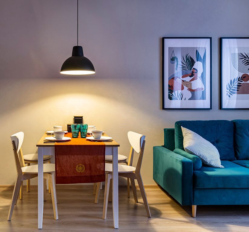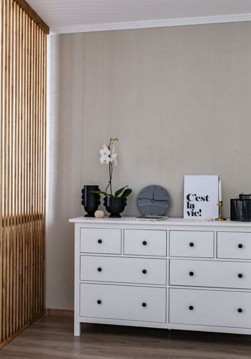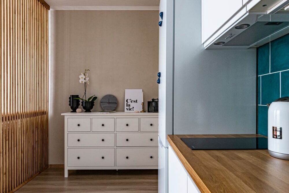 За столом могут удобно разместиться 4 человека, при этом за ним удобно как обедать, так и работать с ноутбуком. В комнате предусмотрен вместительный комод, в котором вы можете разложить все ваши вещи, а в шкафу в коридоре вы можете повесить (как верхнюю, так и повседневную) одежду на плечики. В шкафу также можно разместить обувь и сумки.