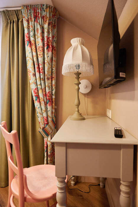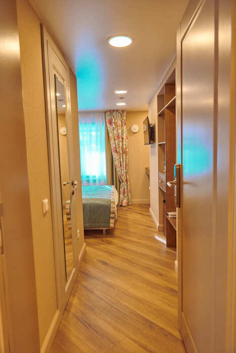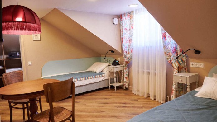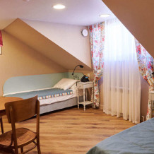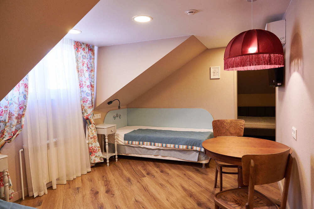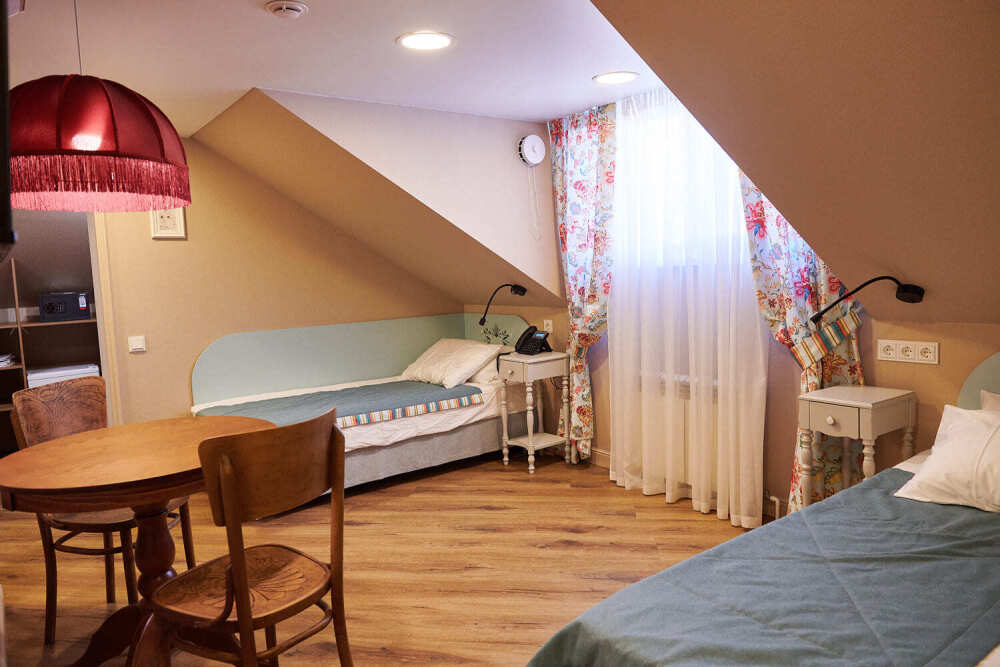 Уютный двухкомнатный номер на 2-м мансардном этаже гостевого дома. Включает спальню с двумя односпальными кроватями twin (90 см) и отдельную комнату с дополнительным спальным местом для третьего гостя. В спальне: уютный столик для вечерних чаепитий, телевизор, кондиционер, телефон, мини-бар, сейф, электрический чайник и чайный набор. Также есть отдельная гардеробная комната. В душевой: мягкие полотенца, белоснежные махровые халаты, тапочки, фен и средства личной гигиены.