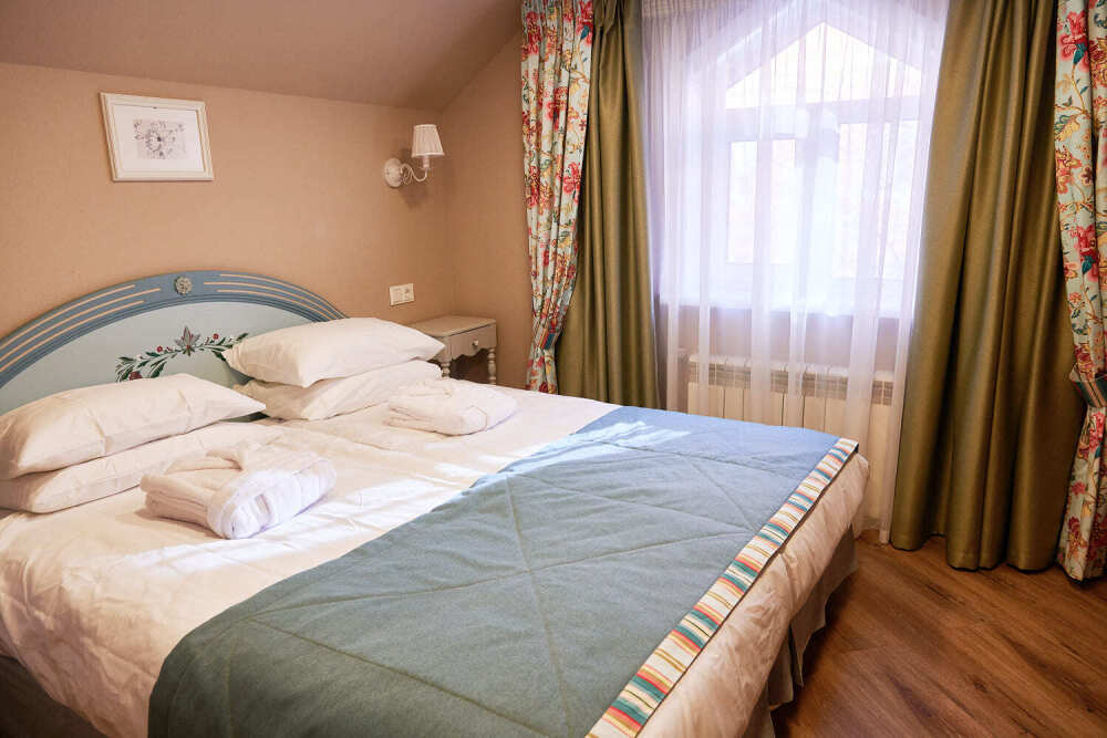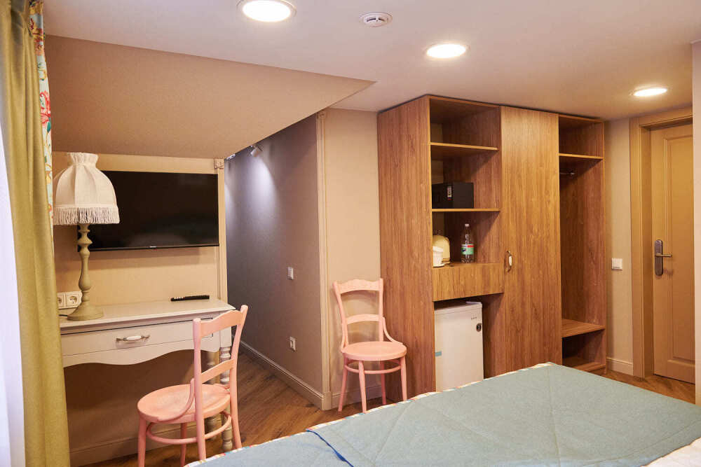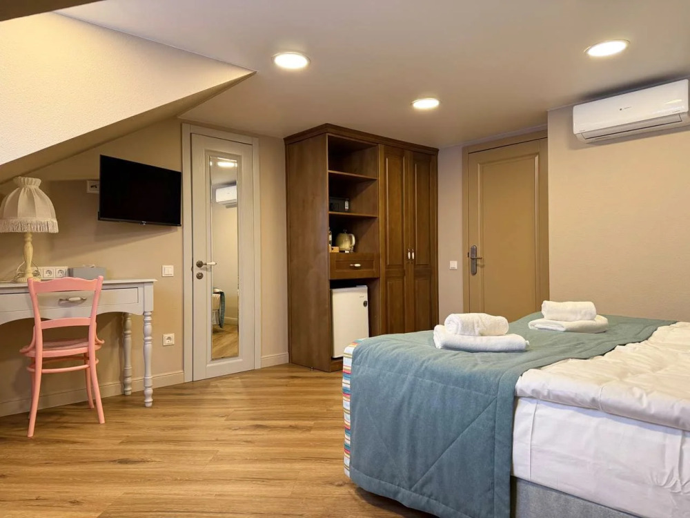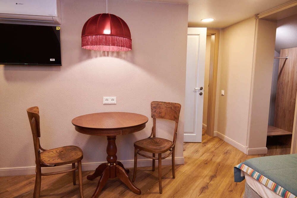 Уютный двухкомнатный номер на 2-м мансардном этаже гостевого дома. Включает спальню с двуспальной кроватью King size (180 см) и отдельную комнату с дополнительным спальным местом для 3-го гостя. В спальне: телевизор, кондиционер, телефон, мини-бар, сейф, электрический чайник и чайный набор. Для большего комфорта предусмотрен рабочий стол. В душевой комнате: мягкие полотенца, белоснежные махровые халаты, тапочки, фен и средства личной гигиены.