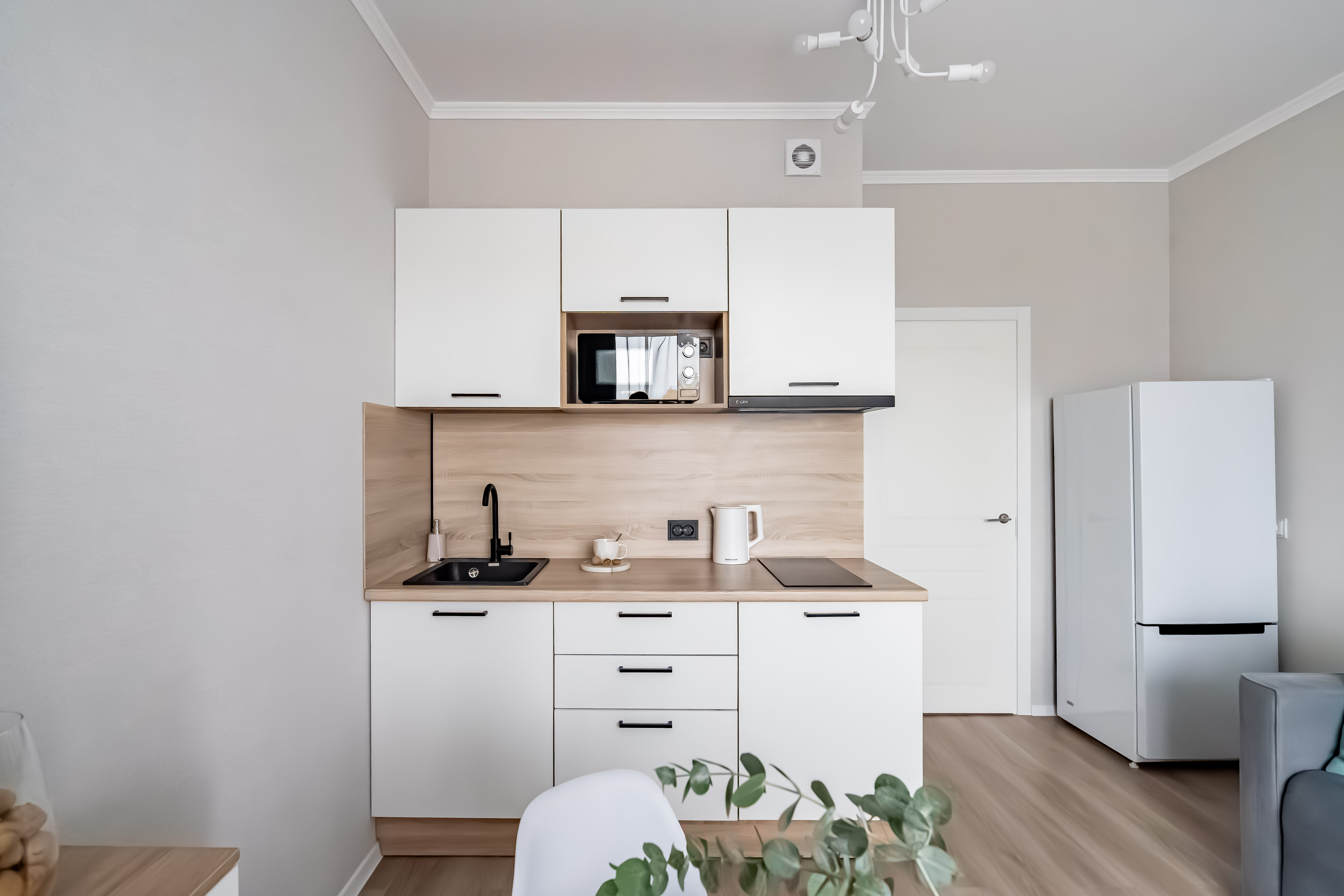 Кухня оборудована всем необходимым для постоянного проживания: есть кухонная утварь. На кухне есть микроволновая печь СВЧ, электрический чайник и электрическая плита, а также вместительный холодильник с морозильной камерой.