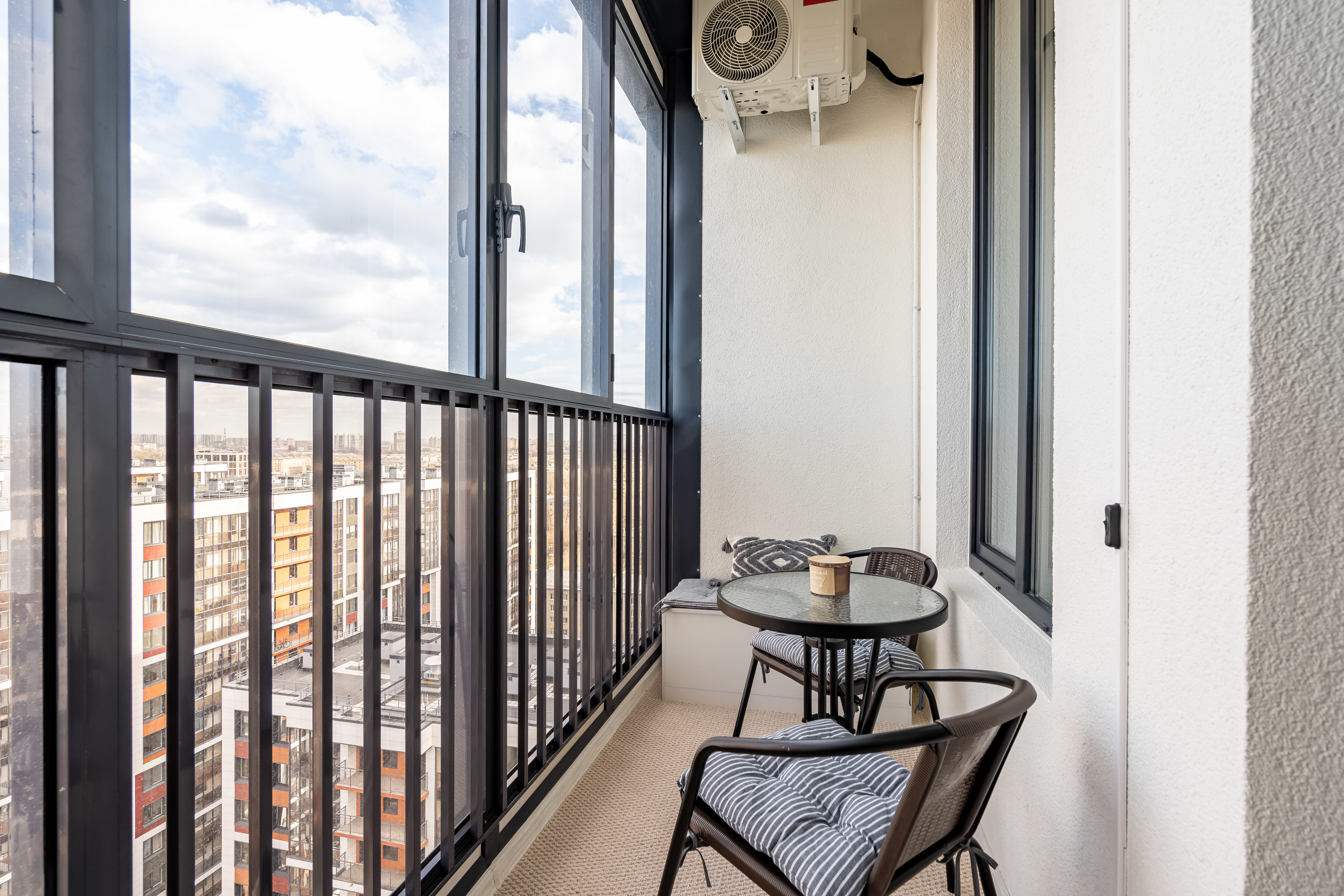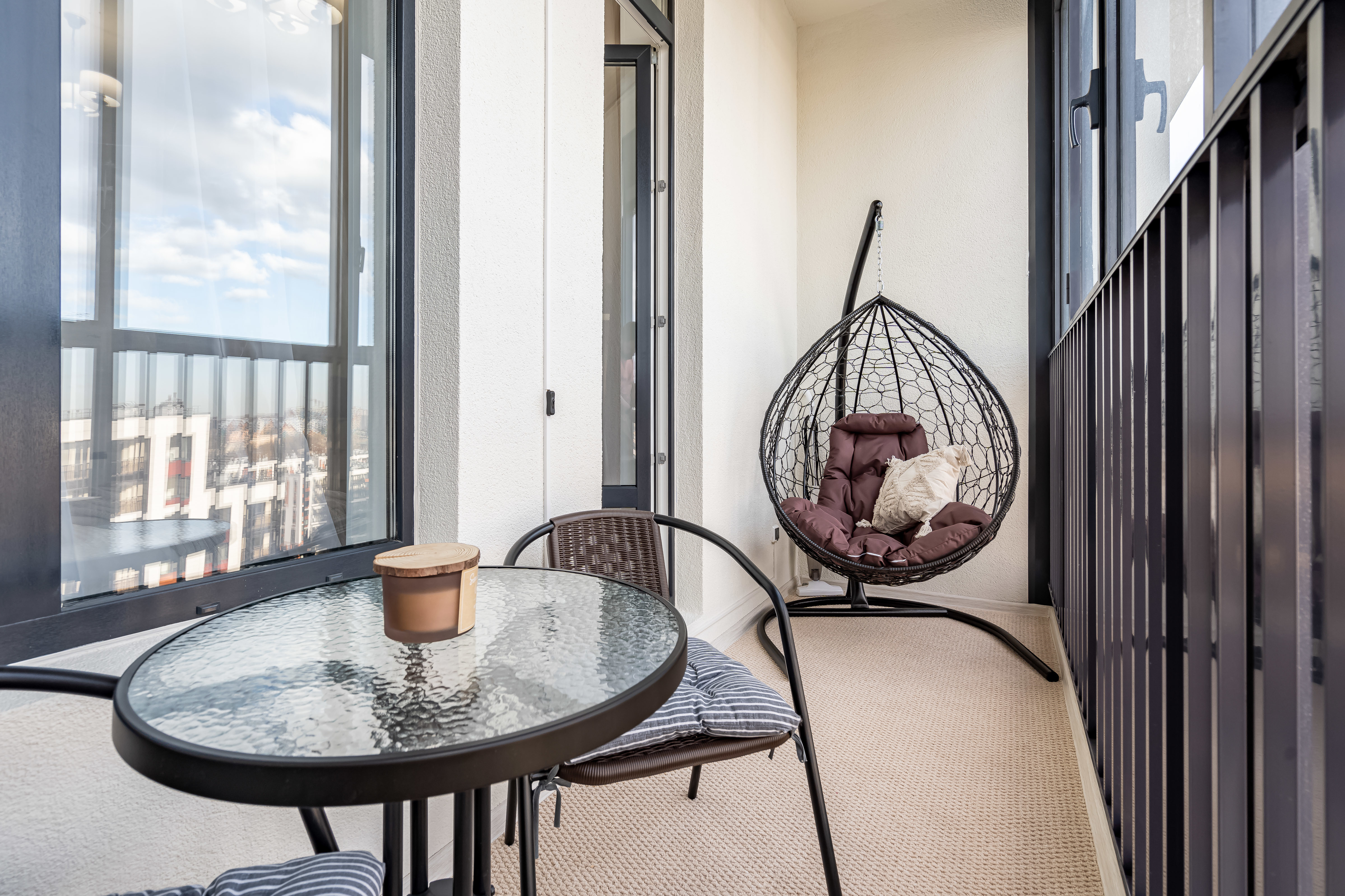 — Лоджия с качелями и панорамным видом на город.