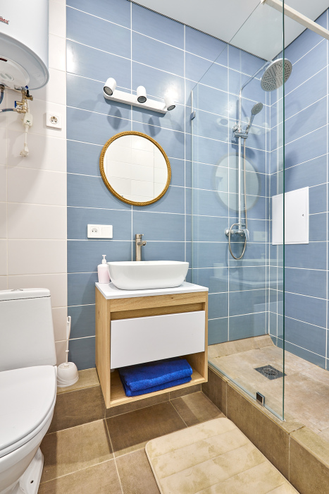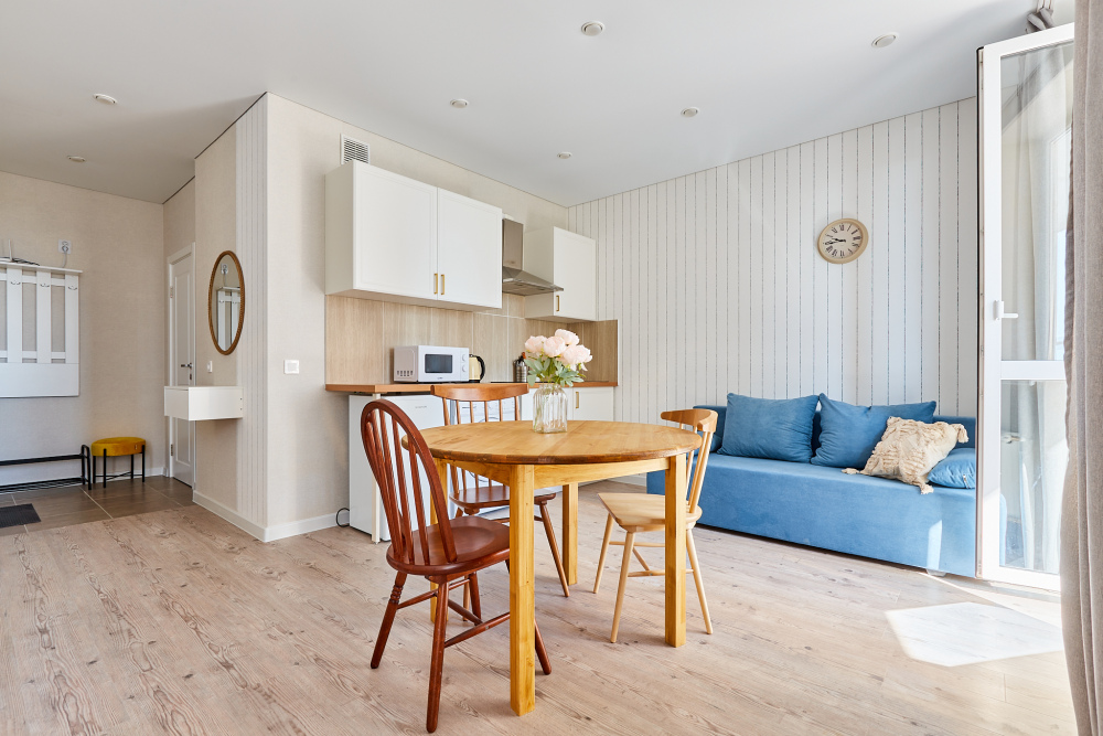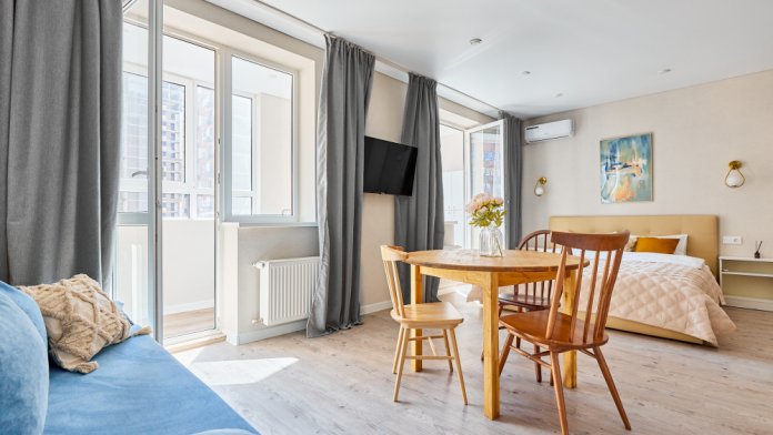 Студия «Ньюпорт». В студии качественное гостиничное постельное белье из страйп-сатина, двуспальная кровать и двуспальный раскладной диван. Бесплатный Вай-Фай. Предоставляются полотенца и посуда, фен, утюг, гладильная доска, стиральная машина.