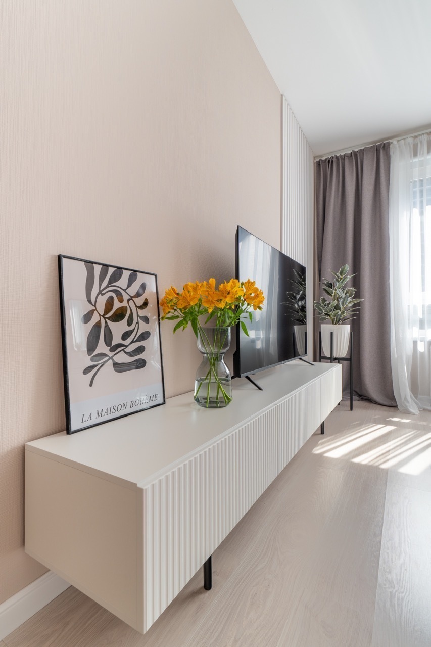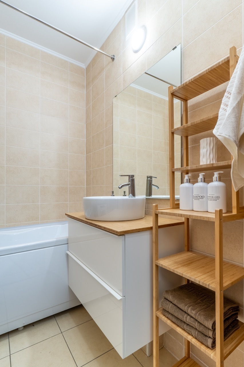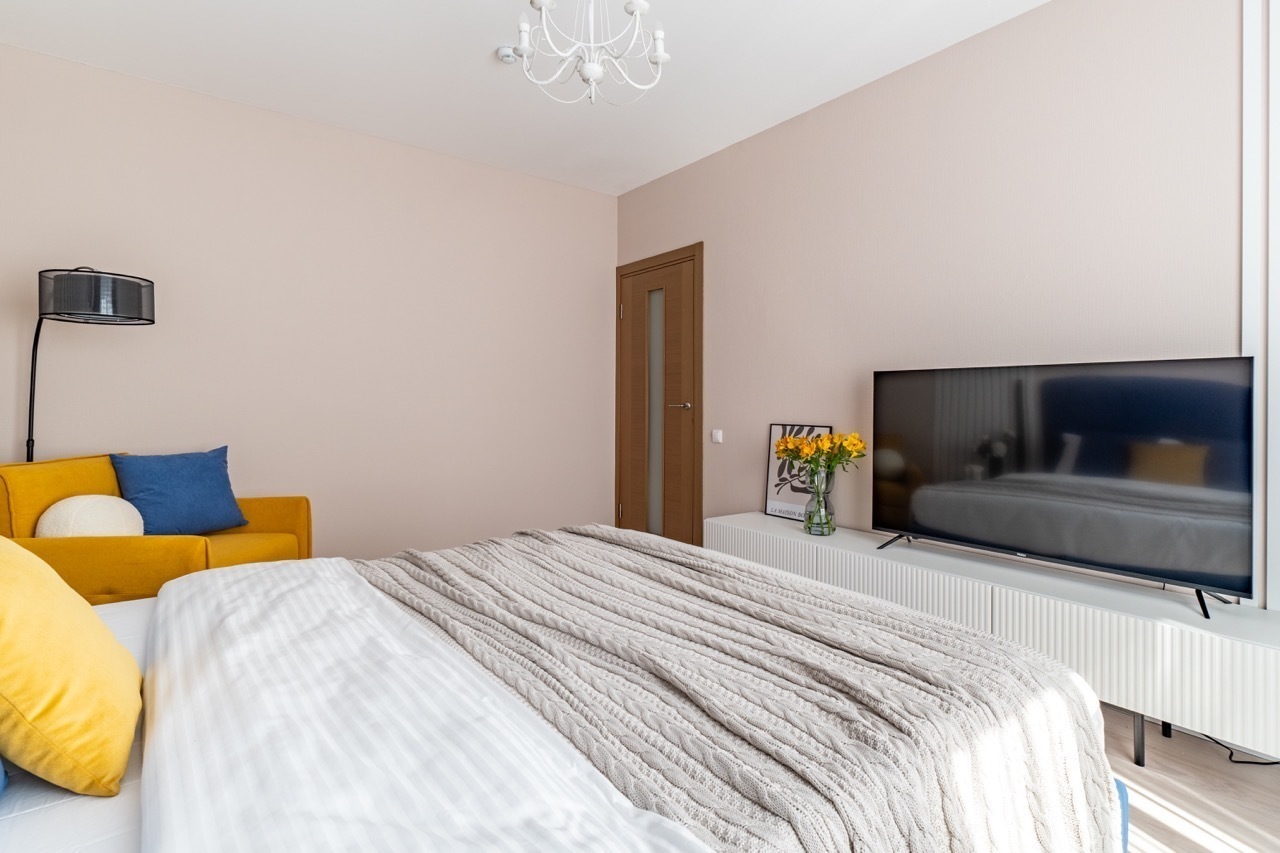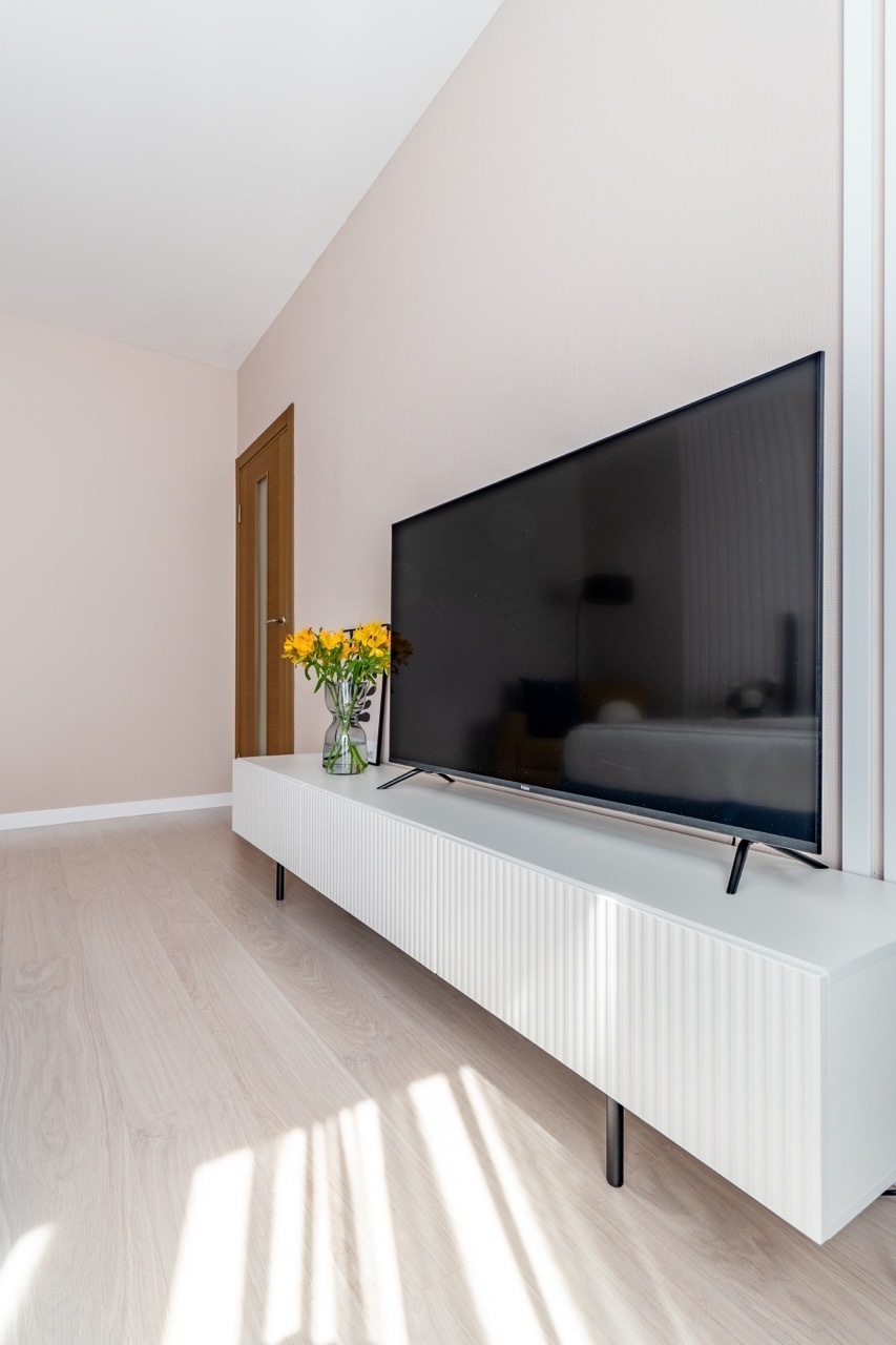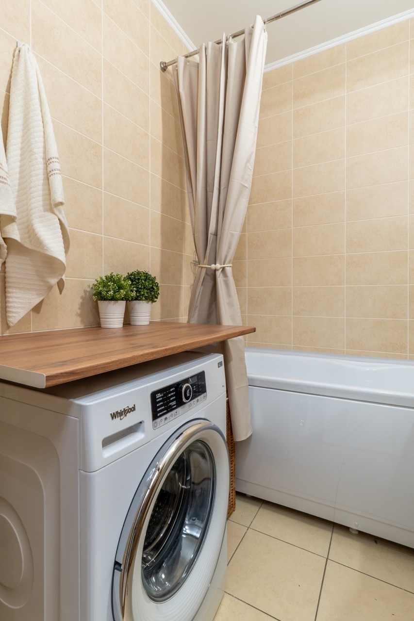 - Вся техника в вашем распоряжении: холодильник, стиральная машина, электрическая плита, СВЧ, телевизор со Smаrt ТV, чайник, пылесос, фен, роутер, утюг, сушилка и гладильная доска.
