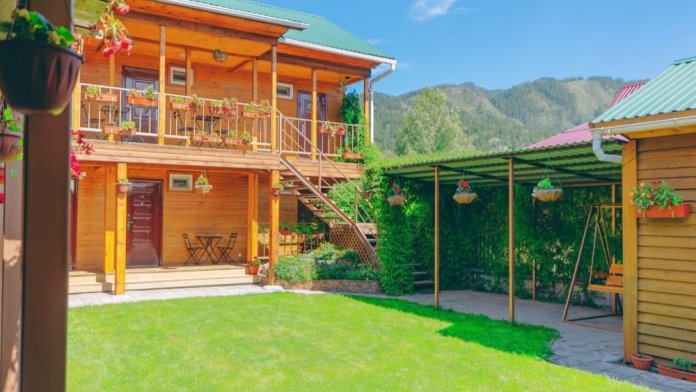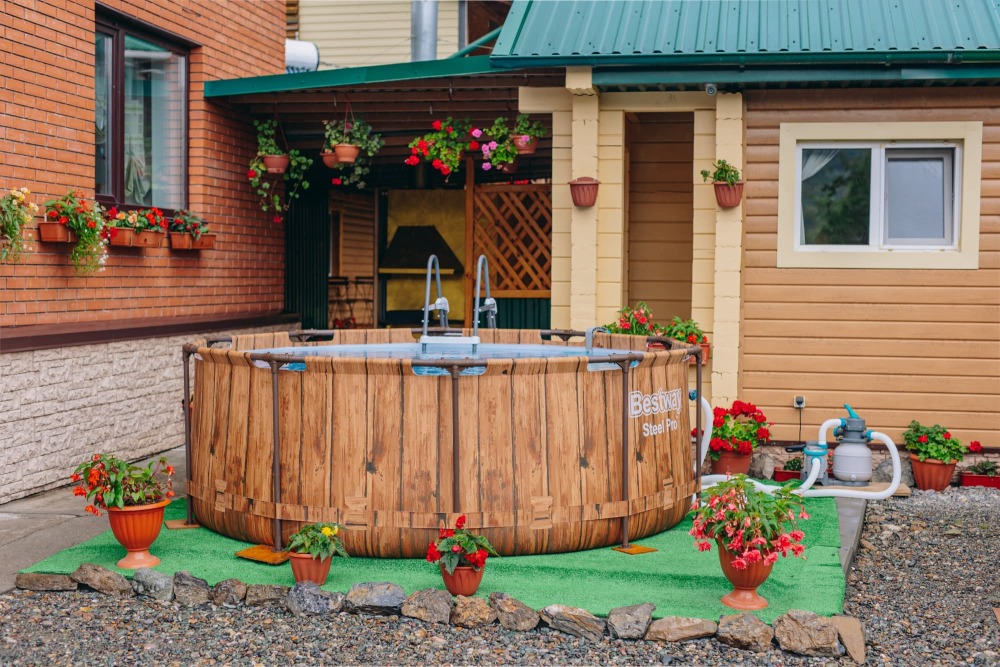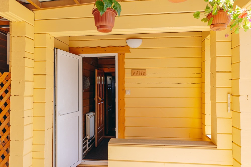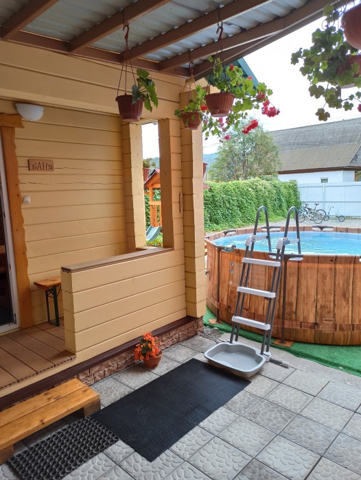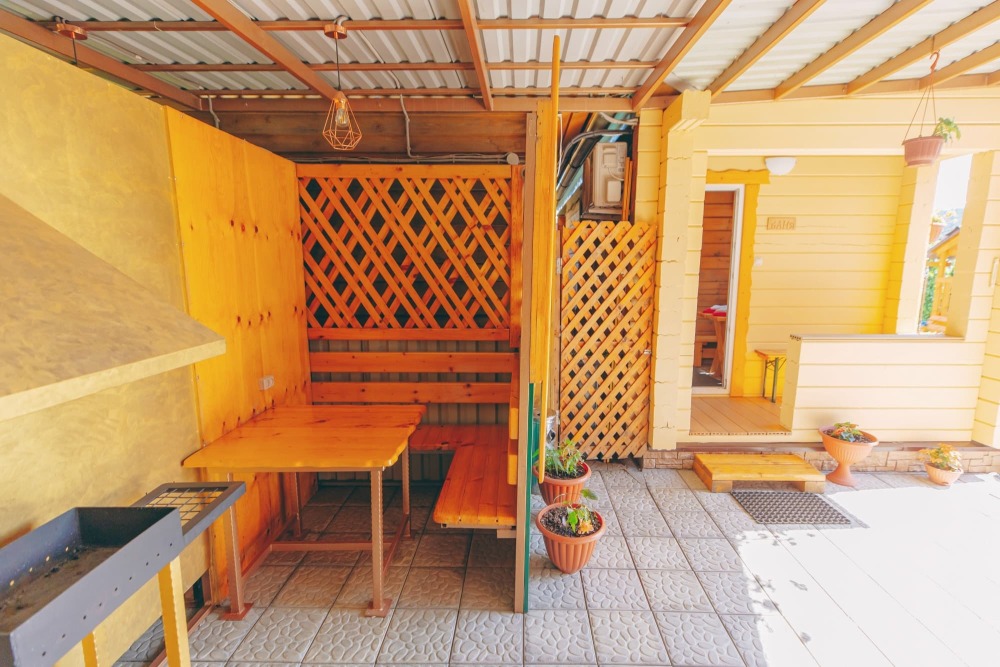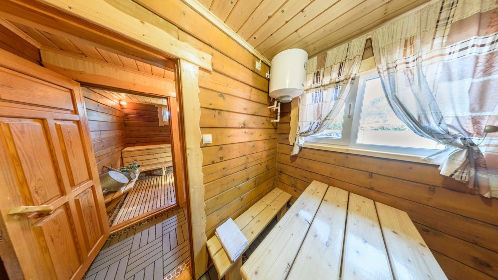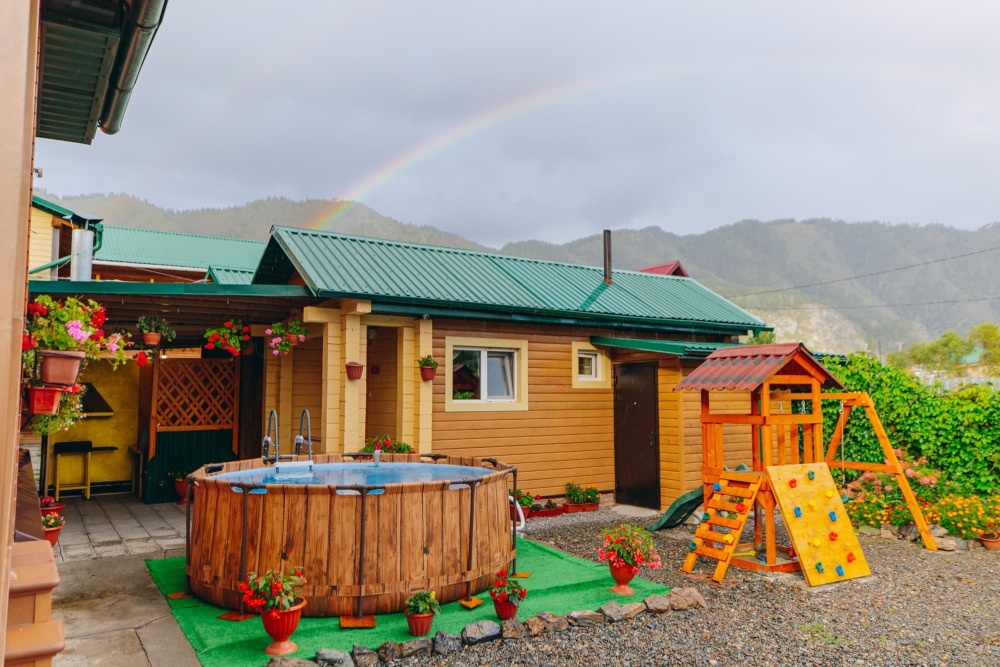 На территории кедровая баня, автостоянка, тёплая беседка с мангалом, кафе и детская площадка.