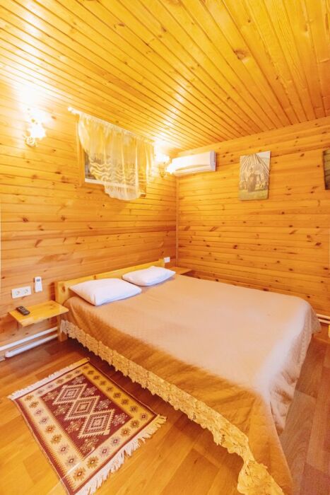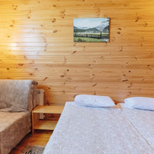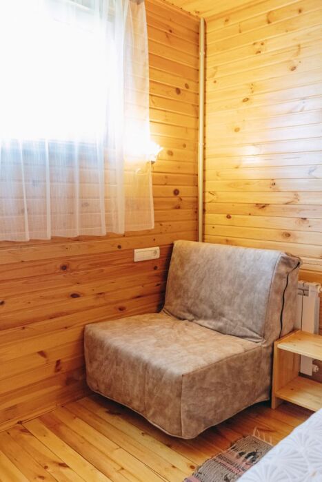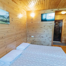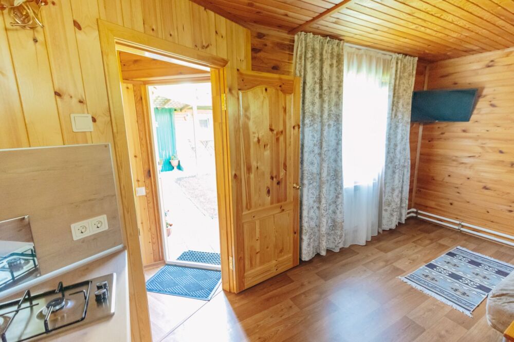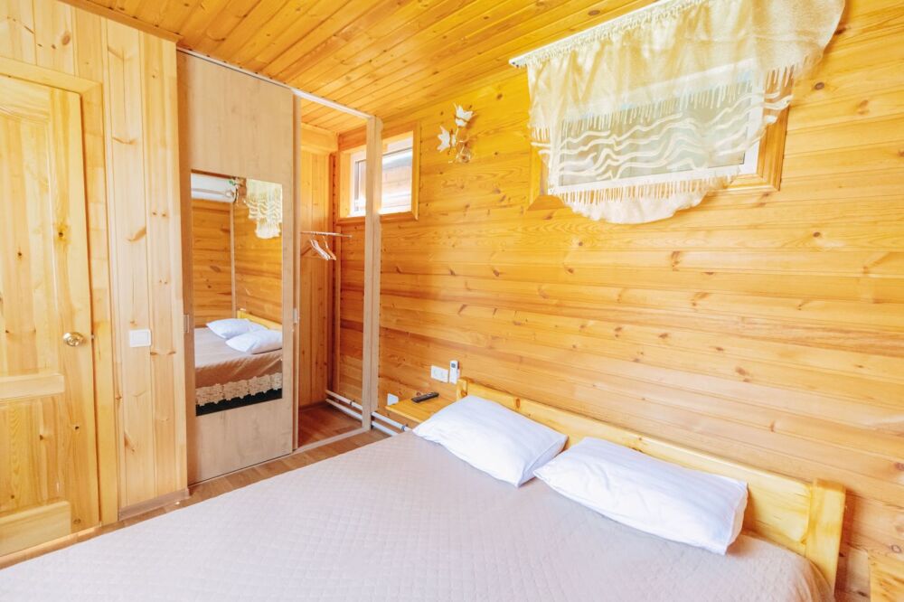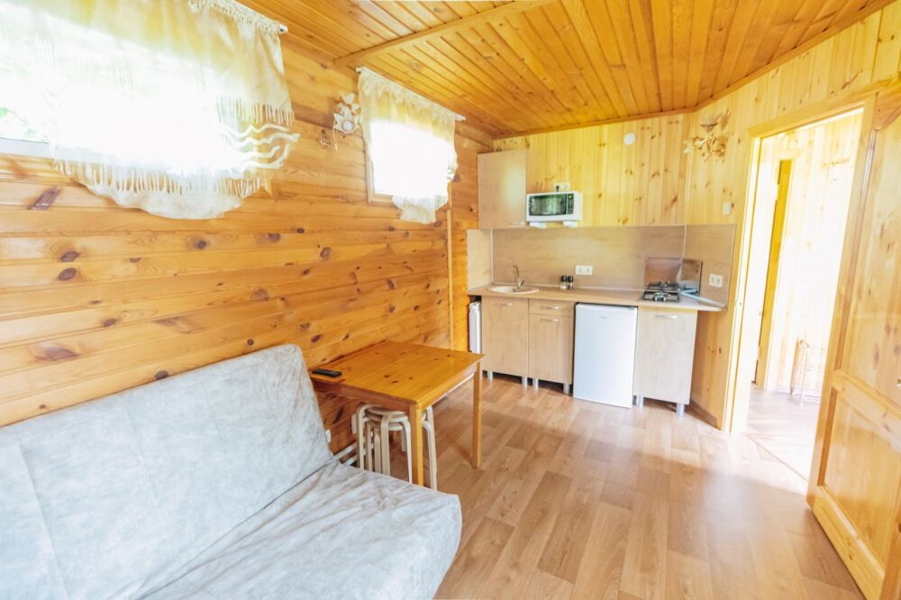 Домик отделан в светлых тонах натурального дерева. Есть все для комфортного отдыха. В одной комнате располагается 2-спальная кровать с ортопедическим матрасом, постельный шкаф с плечиками для одежды и зеркалом, телевизор. Во второй комнате: 2-спальный раскладной диван, кухонная зона с плитой, необходимой посудой, холодильником, микроволновой печью, столом и стульями, телевизор.