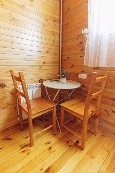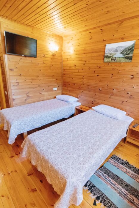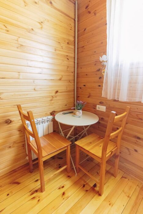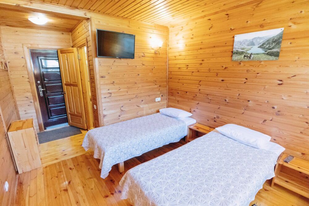 Номера выполнены в светлых тонах натурального дерева. В номере есть все для комфортного проживания: 2-спальная или 2 односпальные кровати с ортопедическими матрасами, белоснежное постельное бельё, прикроватный тумбочки, стол со стульями, деревянный комод, телевизор и чайник с приветственным набором чая.