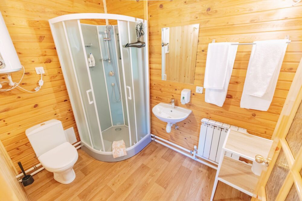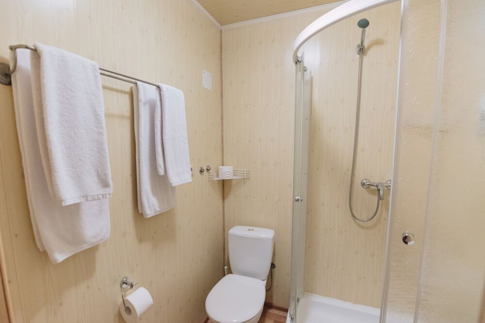 В санузле располагается душевая кабина с раздвижными стеклянными шторками, унитаз, раковина, тумбочка, туалетно-косметические принадлежности, белоснежные пушистые полотенца, фен.