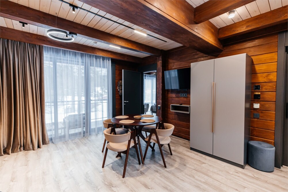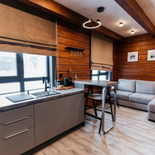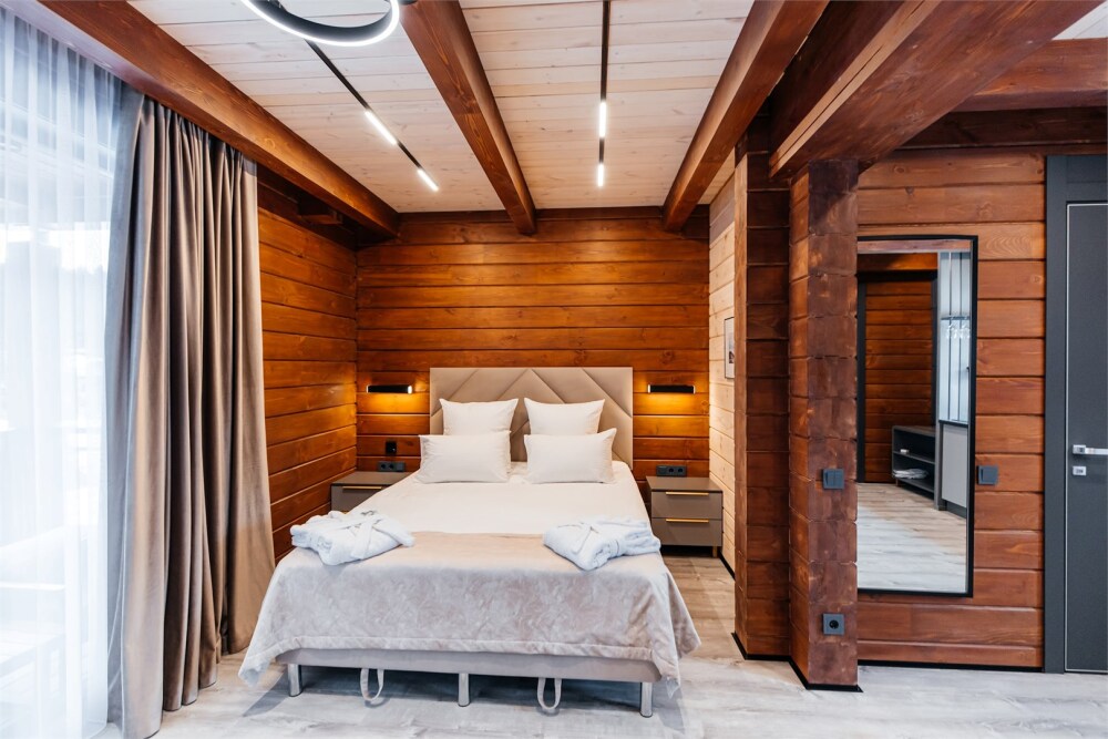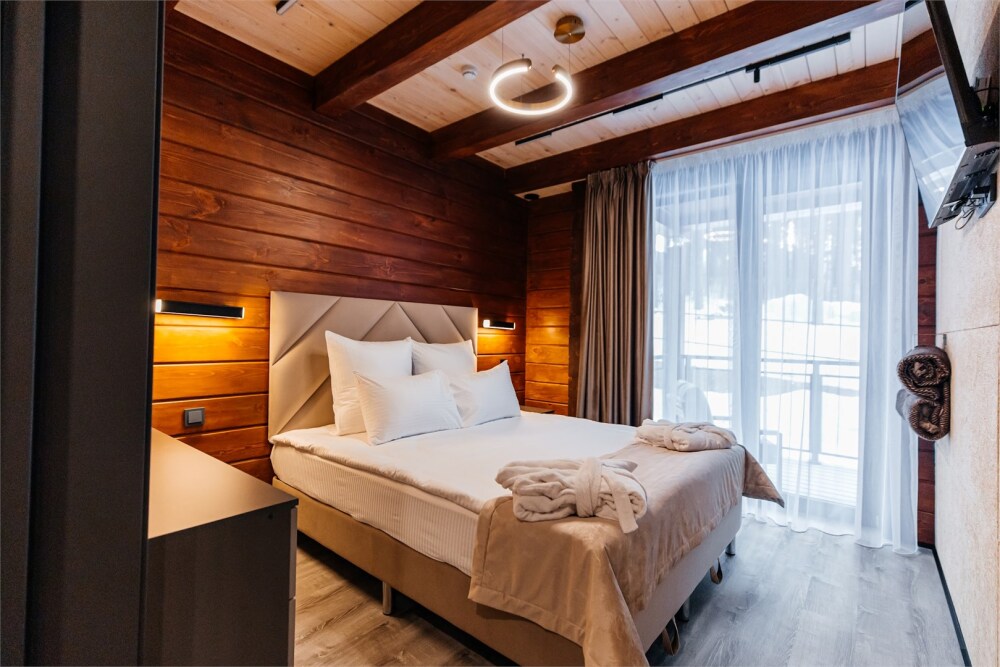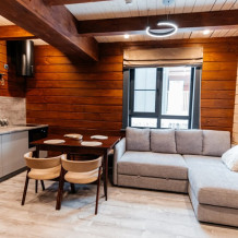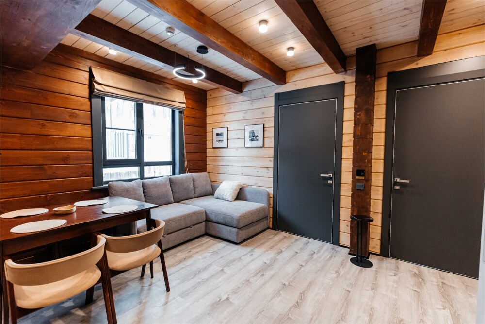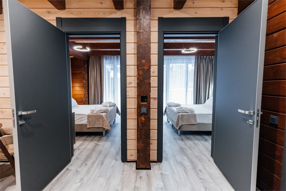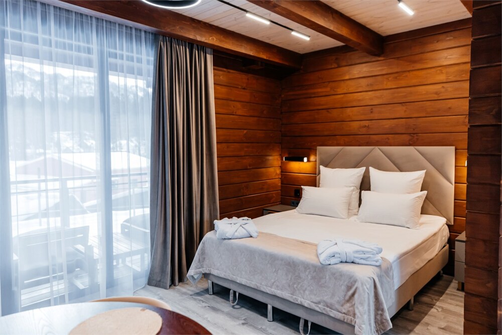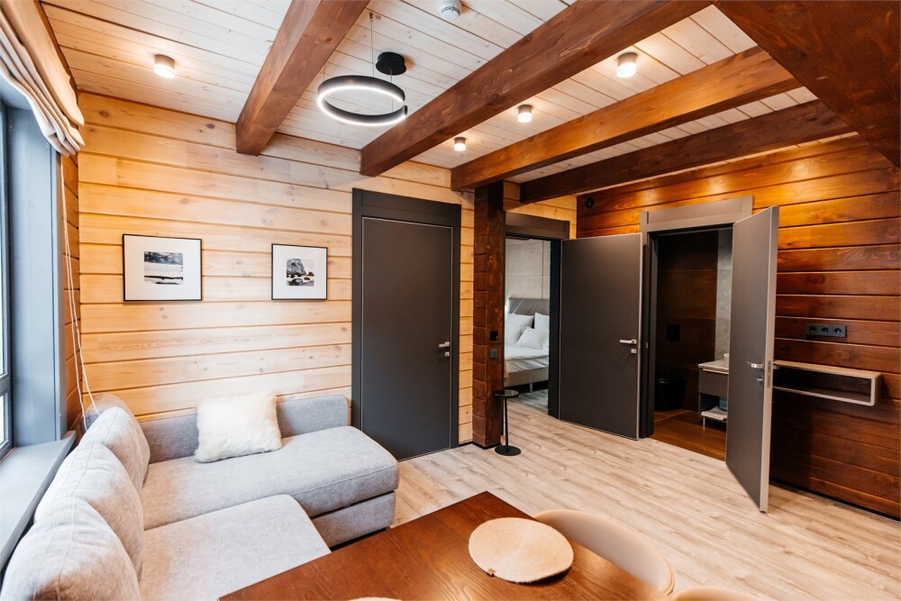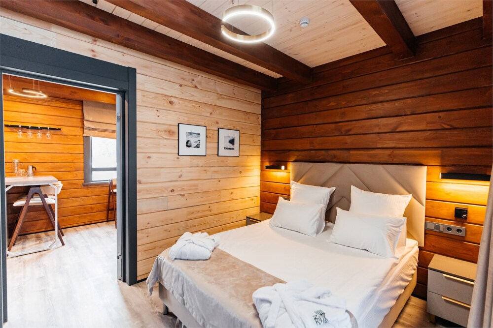 Номерной фонд отеля 16 номеров. К услугам гостей 1-, 2- и 3-комнатные апартаменты, которые станут идеальным местом для семейного отдыха, романтических путешествий и дружных компаний. Каждый из домов оснащен мебелью, изготовленной на заказ, что создает особый уют и атмосферу. Панорамные греющие окна Thermo Glass, созданные по инновационной технологии, обеспечат тепло даже в самые суровые морозы. Для комфортного семейного отдыха у нас предусмотрены все условия: хорошая шумоизоляция из экологичных материалов Green Board, а также возможность установить детскую кроватку по запросу.