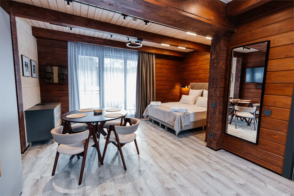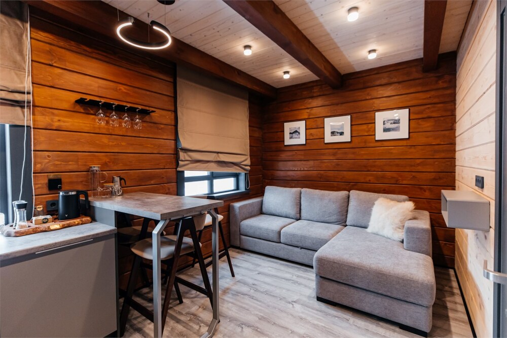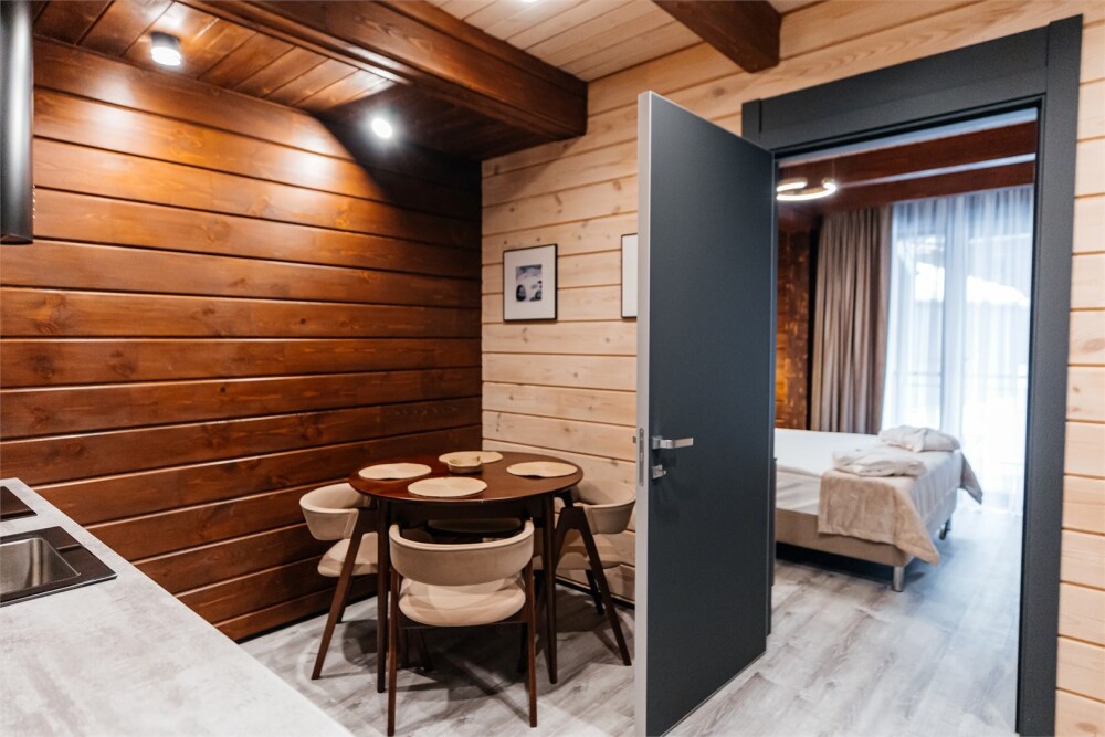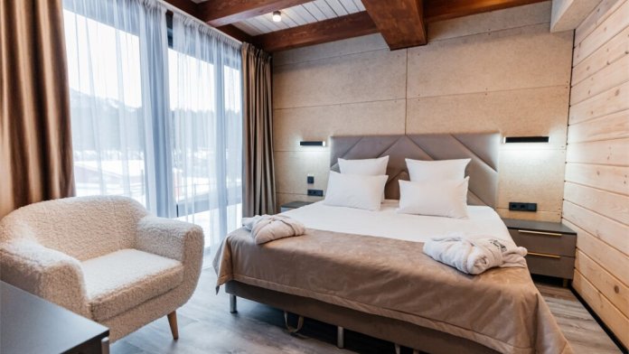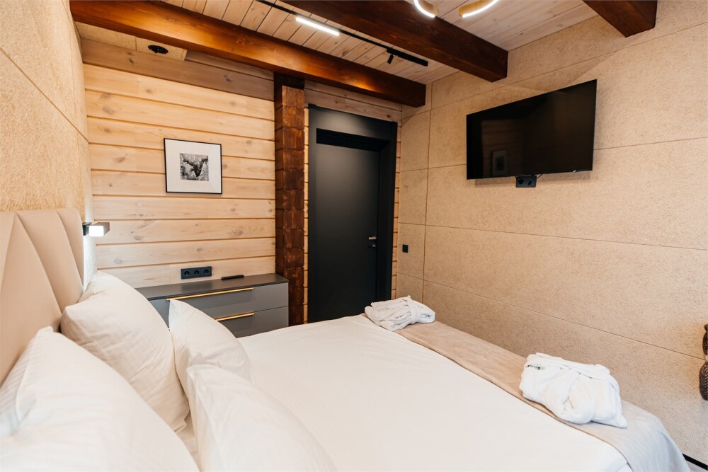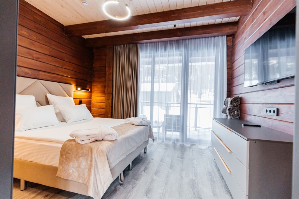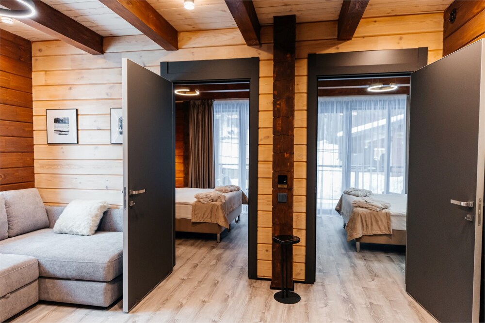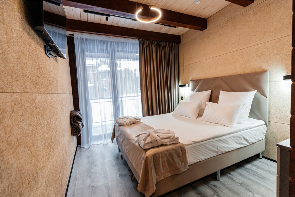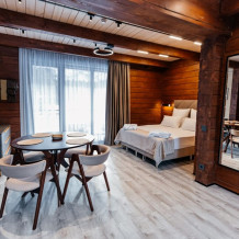 Номерной фонд отеля 16 номеров. К услугам гостей 1-, 2- и 3-комнатные апартаменты, которые станут идеальным местом для семейного отдыха, романтических путешествий и дружных компаний. Каждый из домов оснащен мебелью, изготовленной на заказ, что создает особый уют и атмосферу. Панорамные греющие окна Thermo Glass, созданные по инновационной технологии, обеспечат тепло даже в самые суровые морозы. Для комфортного семейного отдыха у нас предусмотрены все условия: хорошая шумоизоляция из экологичных материалов Green Board, а также возможность установить детскую кроватку по запросу.