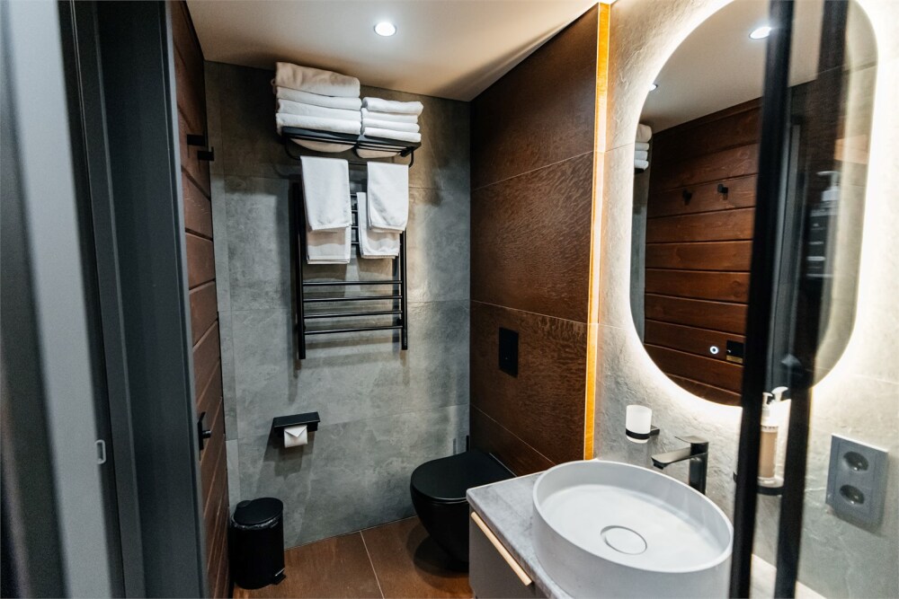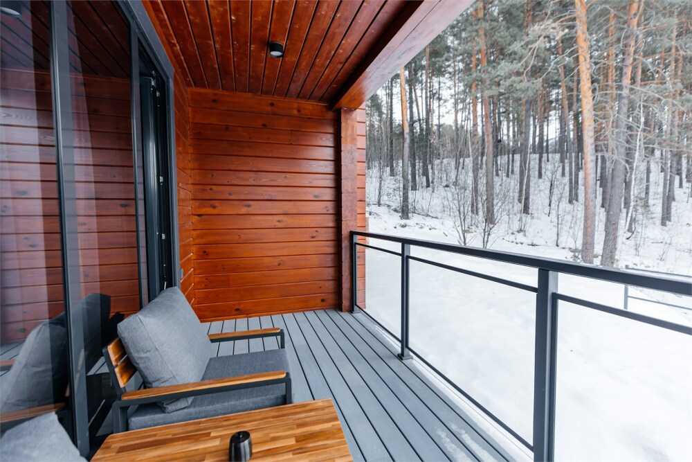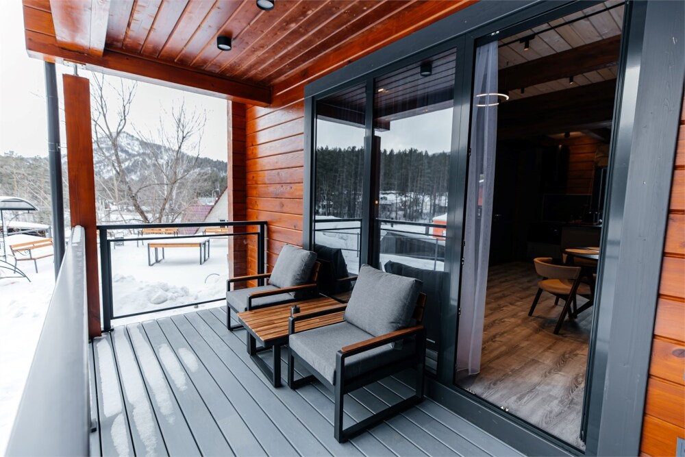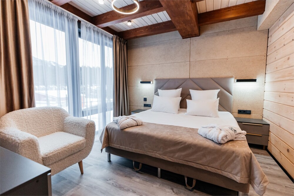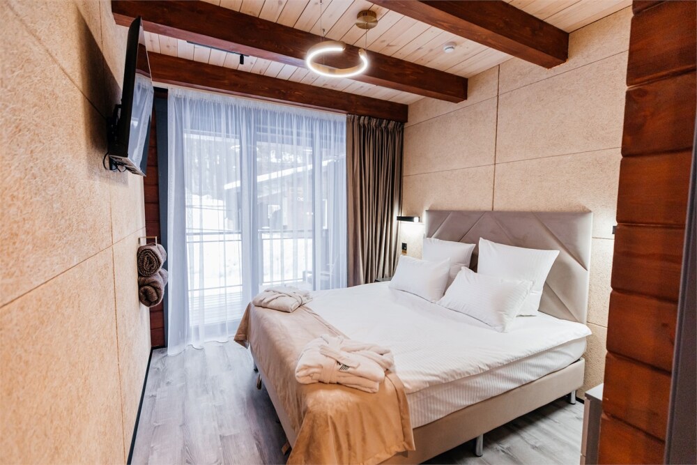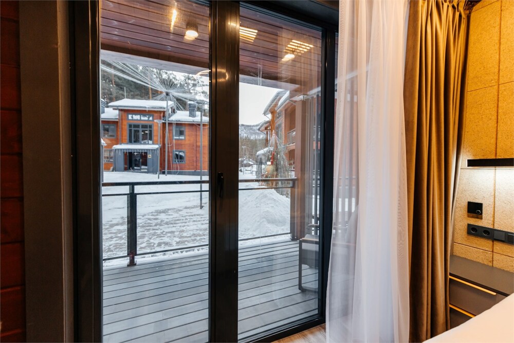 Просторный номер с большой террасой, где вам будет удобно пить свежесваренный кофе по утрам. Подогреваемые полы во всех помещения. Панорамные, инновационные греющие окна Thermo Glass которые создают уют даже в самые сильные морозы, представьте, как уютно лежать на кровати у окна, которое греет Вас. Современная система кондиционирования и вентиляции создают комфортный микроклимат. Мы уделили особое внимание шумоизоляции выполненной из экологичных материалов Green Board для Вашего приватного отдыха.