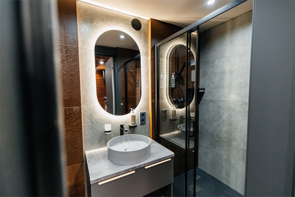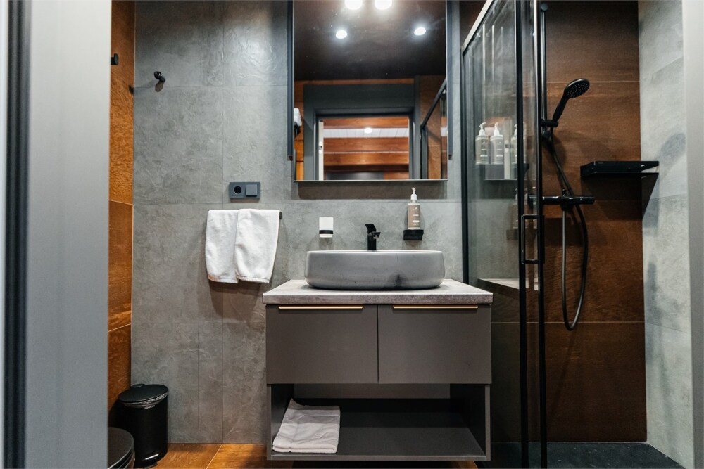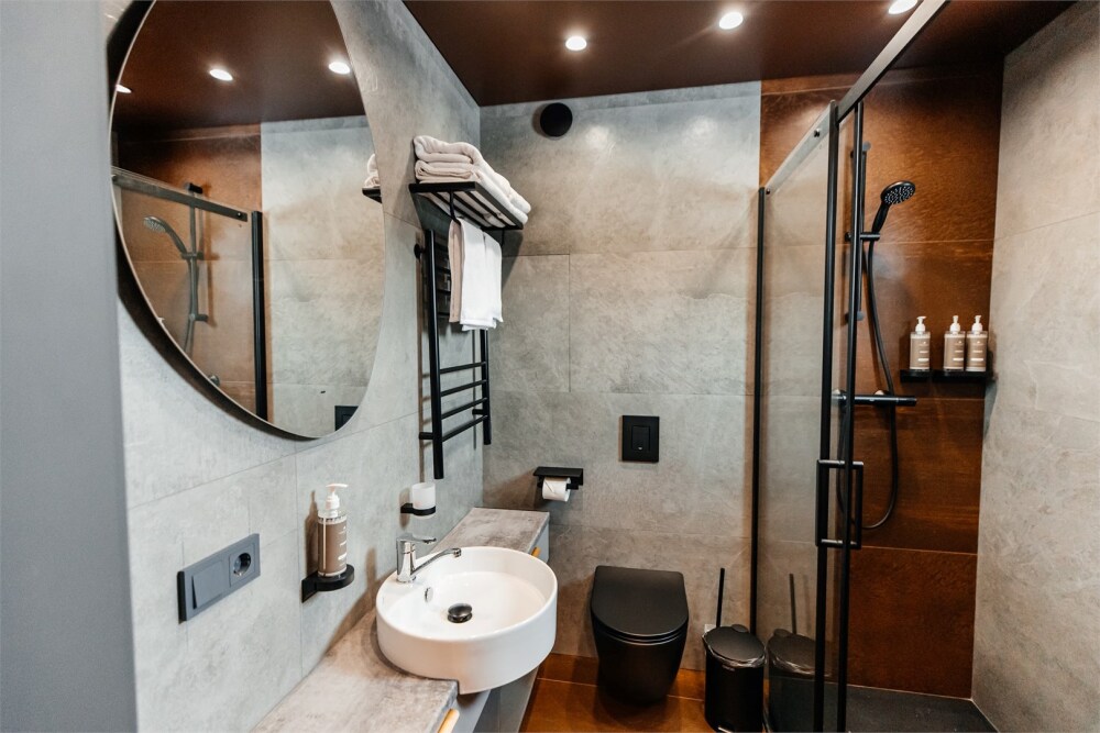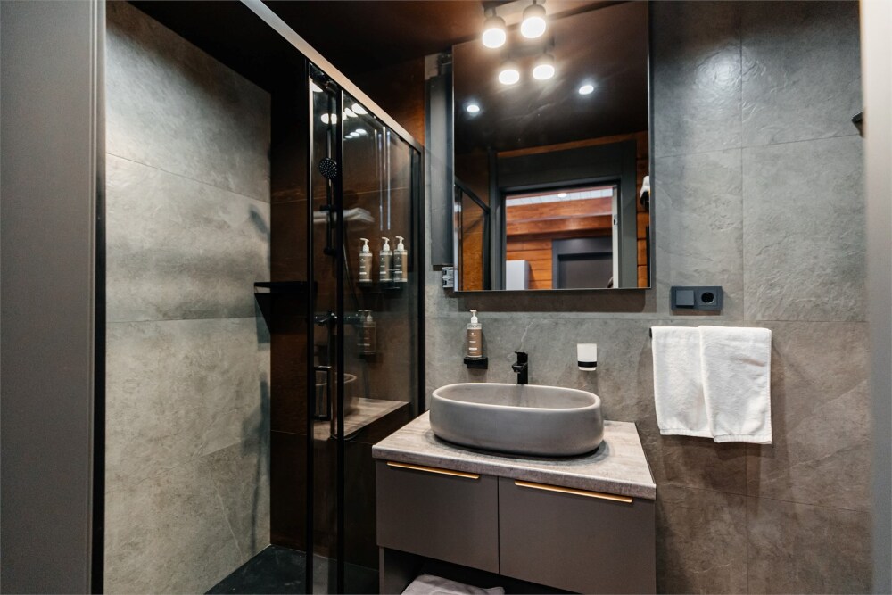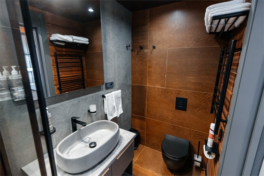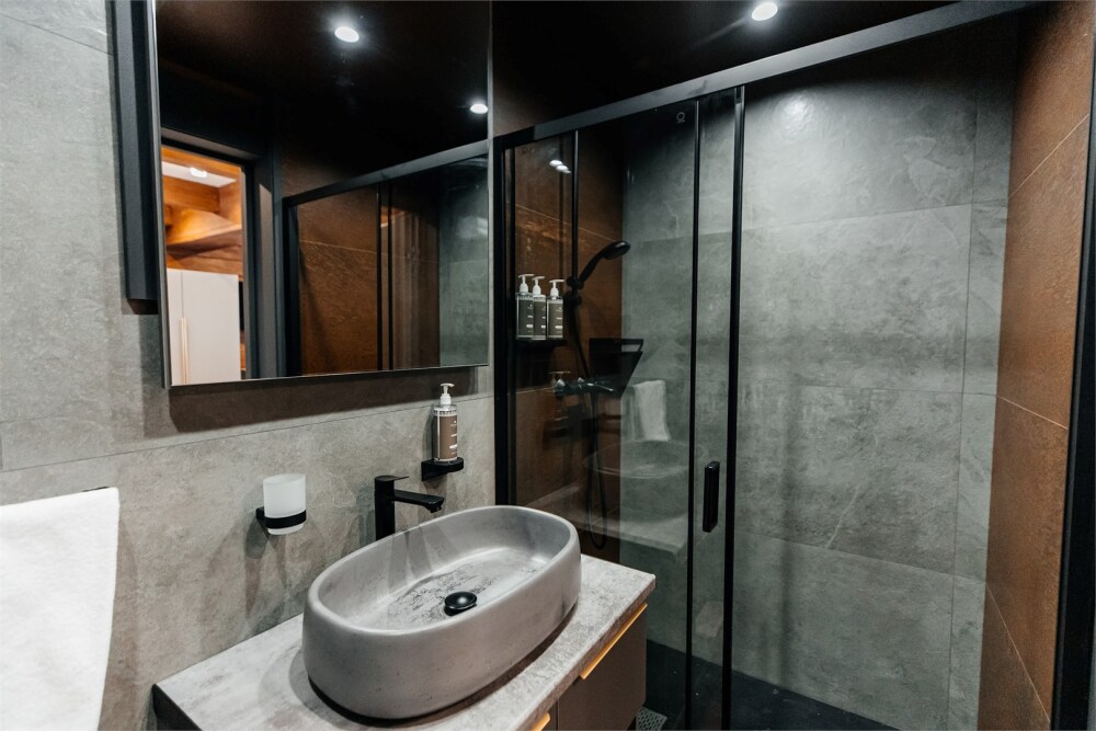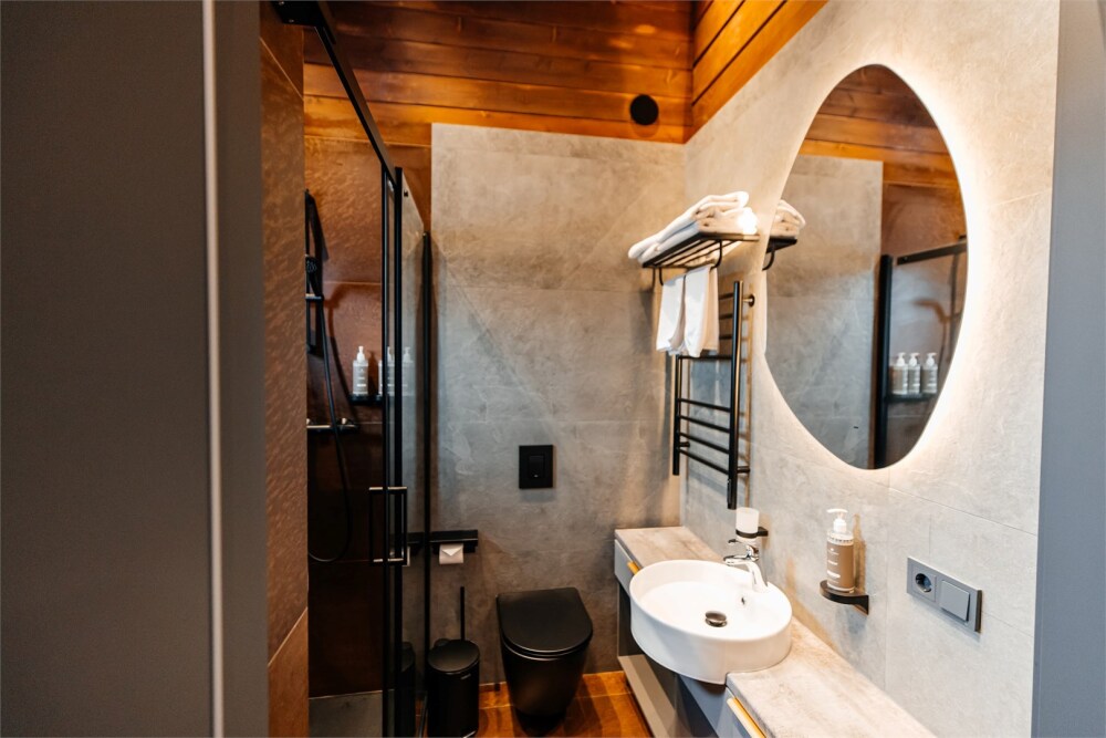 Просторный номер с большой террасой, где вам будет удобно пить свежесваренный кофе по утрам. Подогреваемые полы во всех помещения. Панорамные, инновационные греющие окна Thermo Glass которые создают уют даже в самые сильные морозы, представьте, как уютно лежать на кровати у окна, которое греет Вас. Современная система кондиционирования и вентиляции создают комфортный микроклимат. Мы уделили особое внимание шумоизоляции выполненной из экологичных материалов Green Board для Вашего приватного отдыха.
