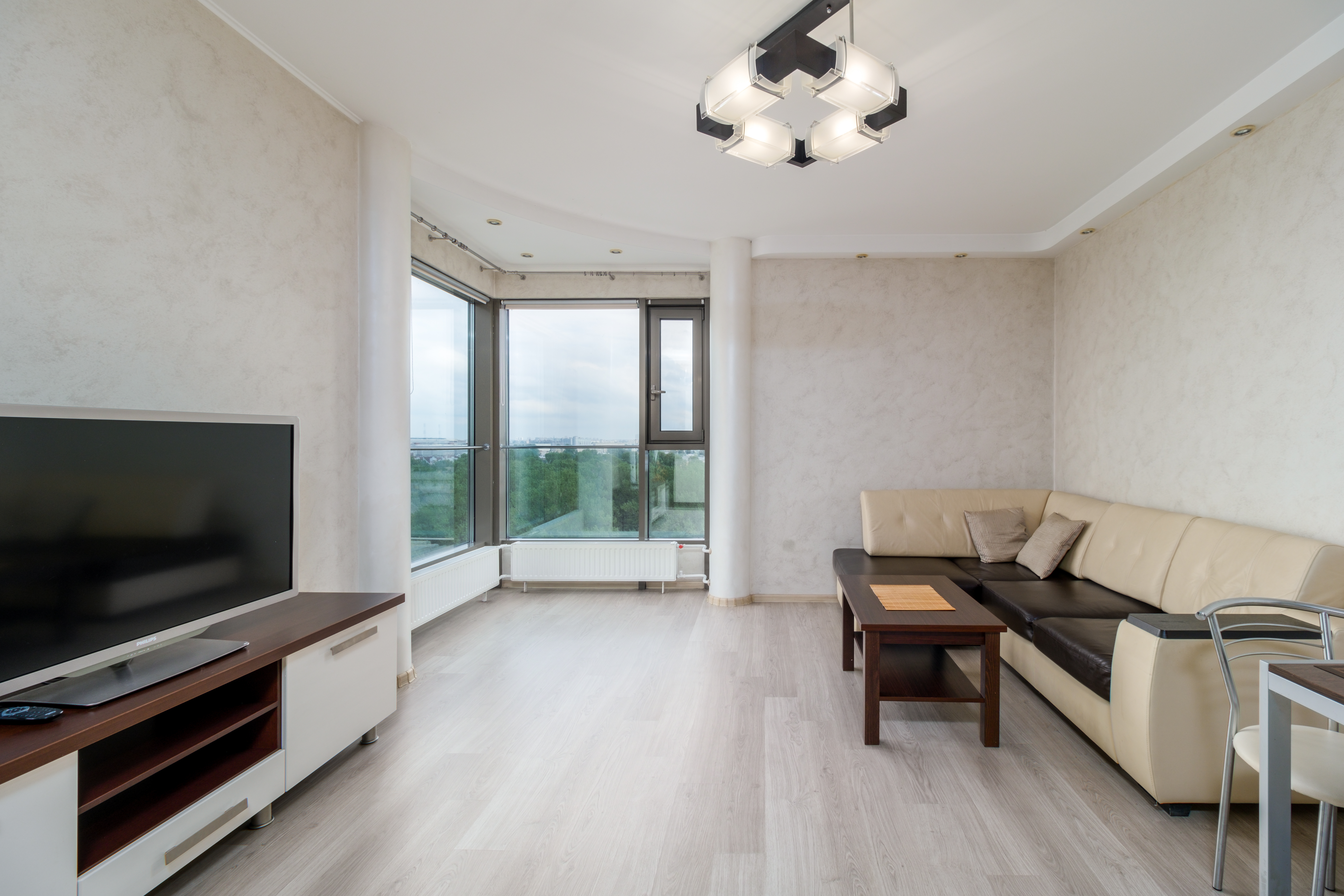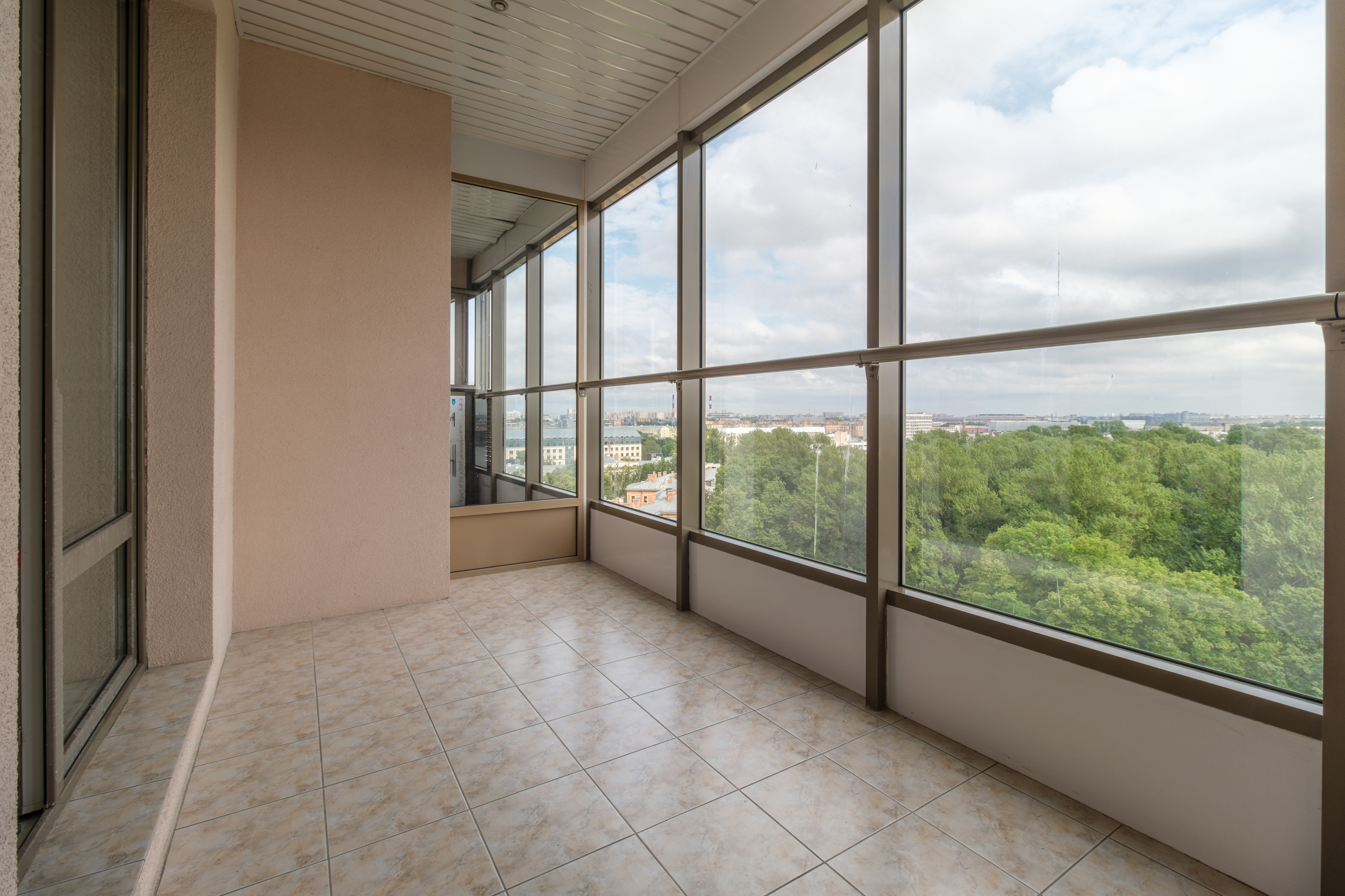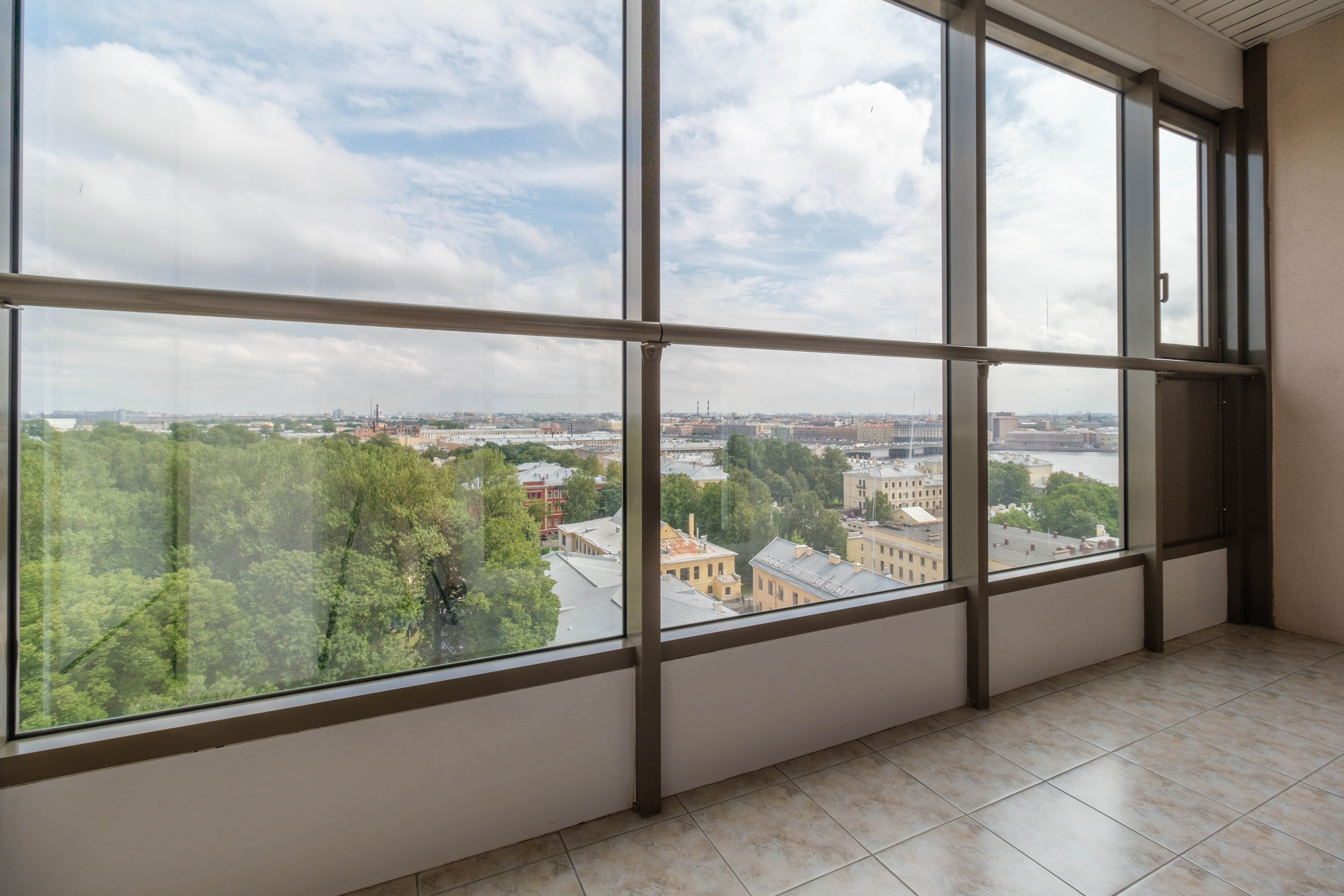 Светлая трехкомнатная квартира с панорамным видом на Неву и город, который доступен с двух балконов.