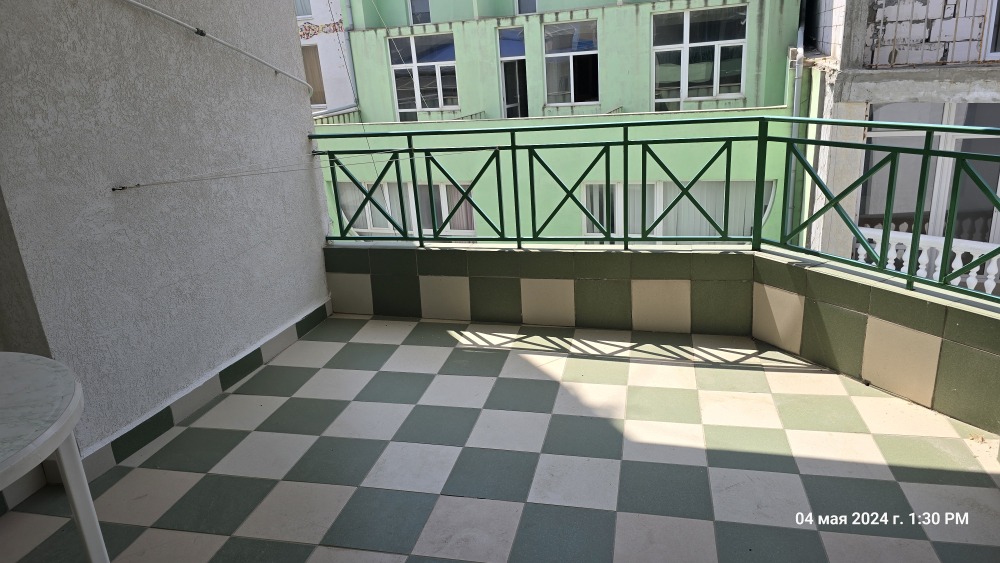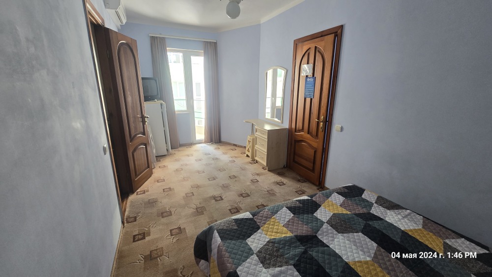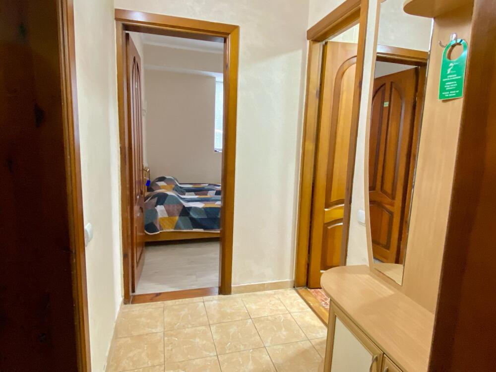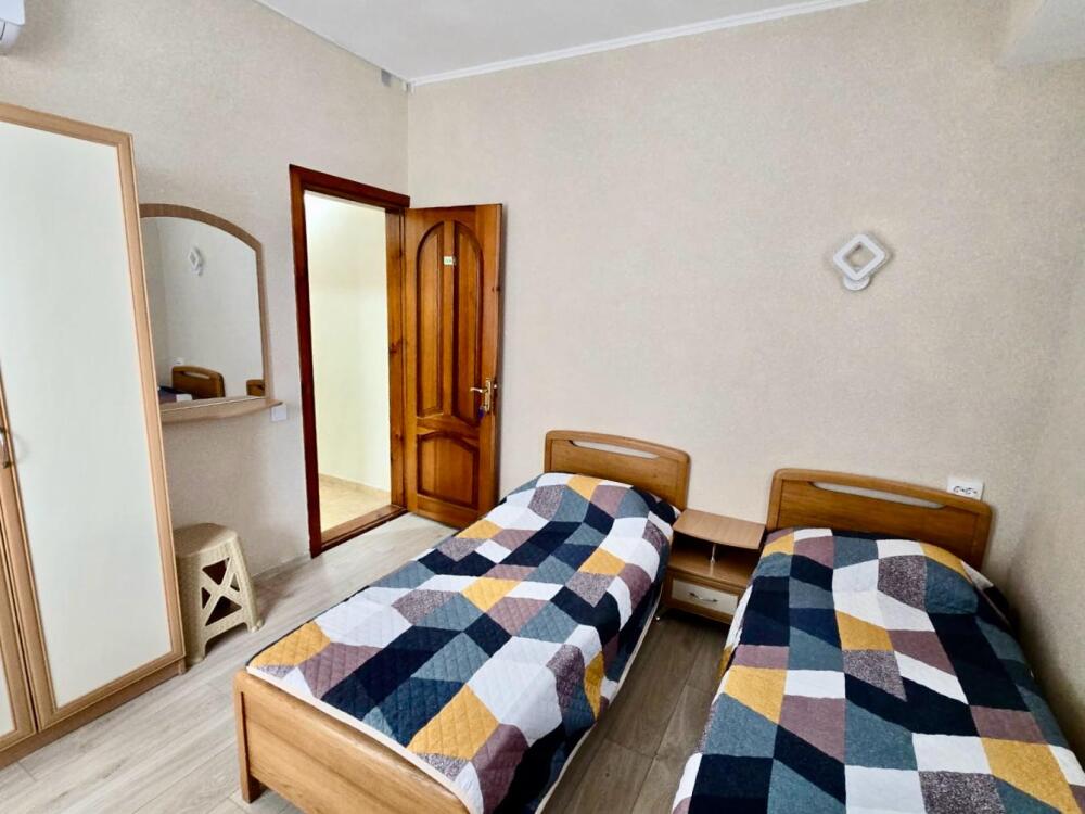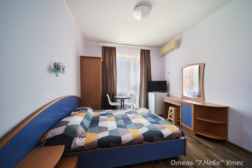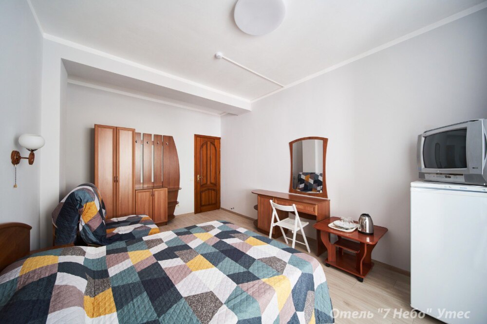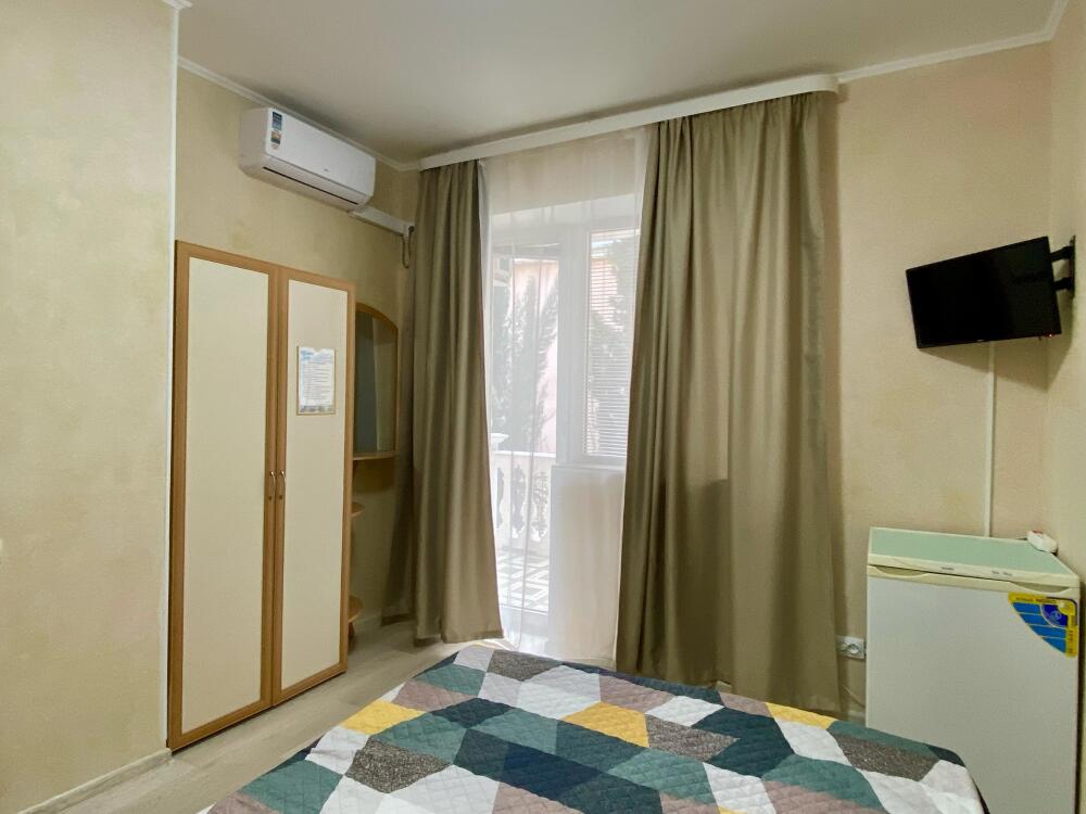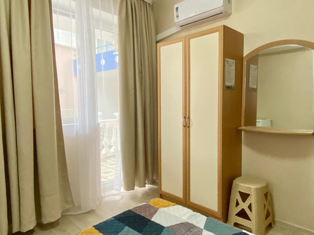 Номер семейный -двухкомнатный номер,с видом на соседнее здание с одним санузлом на две комнаты. Общая площадь номера – 40 м.кв. Номер разделен на две отдельные комнаты. В каждой комнате двуспальная или две полуторные кровати ,шкаф,, трюмо, , кондиционер, телевизор, холодильник. Также в комплектацию номера входит чайник столовые приборы, чашки, тарелки и фен. *Имеется вариант размещения до 6 человек, с дополнительными полуторными кроватями, уточняйте при бронировании. Отель не гарантирует номер с балконом! Смена постельного белья через каждые пять дней, смена полотенец раз в три дня.