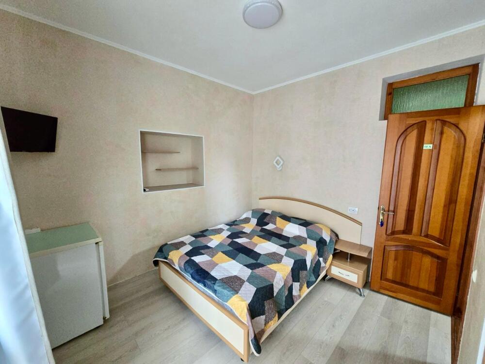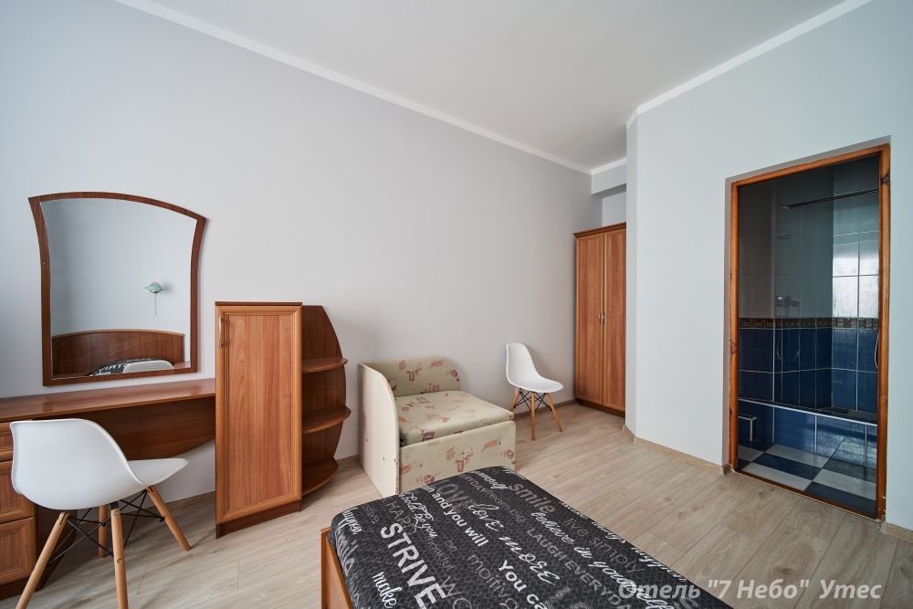 В номере одна двухместная кровать,, шкаф, стулья, трюмо, санузел с душем в каждом номере.