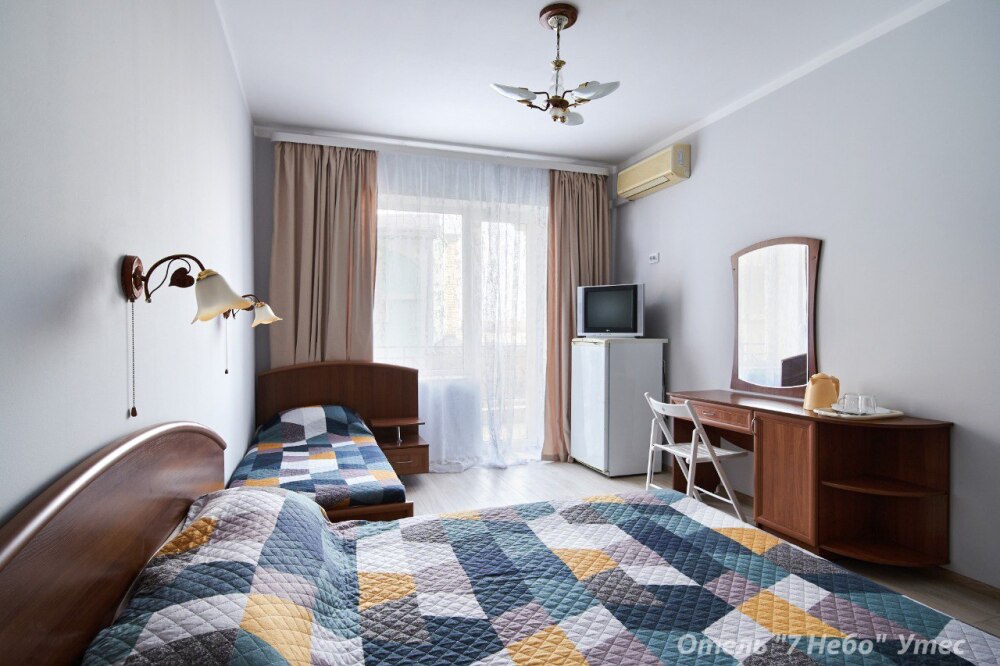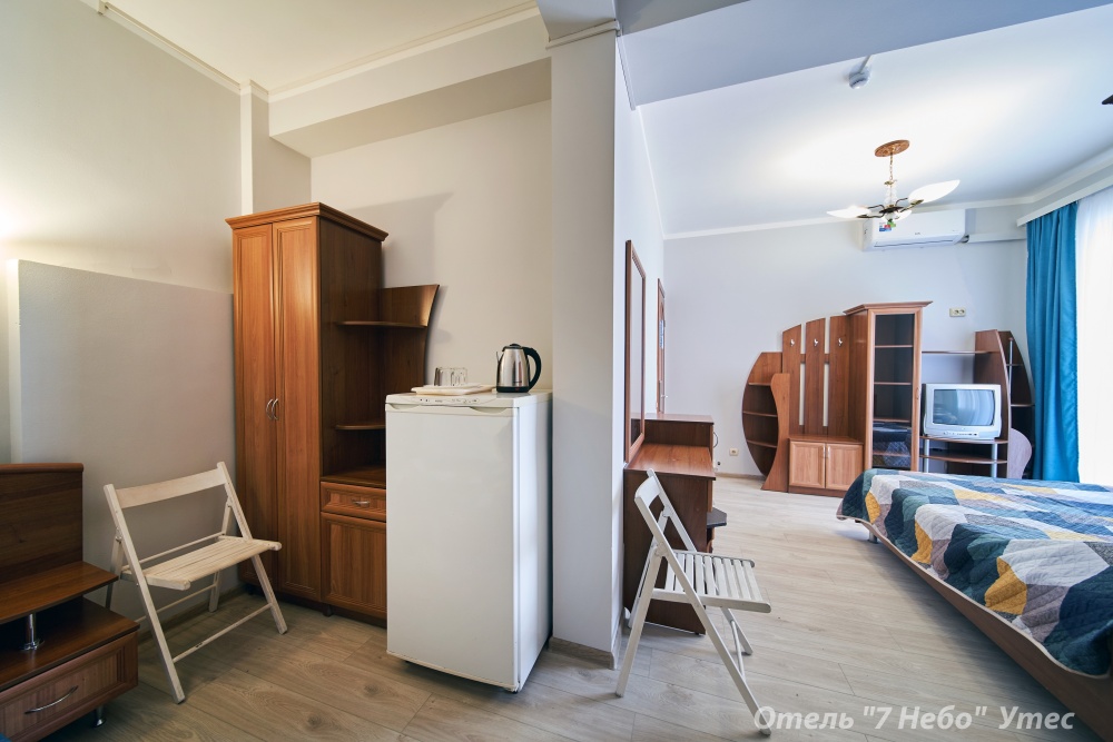 Номер оснащен кондиционером телевизором, холодильником, феном и чайником, столовые приборы, чашки, тарелки.