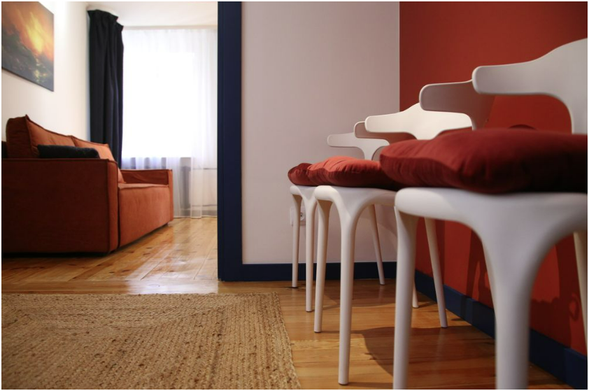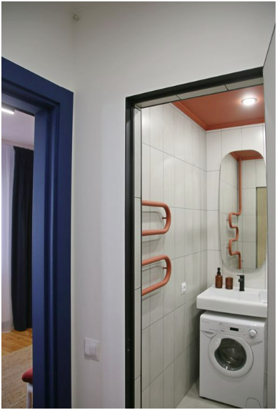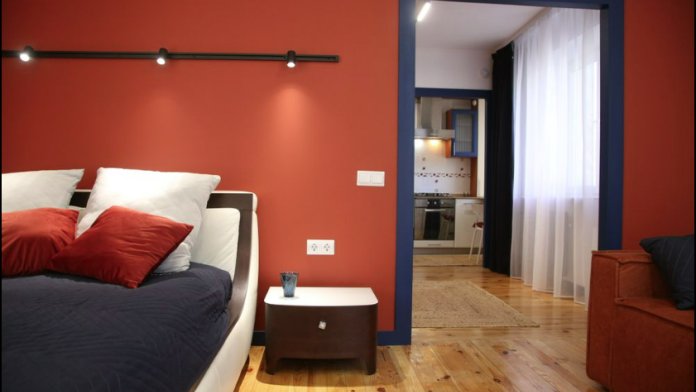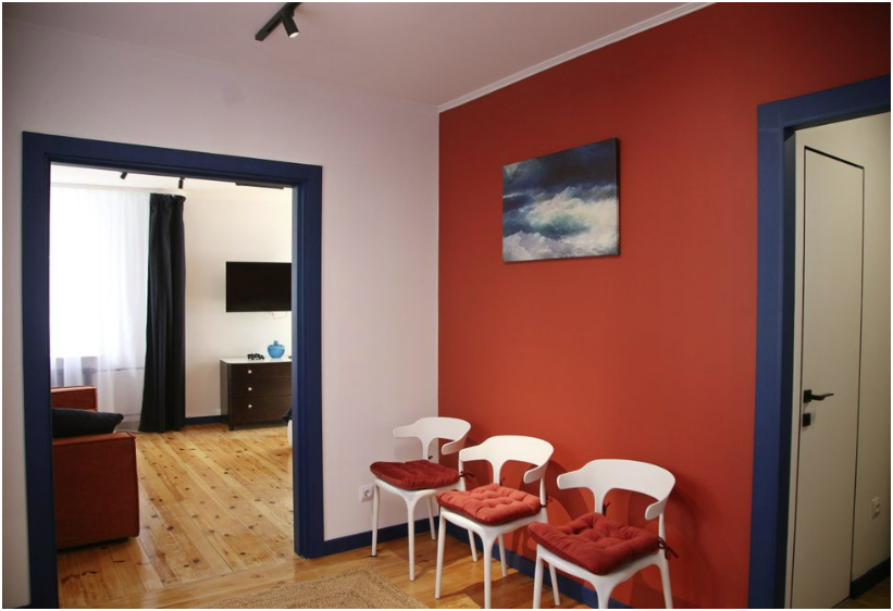 Терракотовый и темно синий - вот 2 основных цвета в интерьере этих апартаментов.