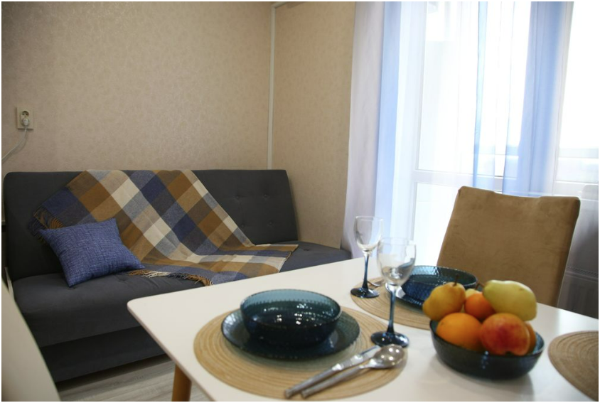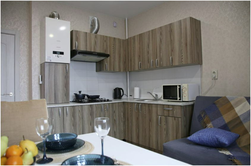 Принесенные же «вкусняшки» можно употребить в апартаментах за столом расположившись на удобных стулья, посуда и бокалы расположены на расстоянии вытянутой руки на кухне.