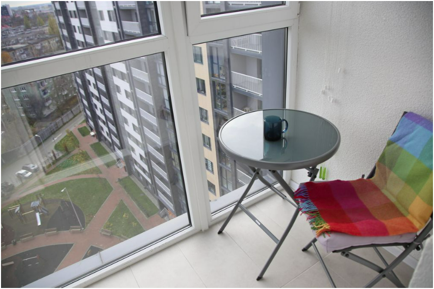 Чайник и кофеварка позволит приготовить утром бодрящий горячий напиток, а маленький французский столик со стульчиком на балконе позволит расположится в утренней тиши с чашечкой кофе или чая.