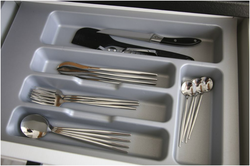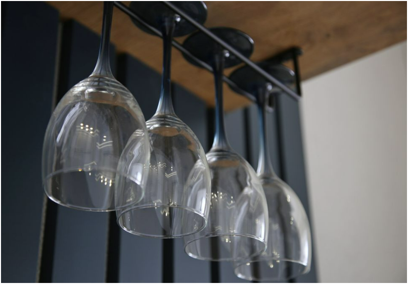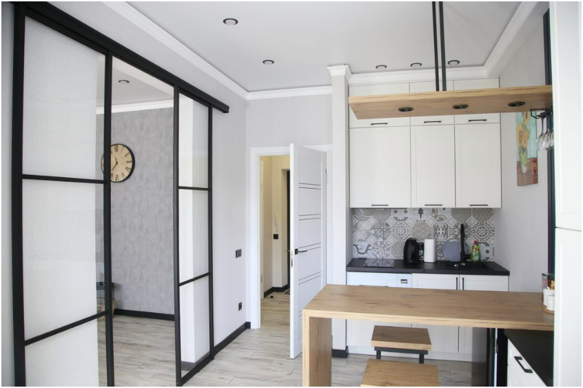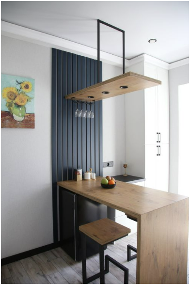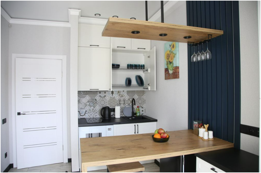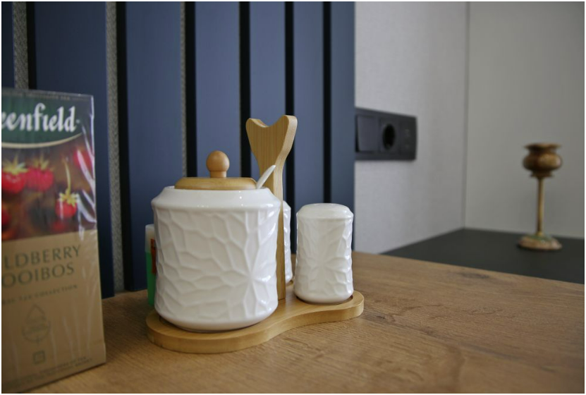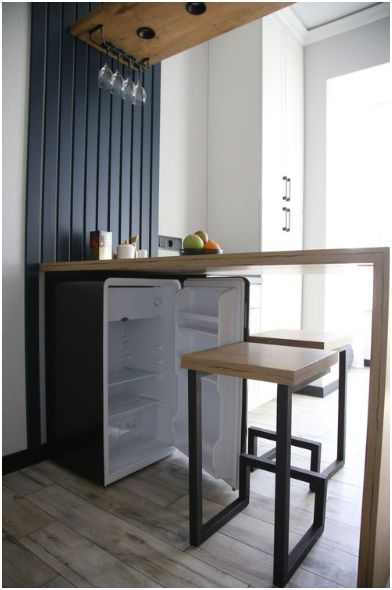 Принесенные «вкусняшки» можно употребить в апартаментах за столом в виде барной стойки и удобных стулья, посуда и бокалы расположены на расстоянии вытянутой руки.